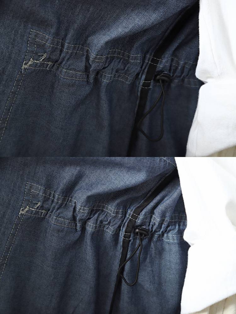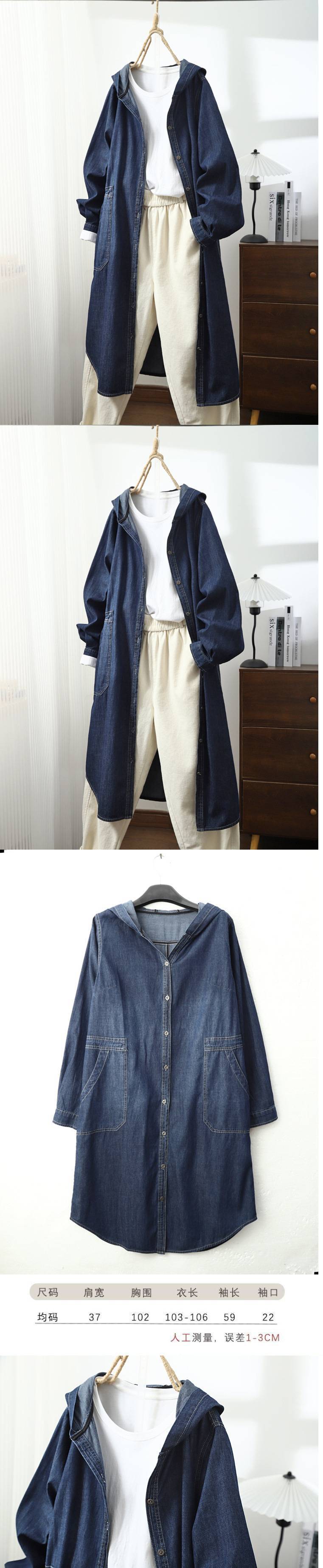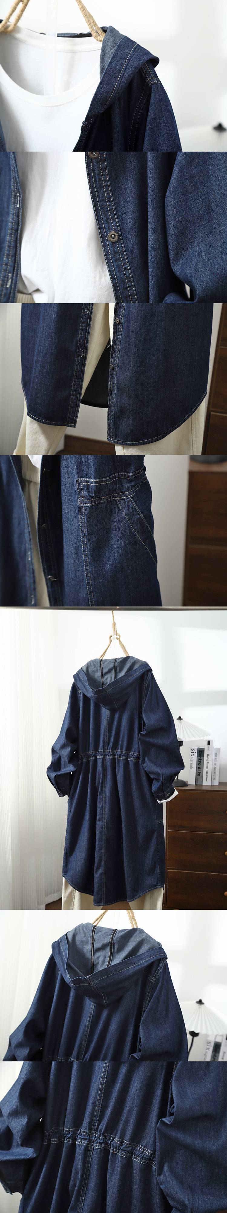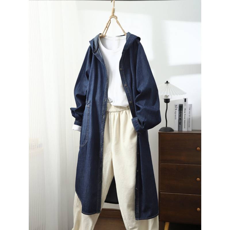 봄 2025 새로운 싱글 브레스트 중간 길이 긴 소매 후드 코트 여성 캐주얼 딥 데님스토어 가기