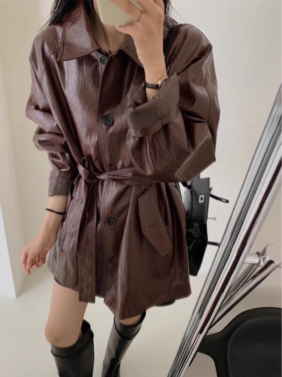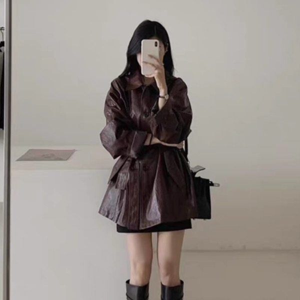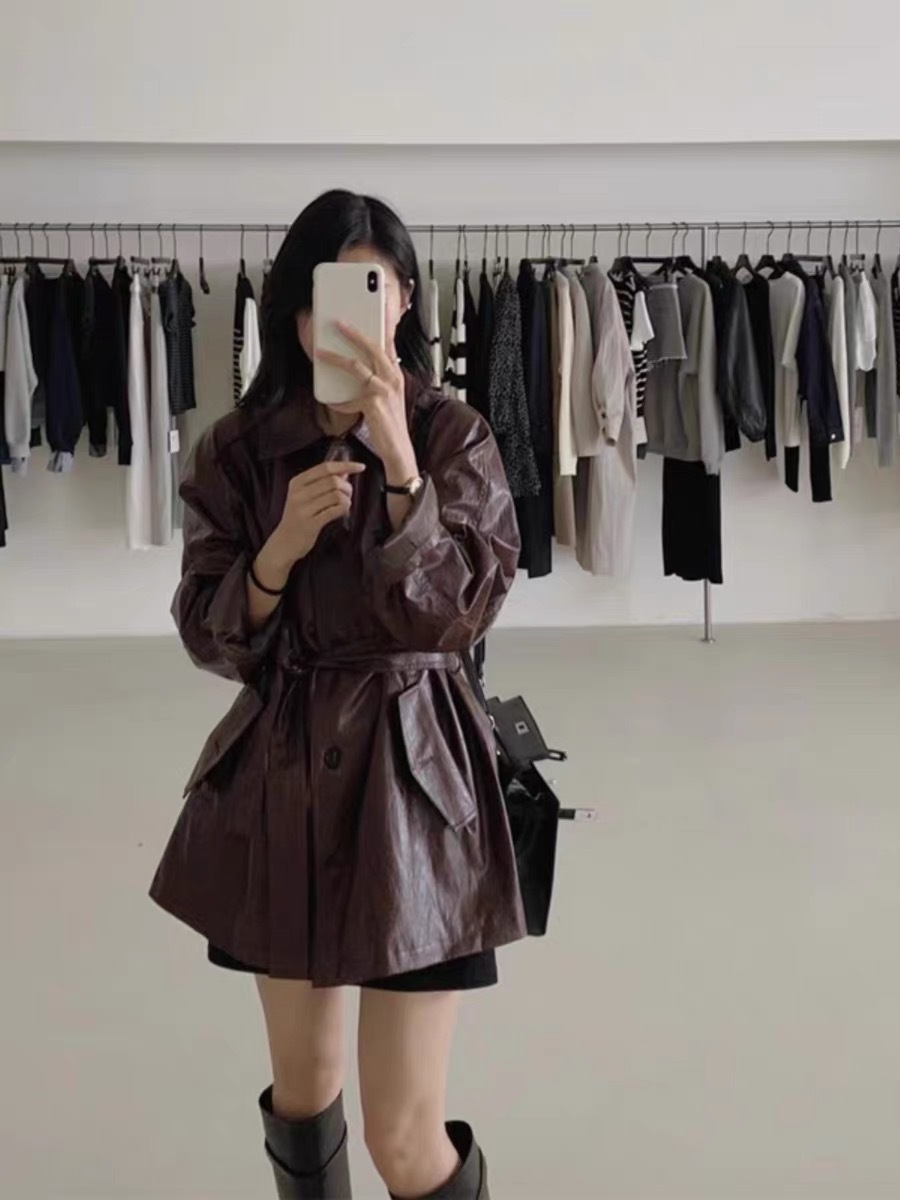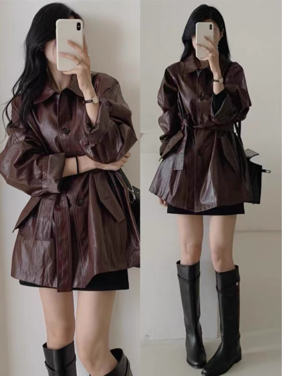 하이 엔드 센스 기질 튀김 거리 시대-긴 PU 코트 여성의 2025 년 봄 새로운 프랑스 작은 조수 감소스토어 가기