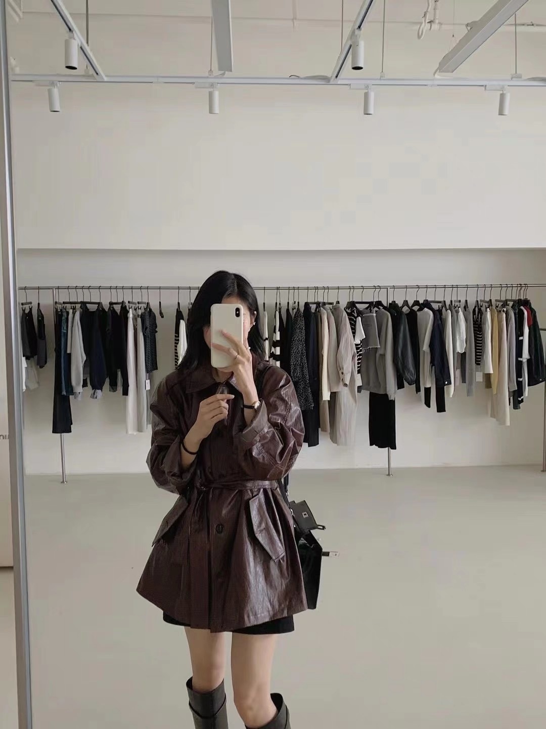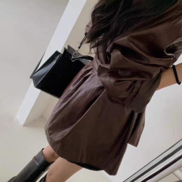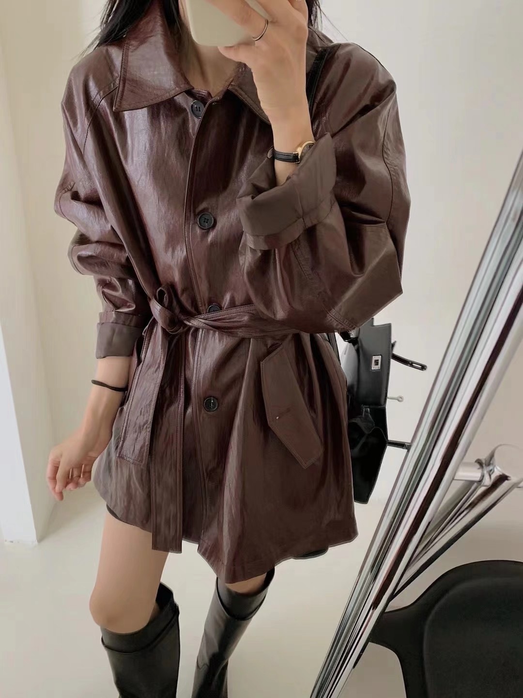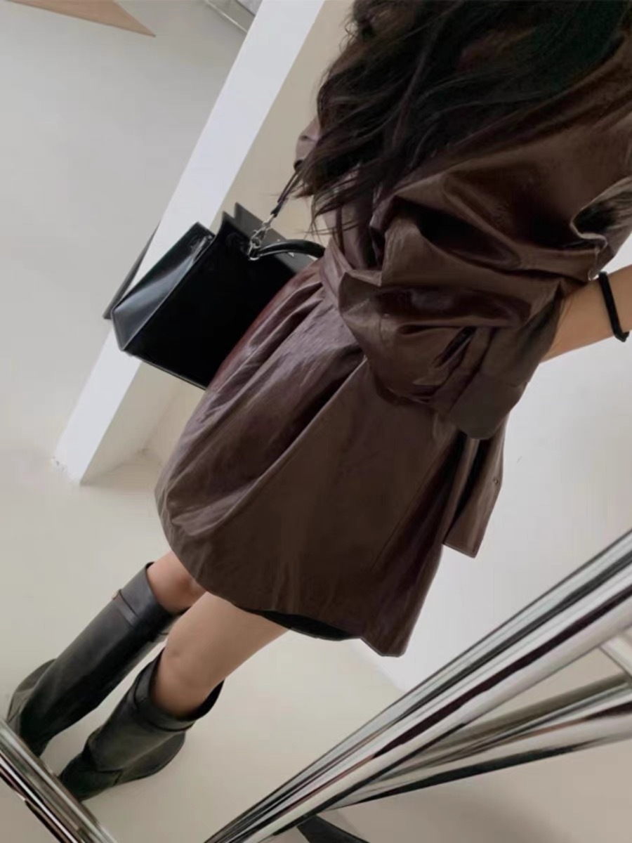하이 엔드 센스 기질 튀김 거리 시대-긴 PU 코트 여성의 2025 년 봄 새로운 프랑스 작은 조수 감소스토어 가기