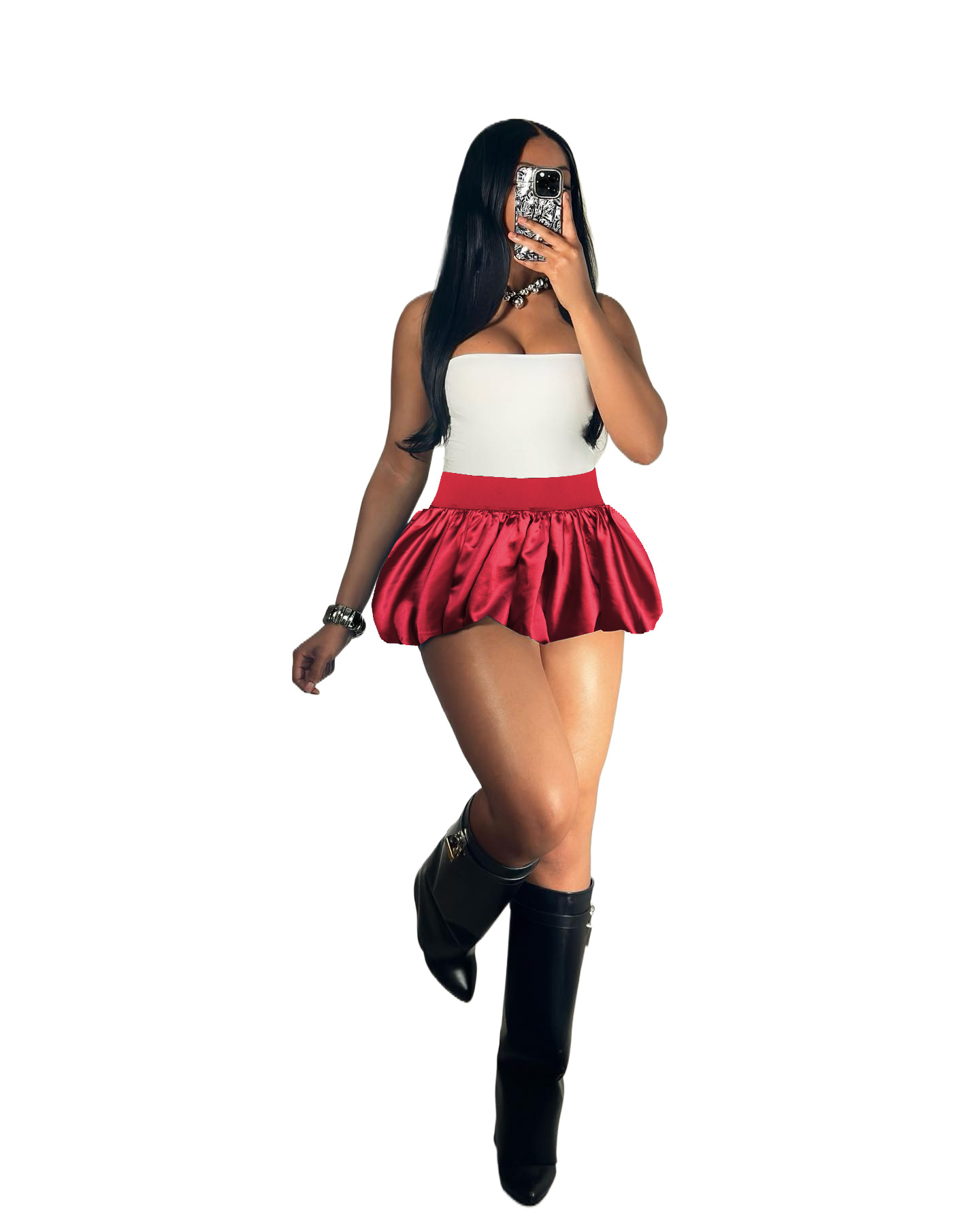 D10088 새틴 글로우 미니 플리츠 스커트 버블 버블 스커트 솔리드 컬러 스트레치 허리 미니 스커트스토어 가기