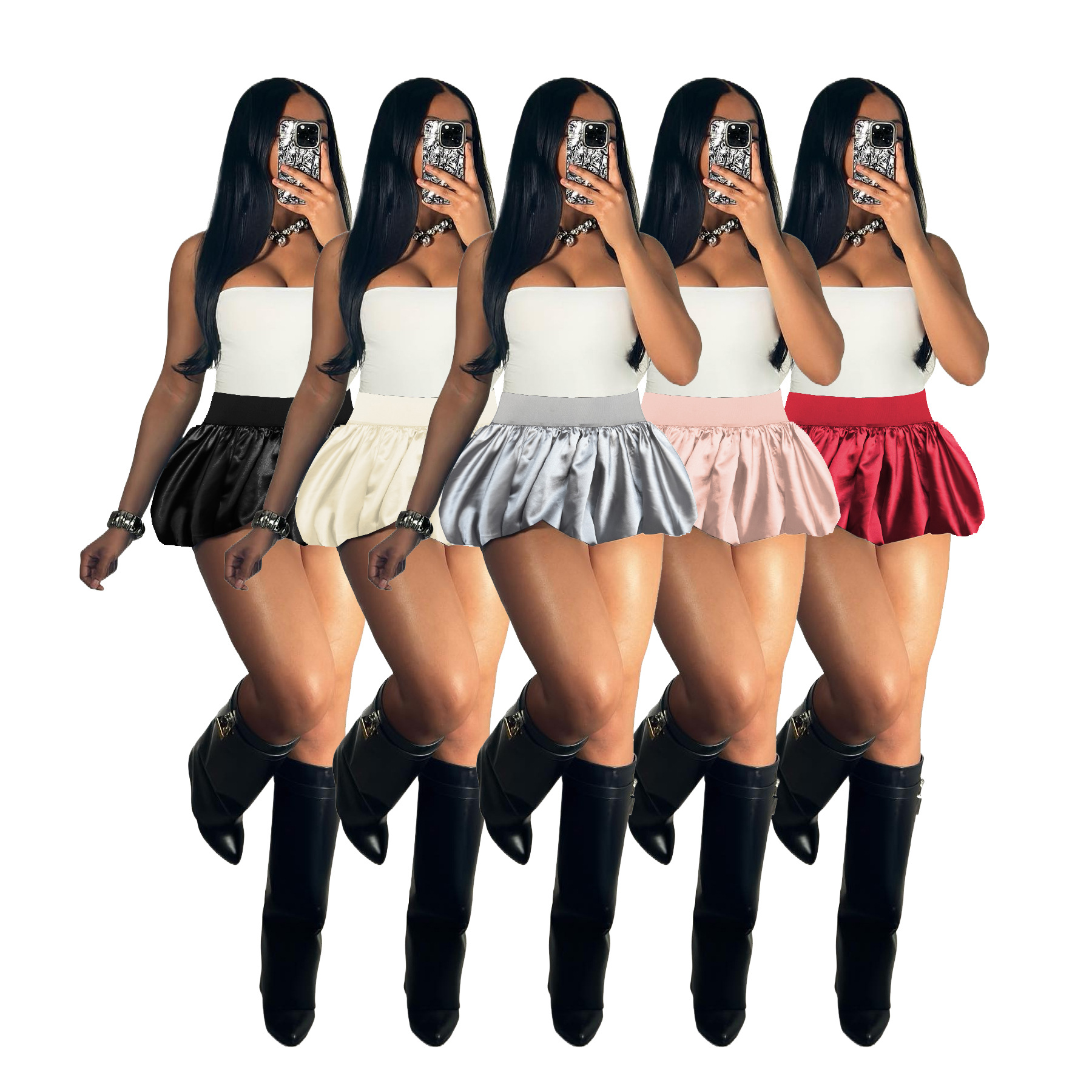 D10088 새틴 글로우 미니 플리츠 스커트 버블 버블 스커트 솔리드 컬러 스트레치 허리 미니 스커트