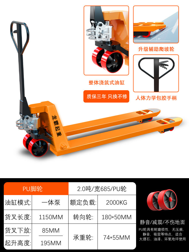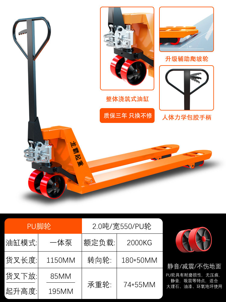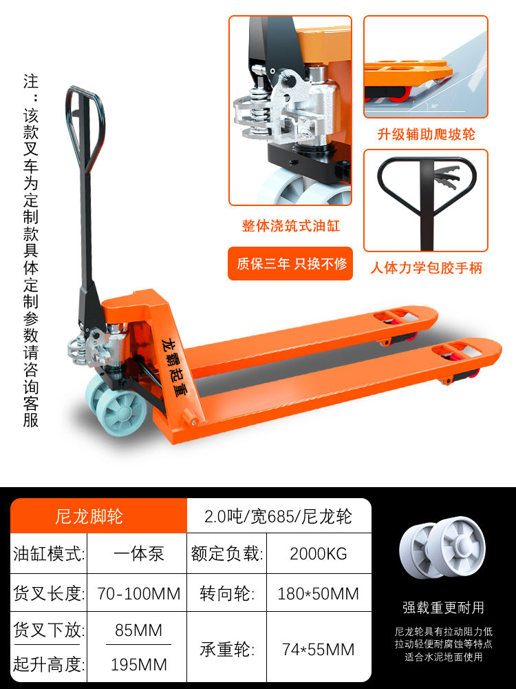 Longba 수동 유압 트럭 실린더 지게차 2 톤 3 톤 핸드 트레일러 카트 소 팔레트 트럭 적재 및 하역 트럭스토어 가기