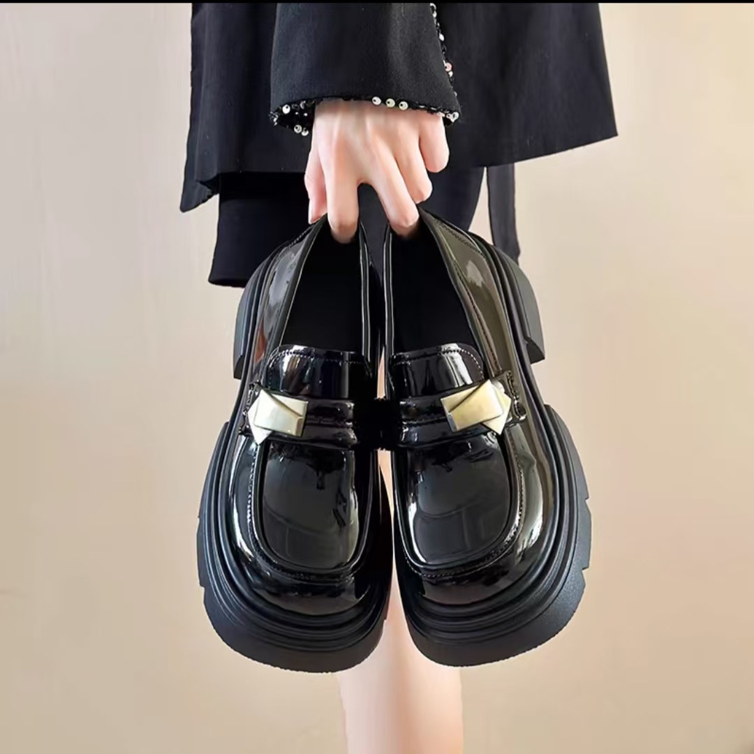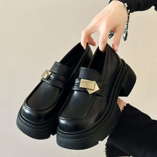 블랙 두꺼운 밑창 영국식 가죽 신발 여성용 빈티지 메리 제인 슬립 온 로퍼 싱글 레이어 신발 2025 봄과 가을 뉴