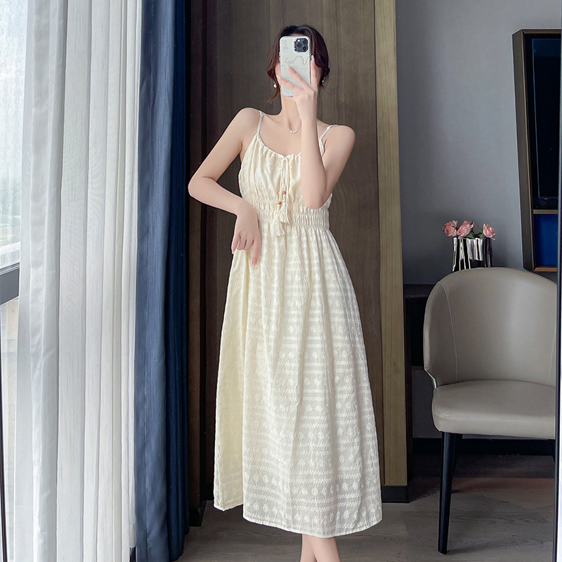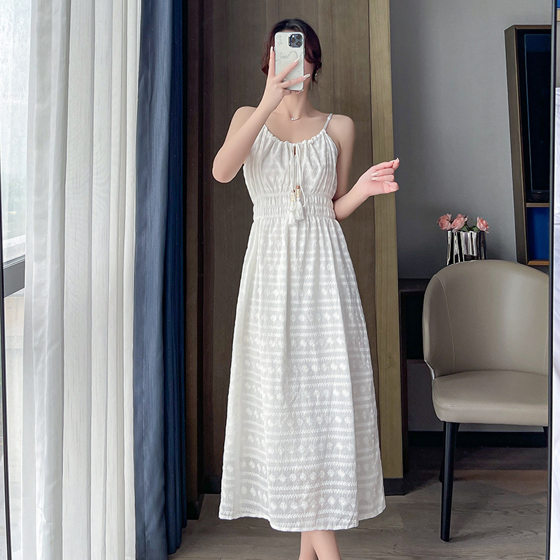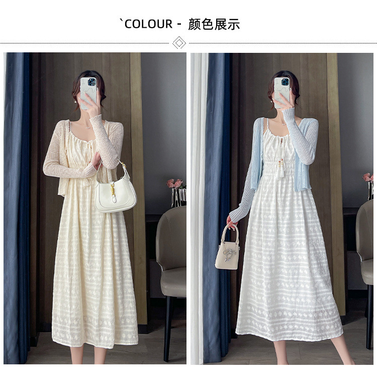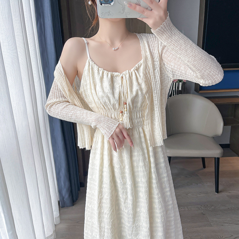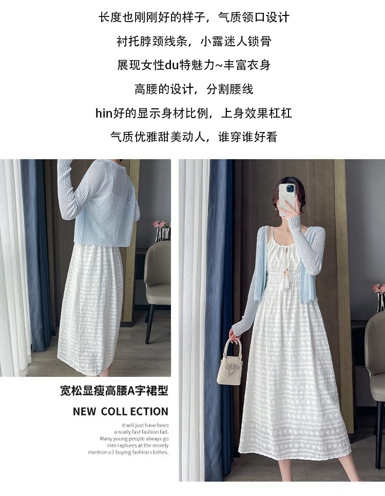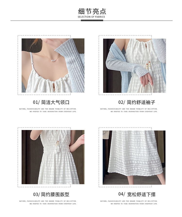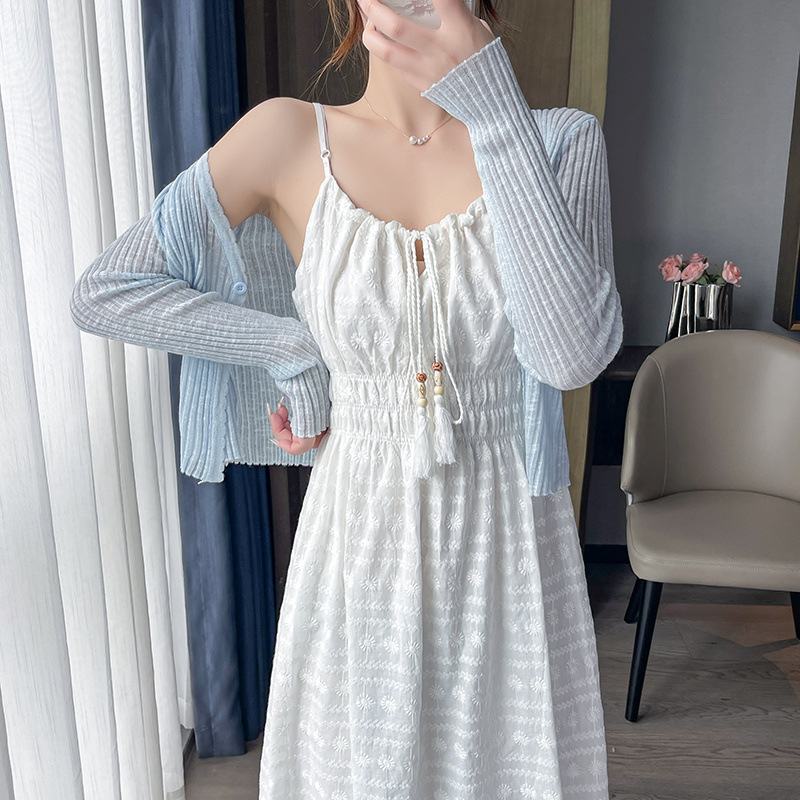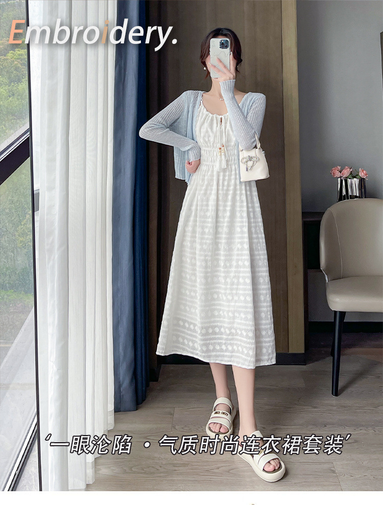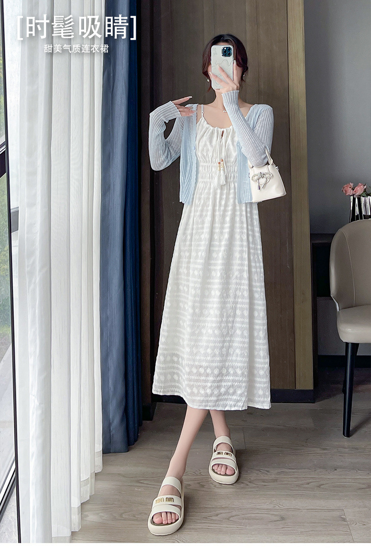 화이트 스트랩 원피스 태양 보호 카디건 투피스 세트 2024 여름 새로운 부드러운 스타일 신선한 A 라인 스커트스토어 가기