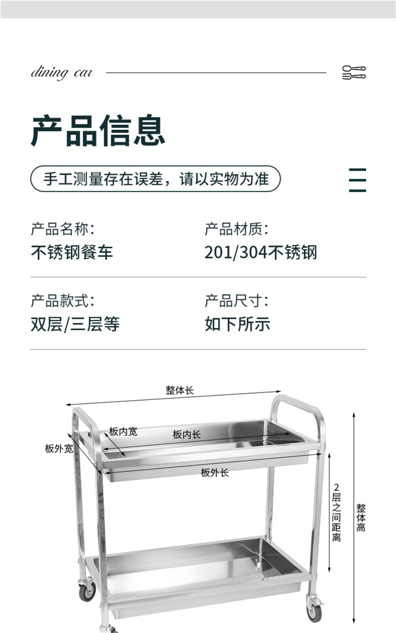 • 고급형: 두꺼운 중형 2층 다이닝 카트(사일런트 휠) 스테인리스 스틸