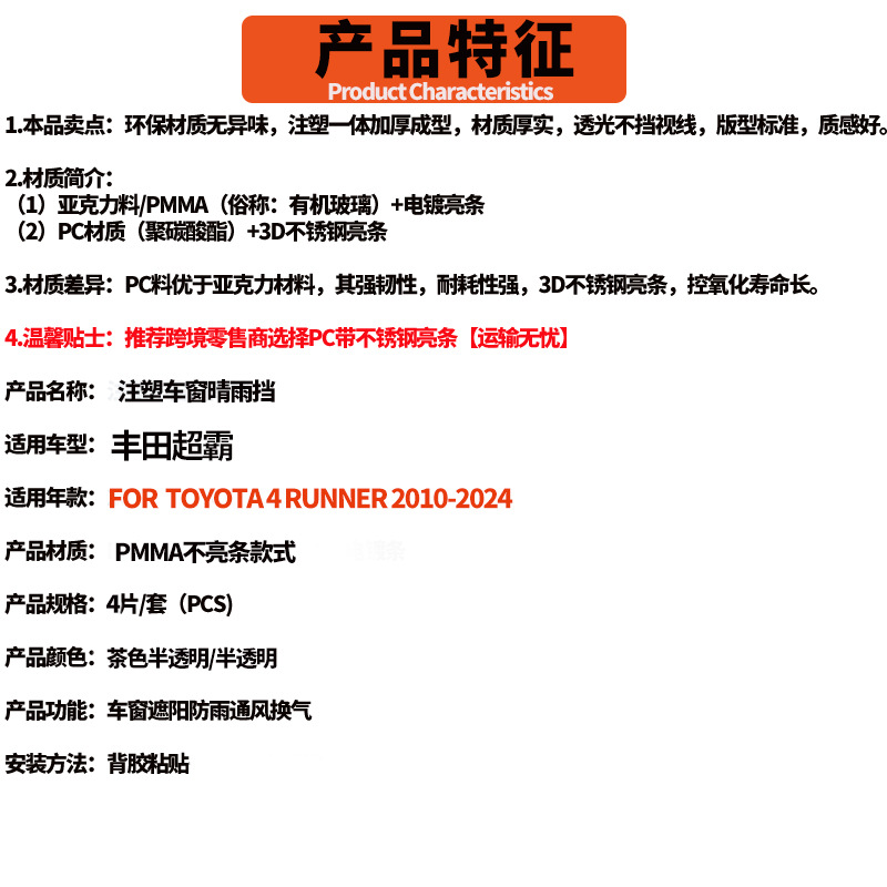 • Toyota Speedmaster 4 RUNNER 2010-2024 PMMA 실버 브라이트 스트립 없음 창 비 및 비 차단 4PCS