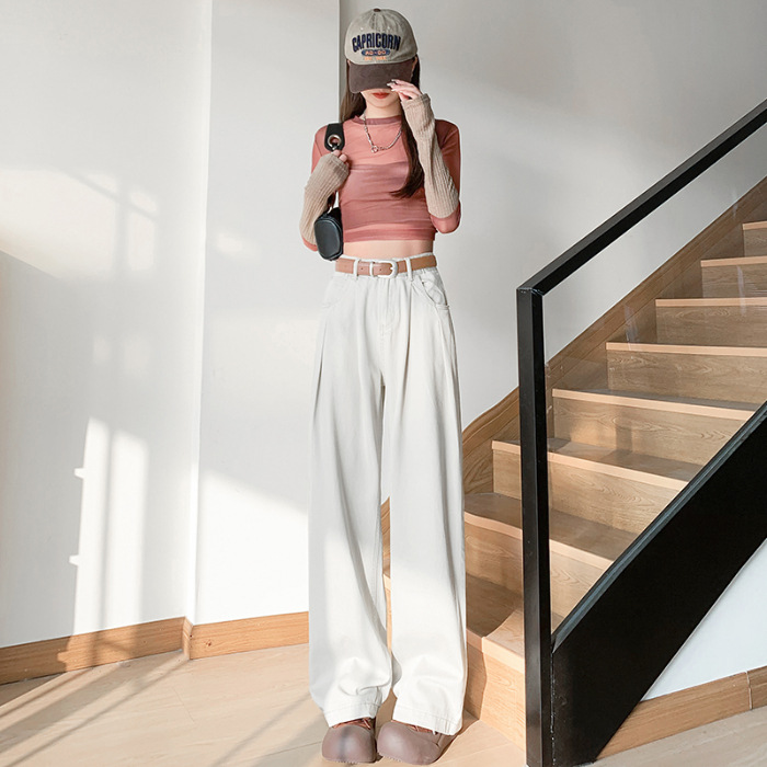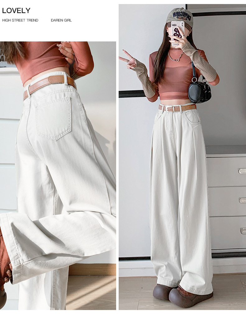 흰 청바지 여성의 3 가지 방지 패브릭 딥 스트레이트 팬츠 봄과 여름 2025 높은 허리 느슨한 넓은 다리 바지