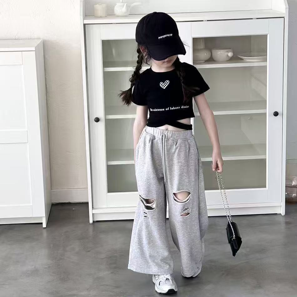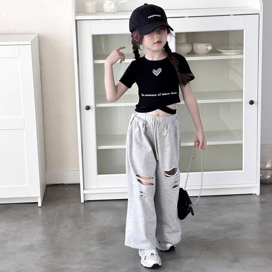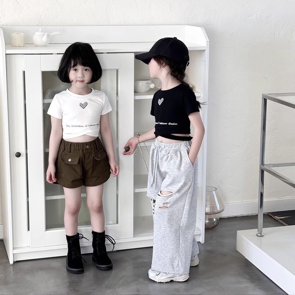 2025 년 여름 새로운 서양식 아동복 소녀 편지 한국식 티셔츠 슬림핏 배꼽 크로스 탑 짧은 소매