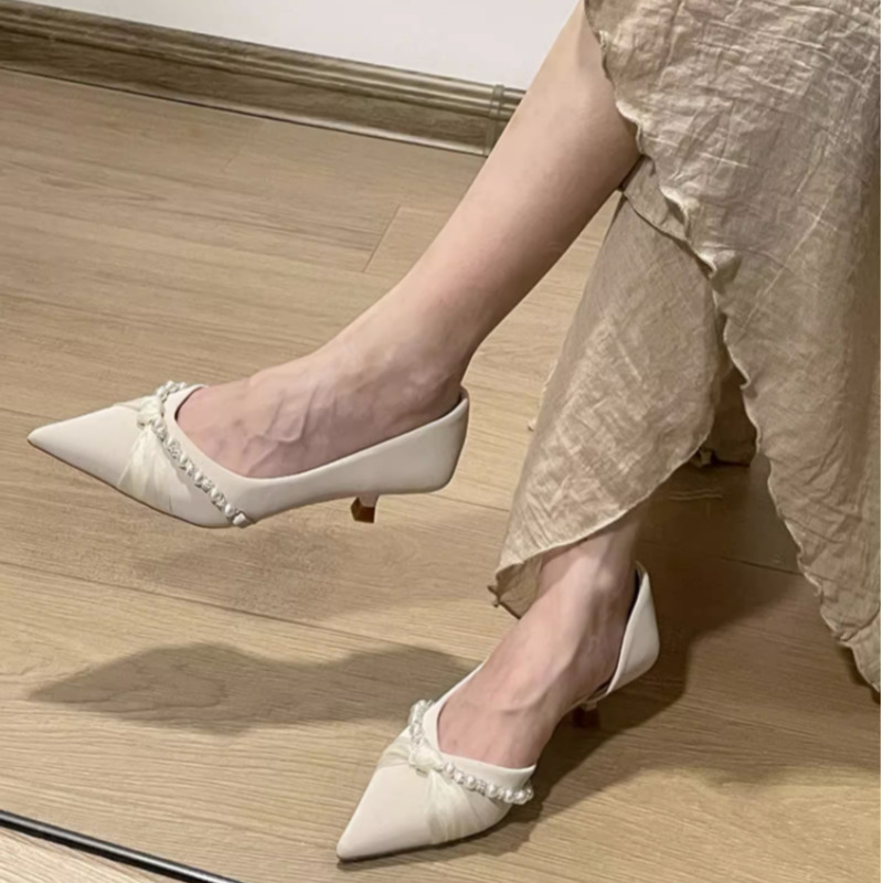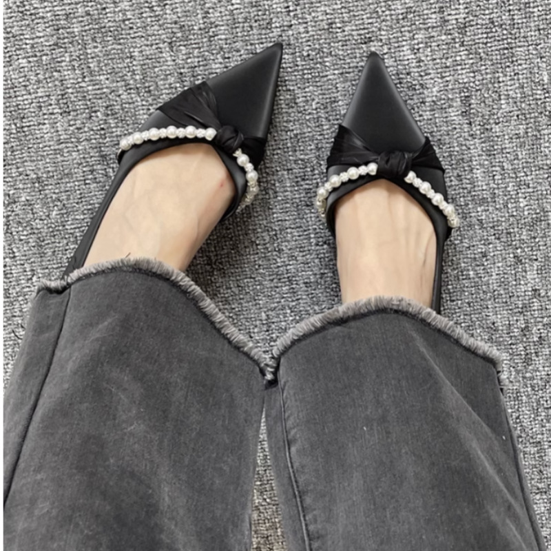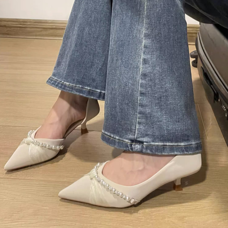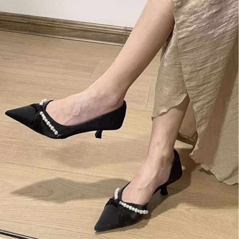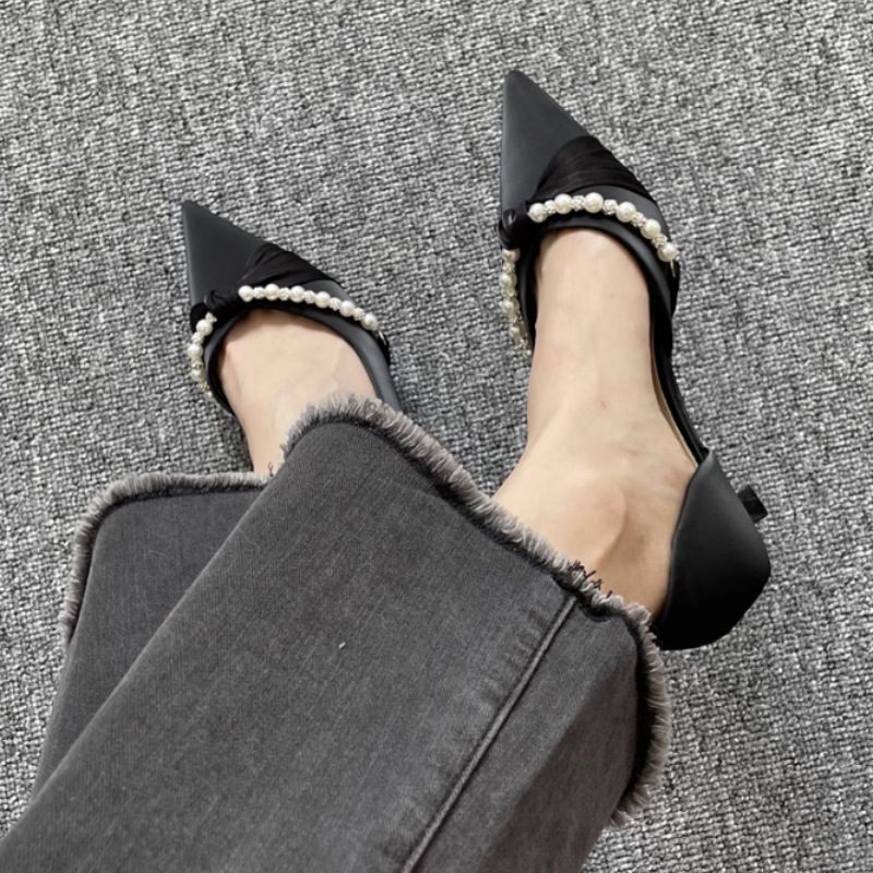 하이힐 여자 2024 년 여름 새 요정 스타일 새틴 사이드 빈 올 매치 스틸레토 힐을 가리키는 진주 밍크 신발스토어 가기