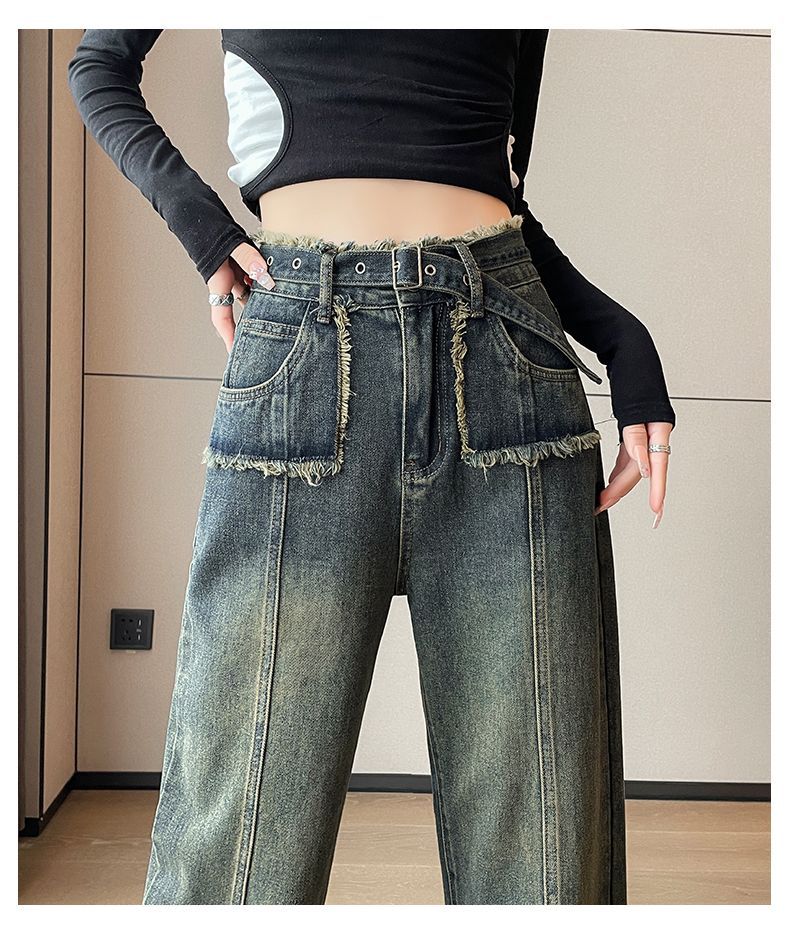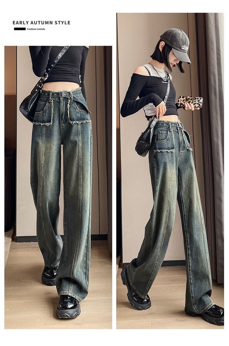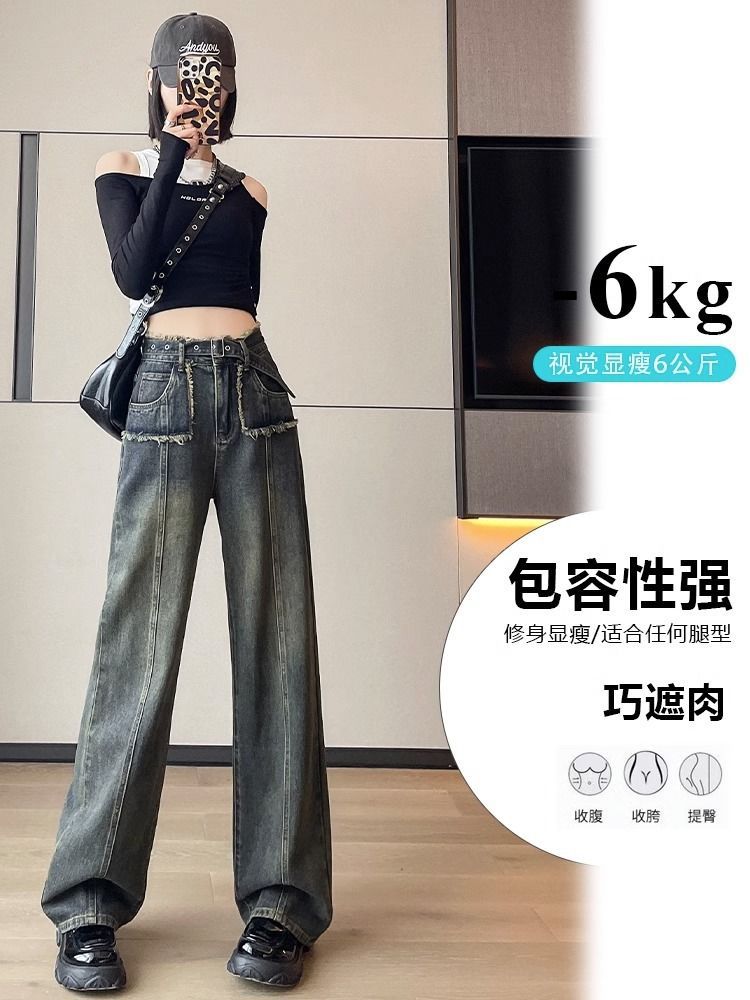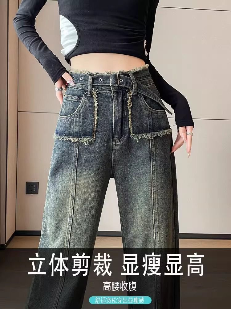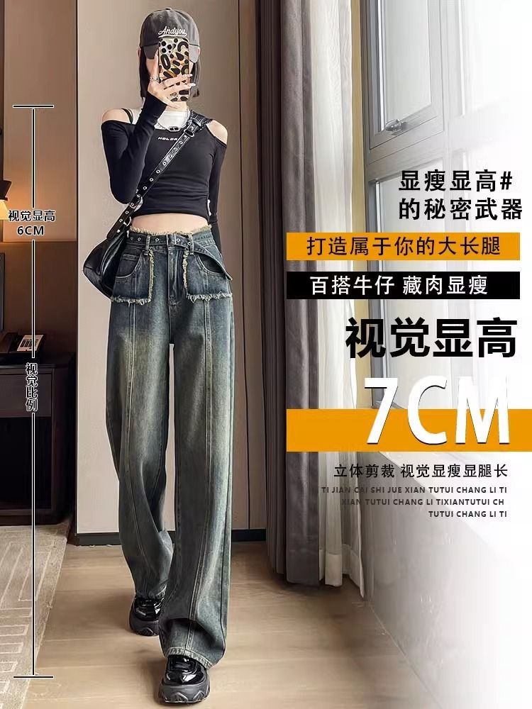 넓은 다리 청바지 여성의 봄과 가을 2025 새로운 레트로 모피 가장자리 높은 허리 느슨한 슬리밍 어린이를위한 좁은 직선 다리 바지스토어 가기