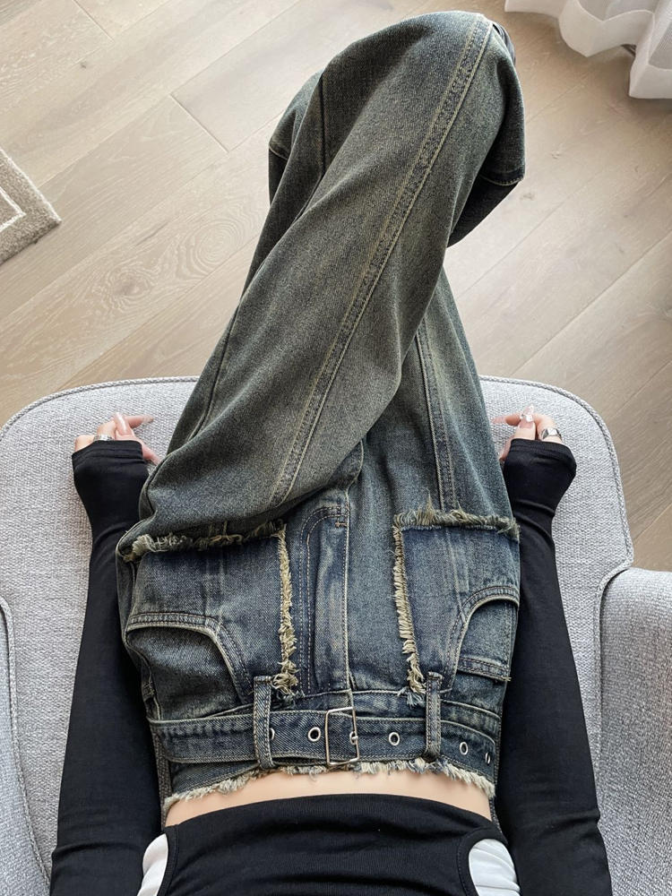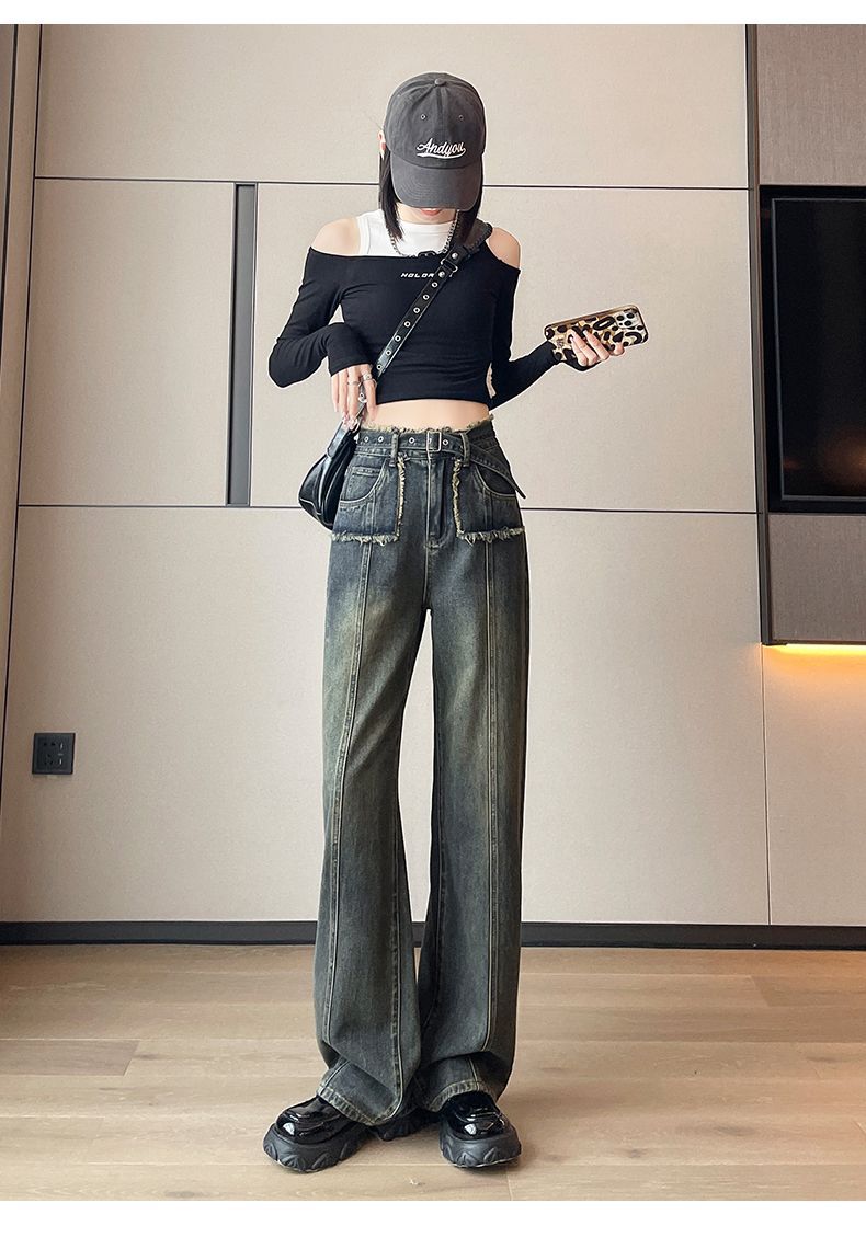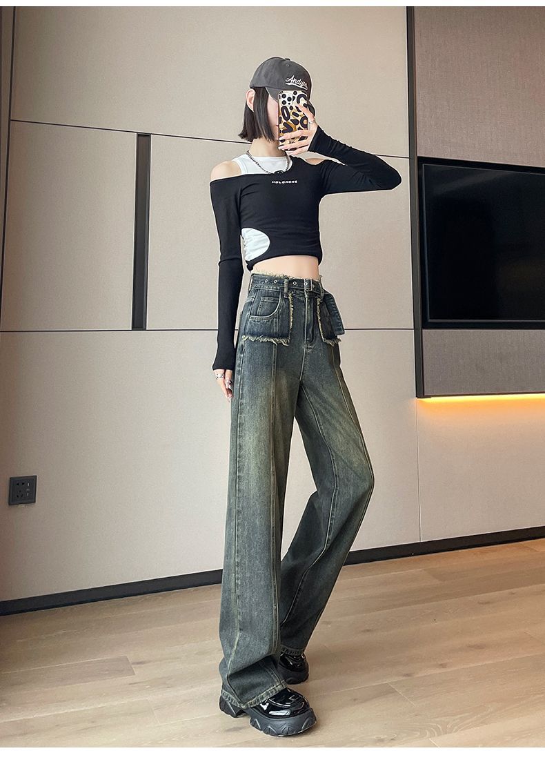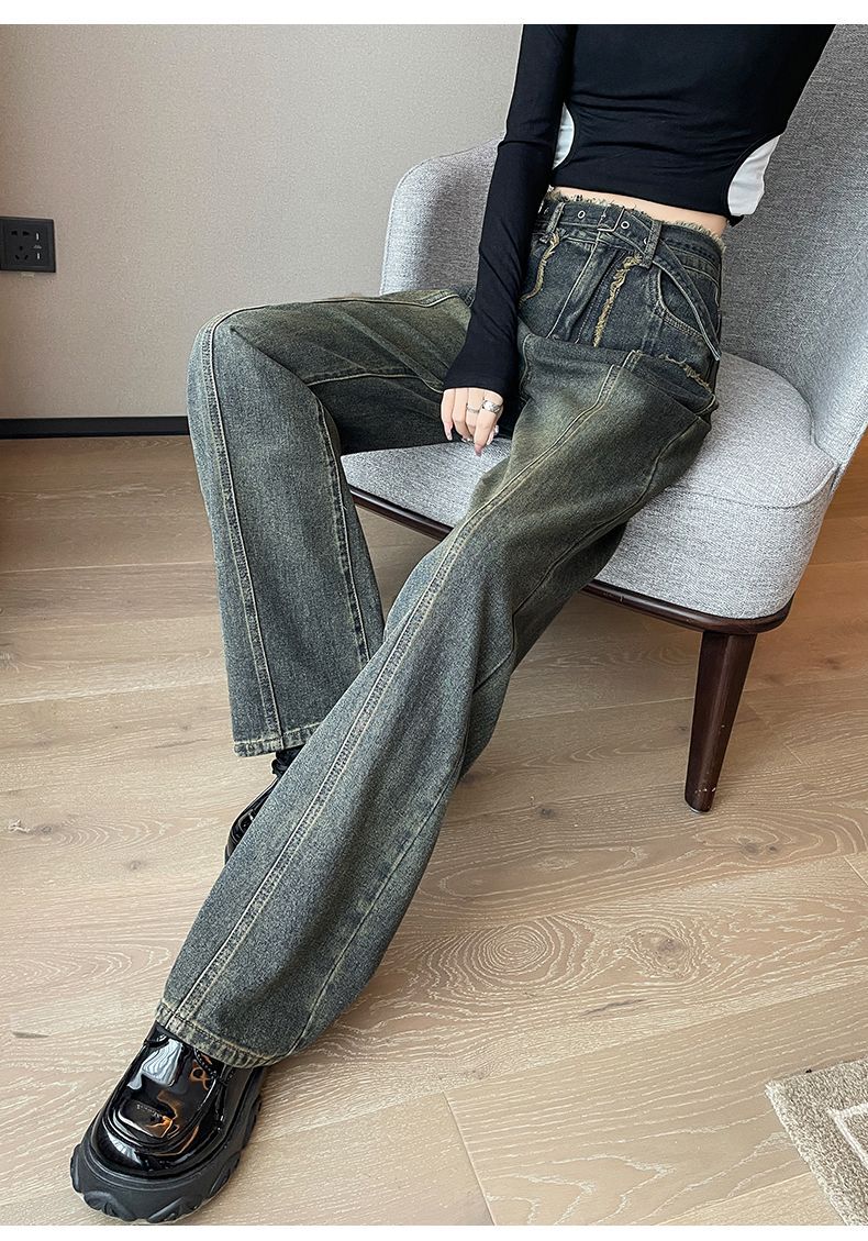 넓은 다리 청바지 여성의 봄과 가을 2025 새로운 레트로 모피 가장자리 높은 허리 느슨한 슬리밍 어린이를위한 좁은 직선 다리 바지스토어 가기