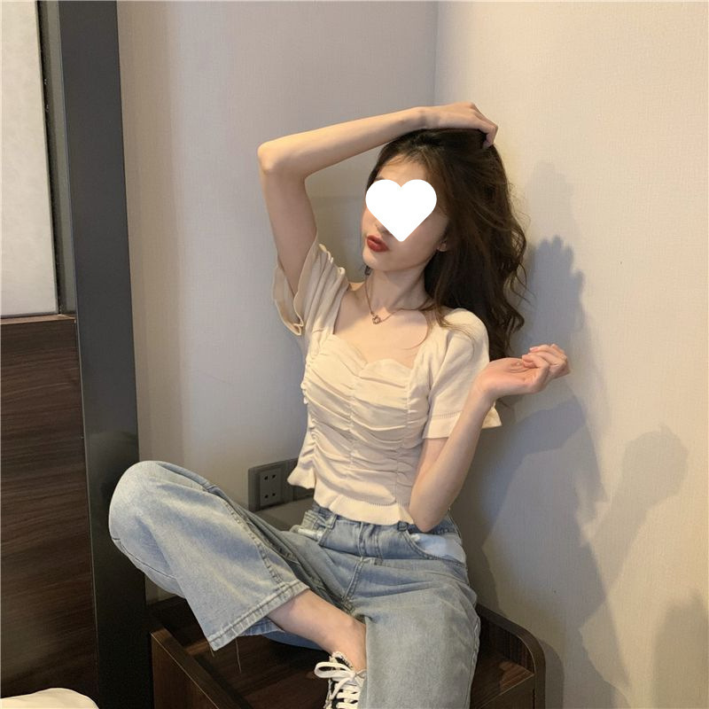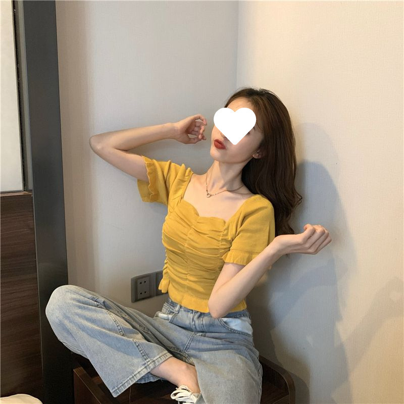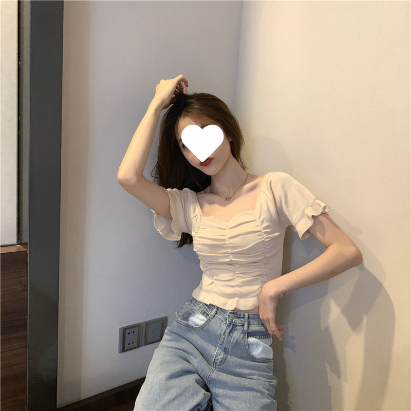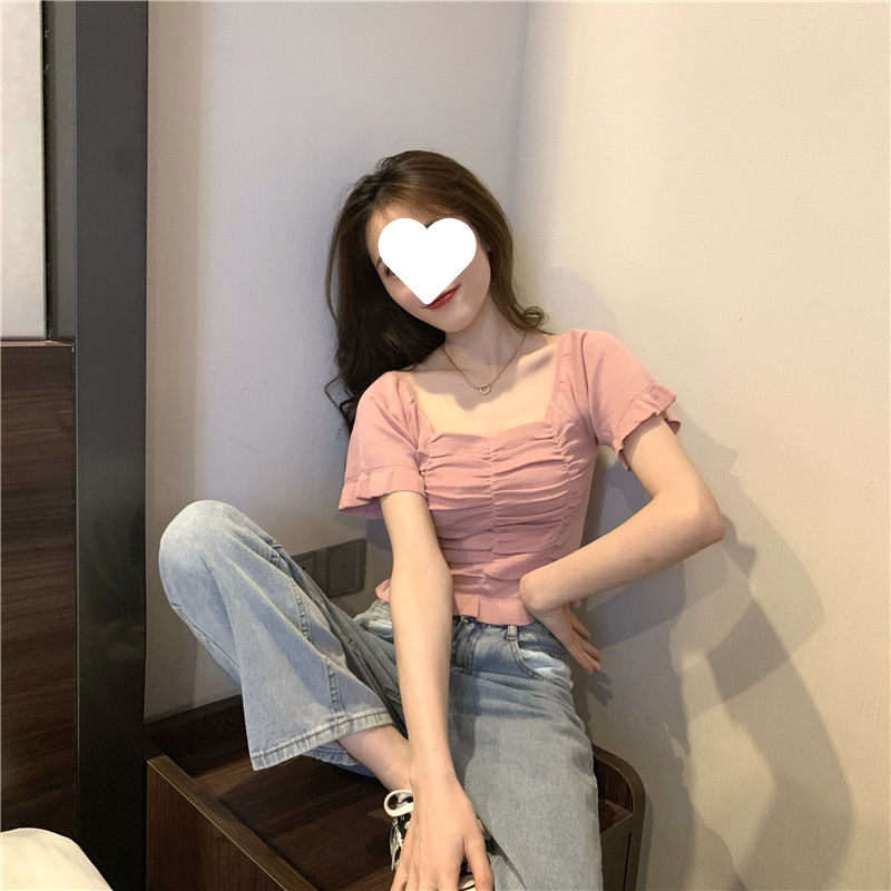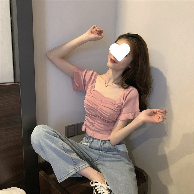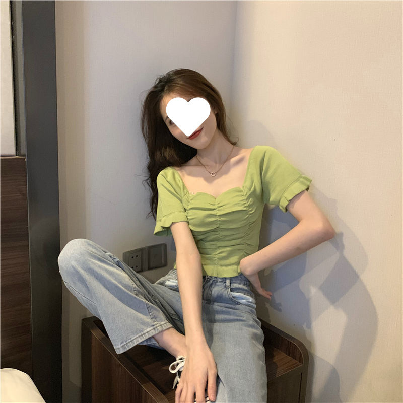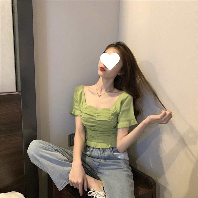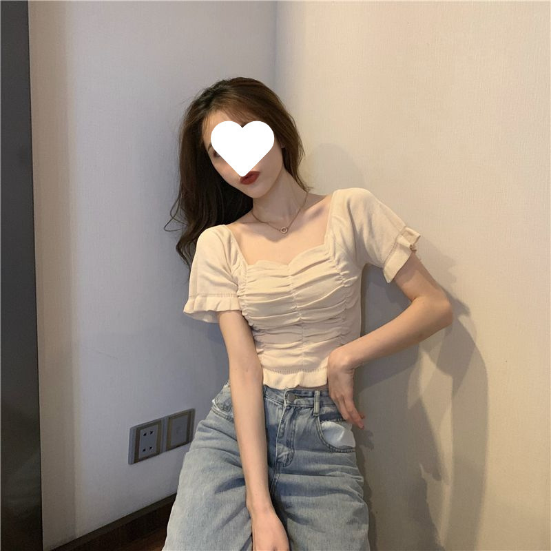 프랑스 스퀘어 칼라 반팔 니트 스웨터 2024 여름 새로운 도착 레트로 탑 칼라 본 센서 여성용 짧은 티셔츠스토어 가기