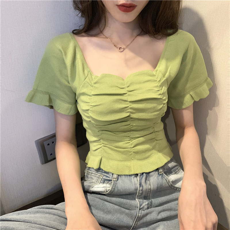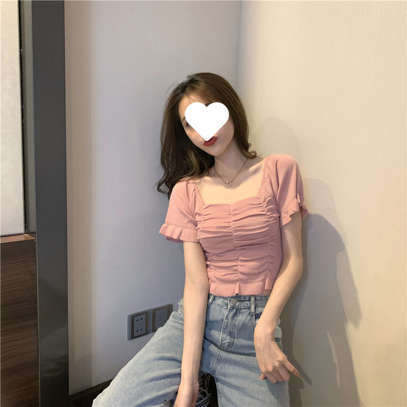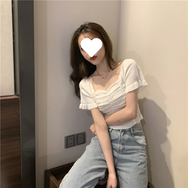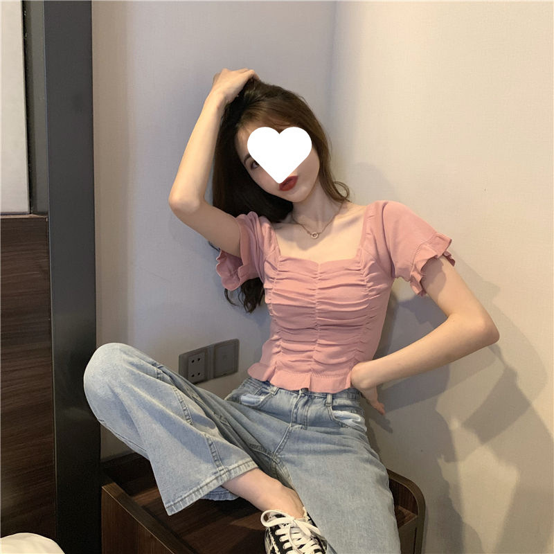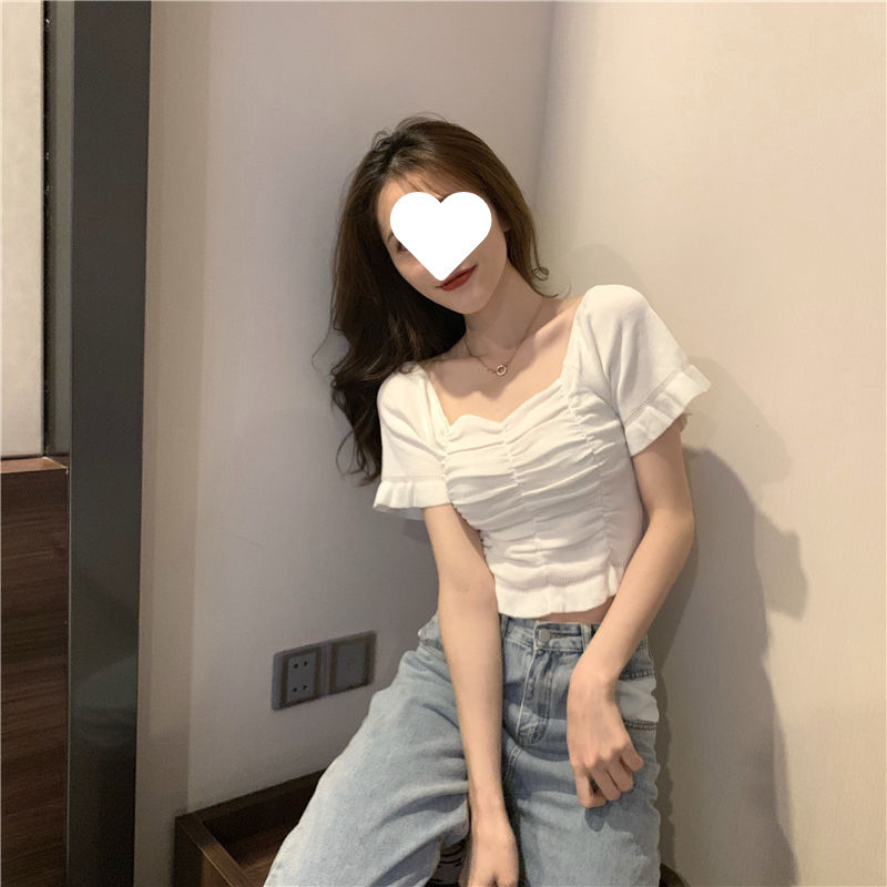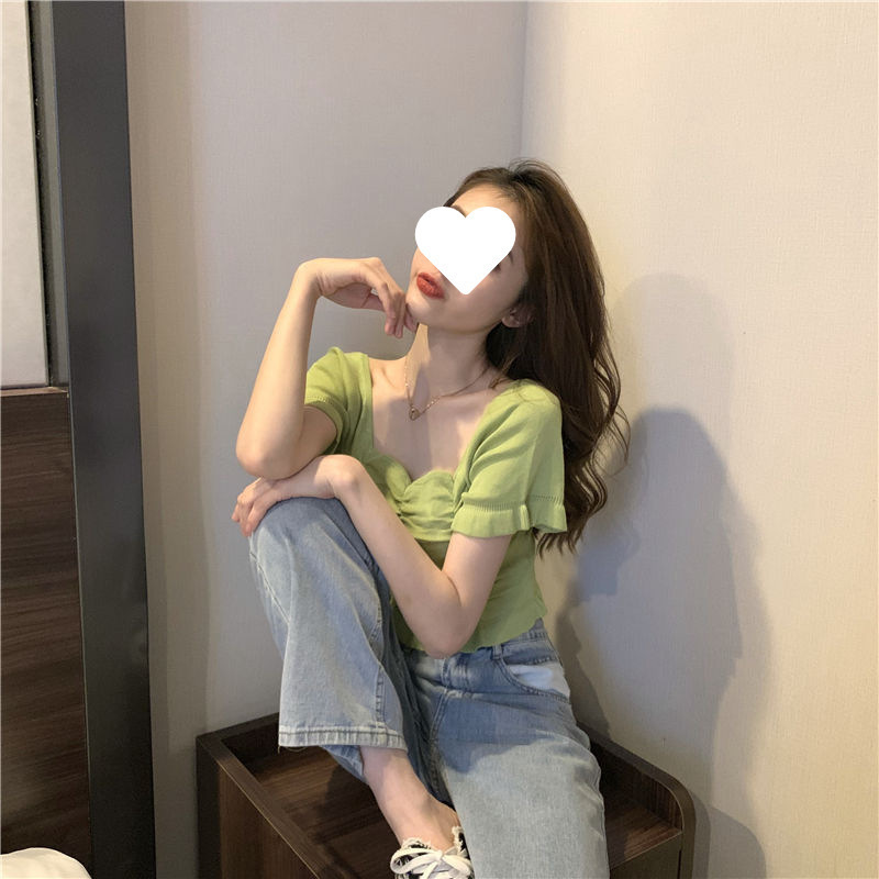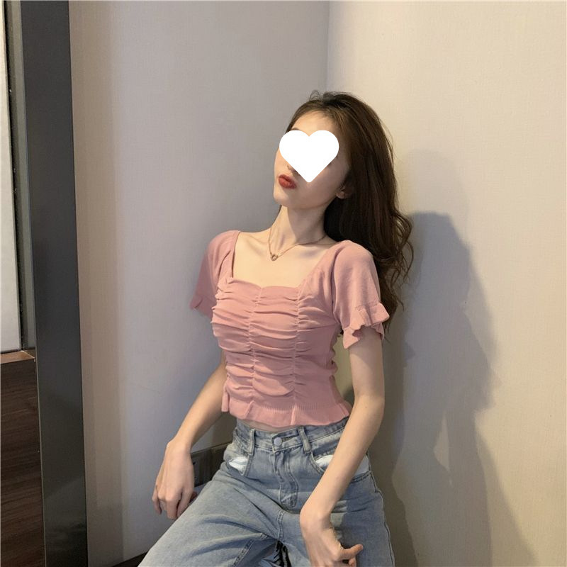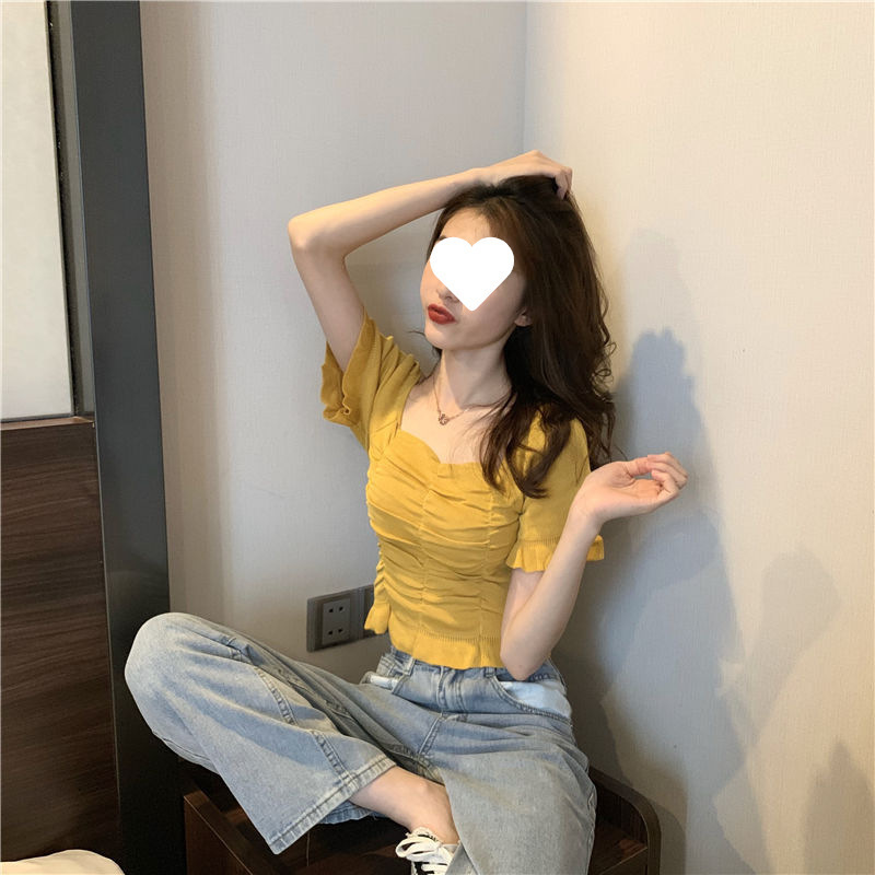 프랑스 스퀘어 칼라 반팔 니트 스웨터 2024 여름 새로운 도착 레트로 탑 칼라 본 센서 여성용 짧은 티셔츠스토어 가기