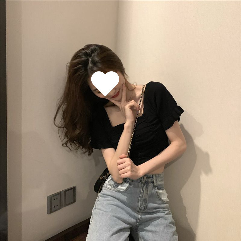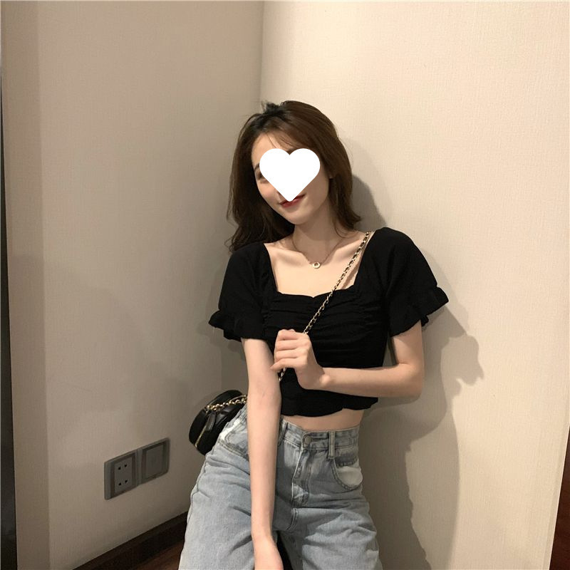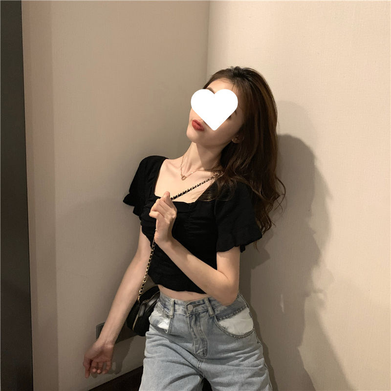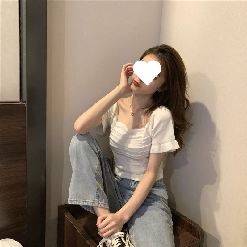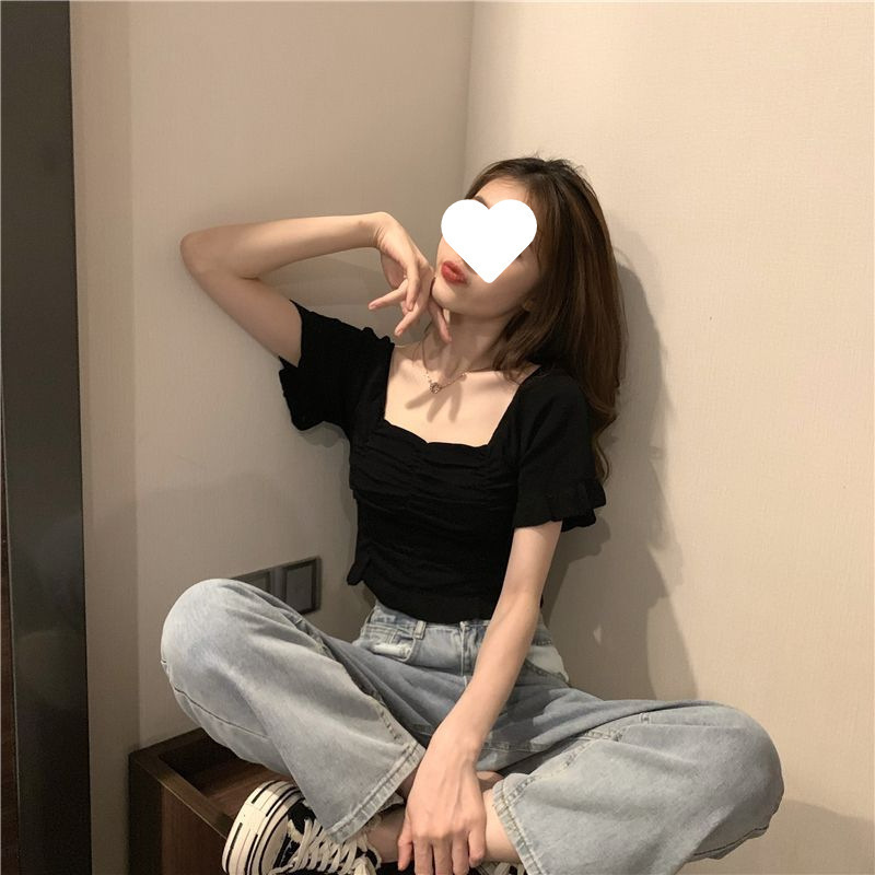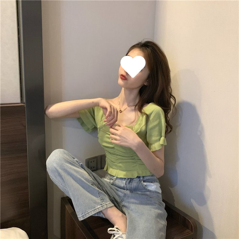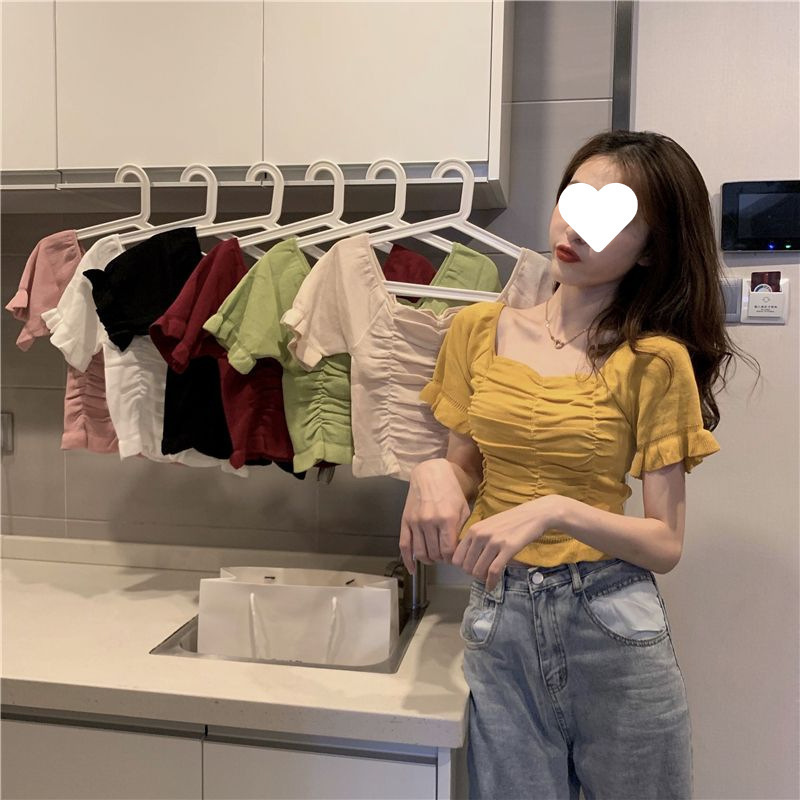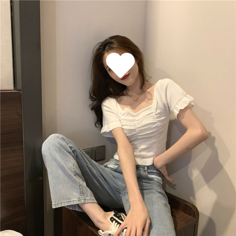 프랑스 스퀘어 칼라 반팔 니트 스웨터 2024 여름 새로운 도착 레트로 탑 칼라 본 센서 여성용 짧은 티셔츠스토어 가기