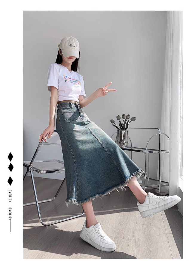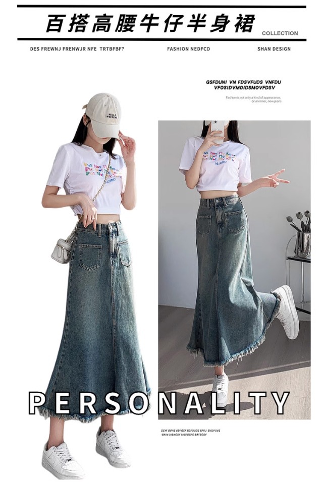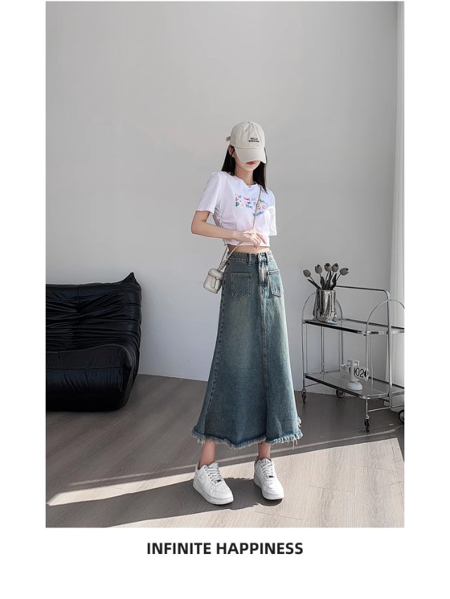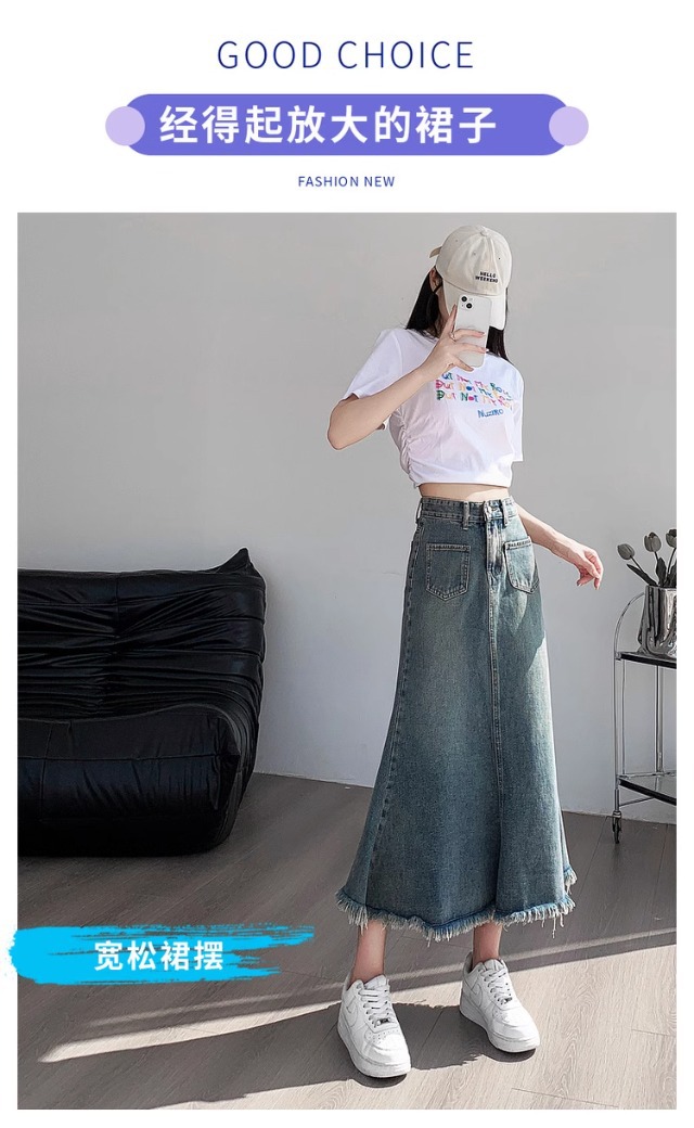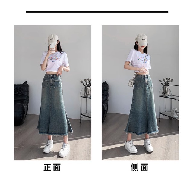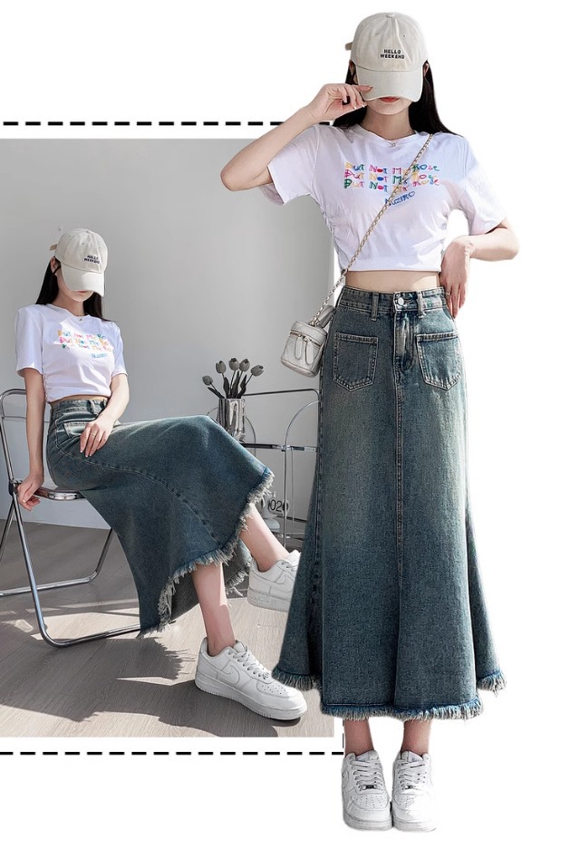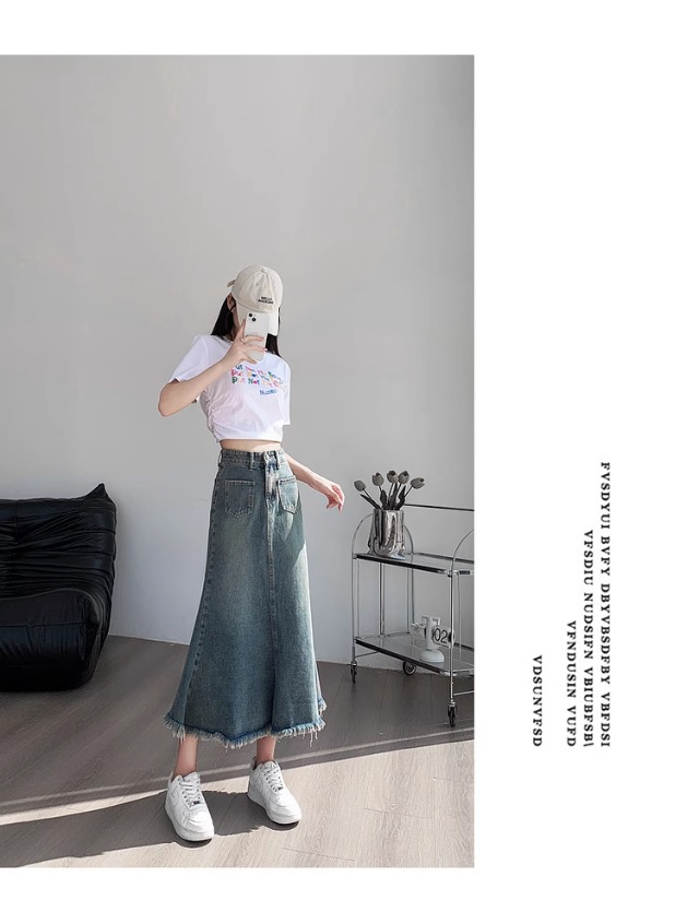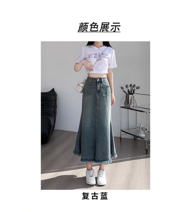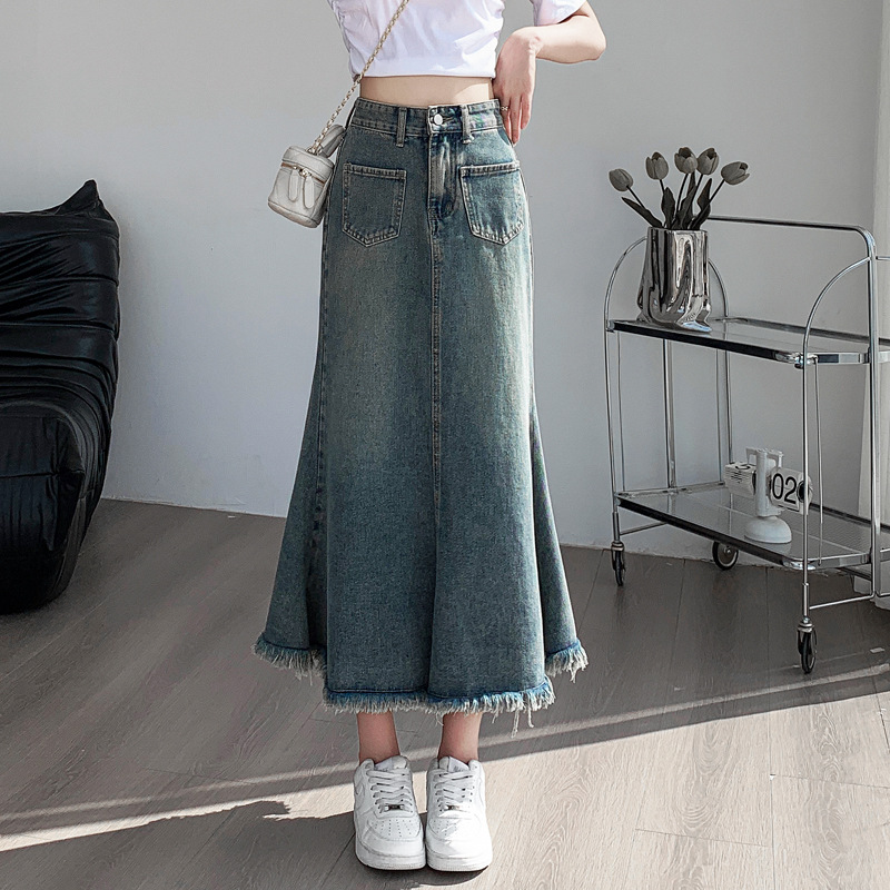 빈티지 데님 스커트 여자 2025 유행 올매치 새로운 도착 봄 및 가을 모직 A 라인 팔 피스트테일 중간 길이 스커트