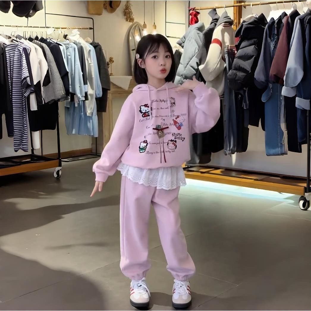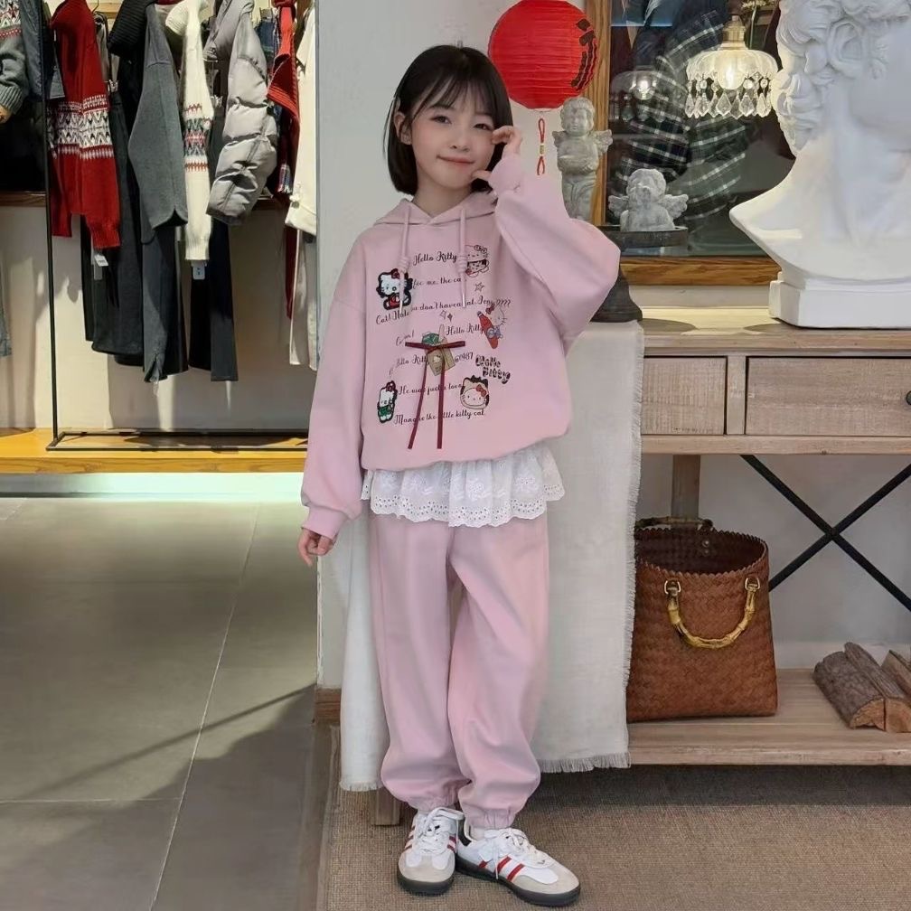 소녀 세트 봄 아동복 한국 스타일 어린이 만화 인터넷 인기있는 느슨한 스웨터 학생 소녀 바지 Huzhou Zhili