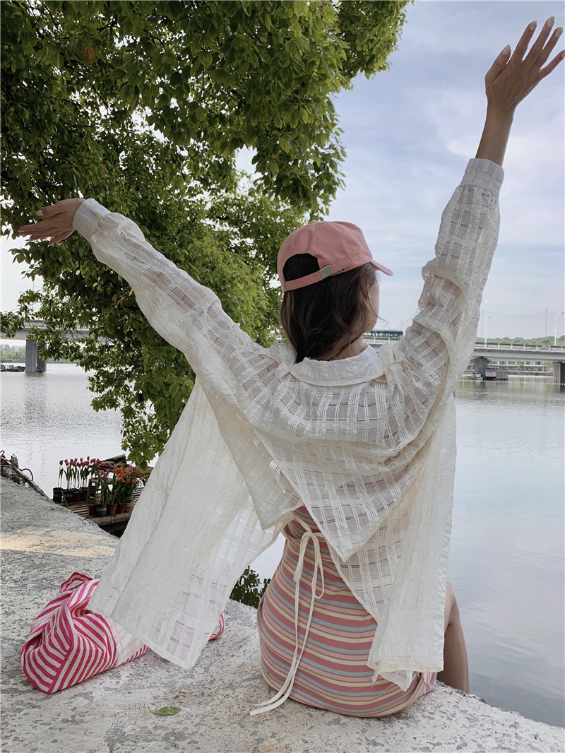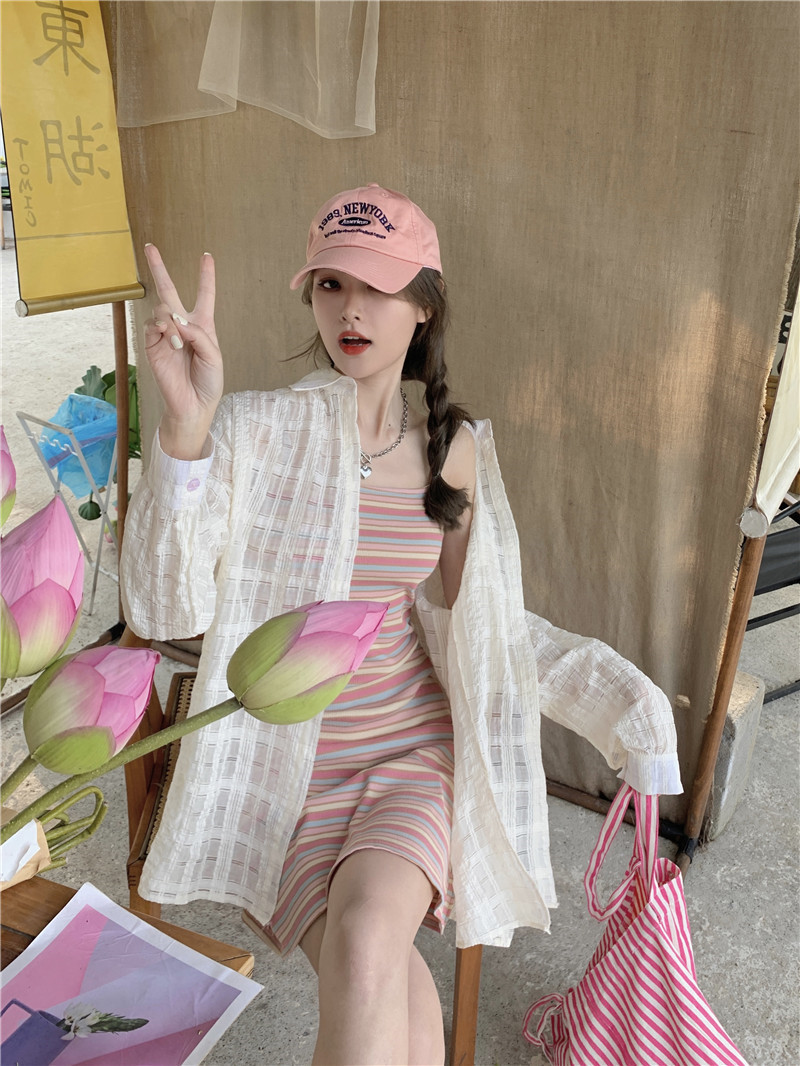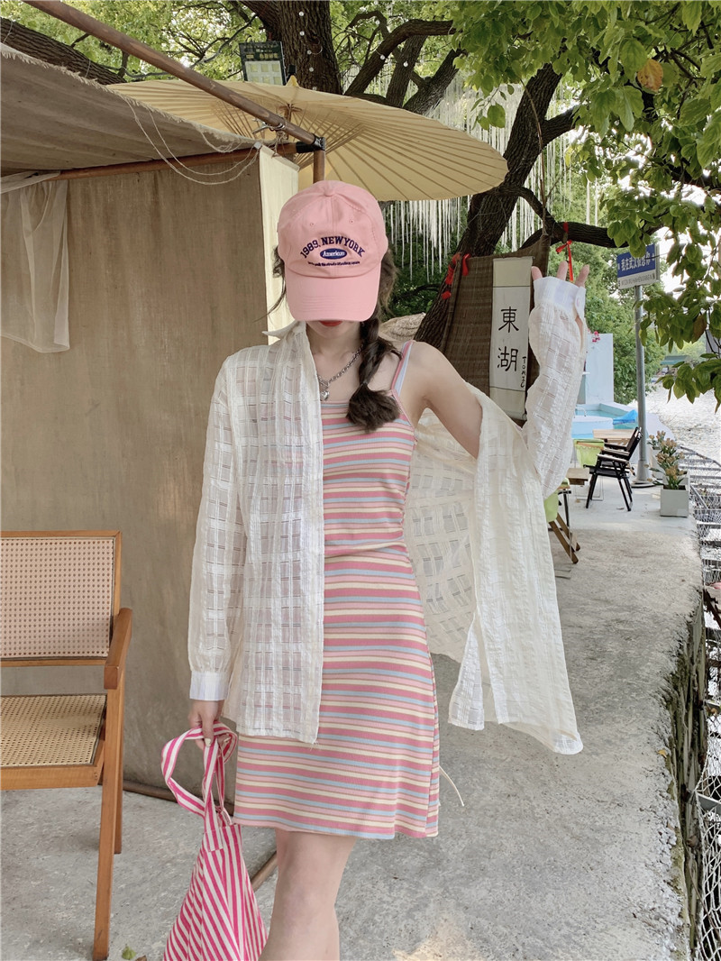 [대학 스타일 디자인] 여름 새 무지개 줄무늬 니트 멜빵 원피스 긴소매 선 스크린 여성 소금