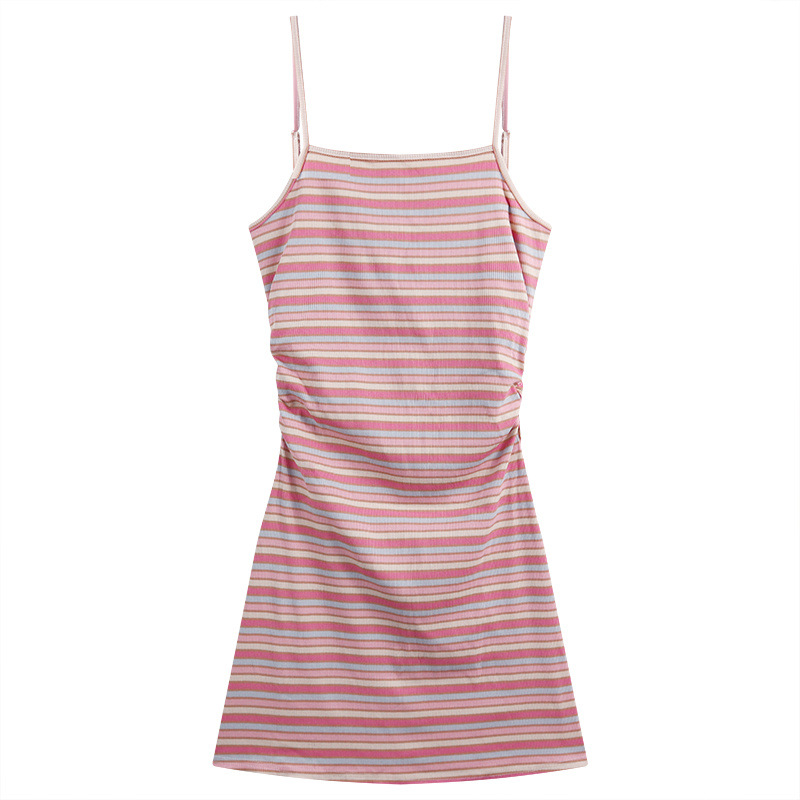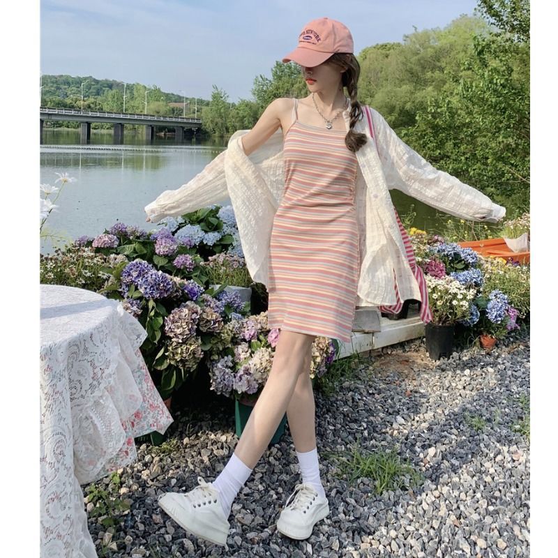 [대학 스타일 디자인] 여름 새 무지개 줄무늬 니트 멜빵 원피스 긴소매 선 스크린 여성 소금스토어 가기