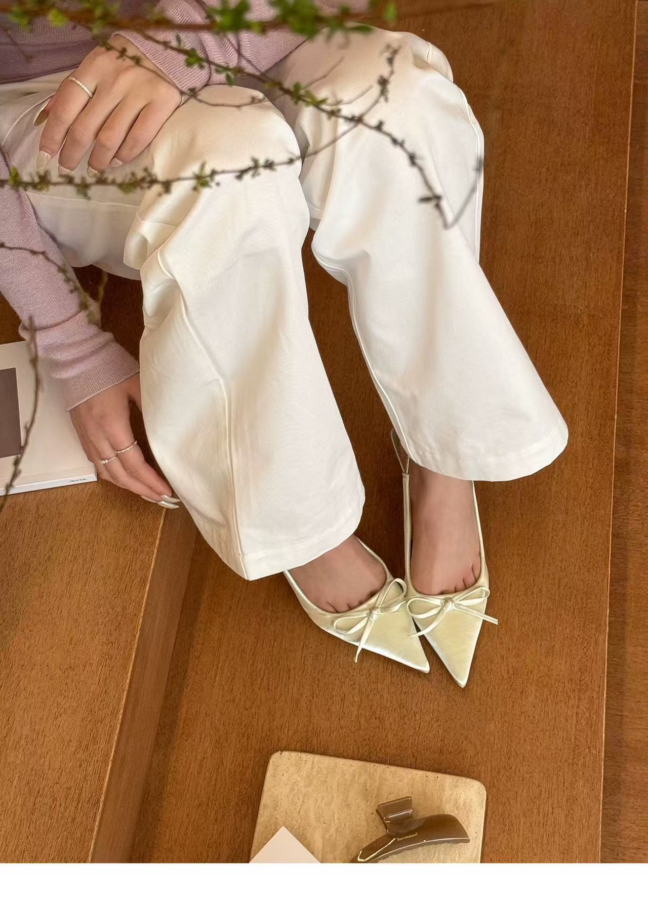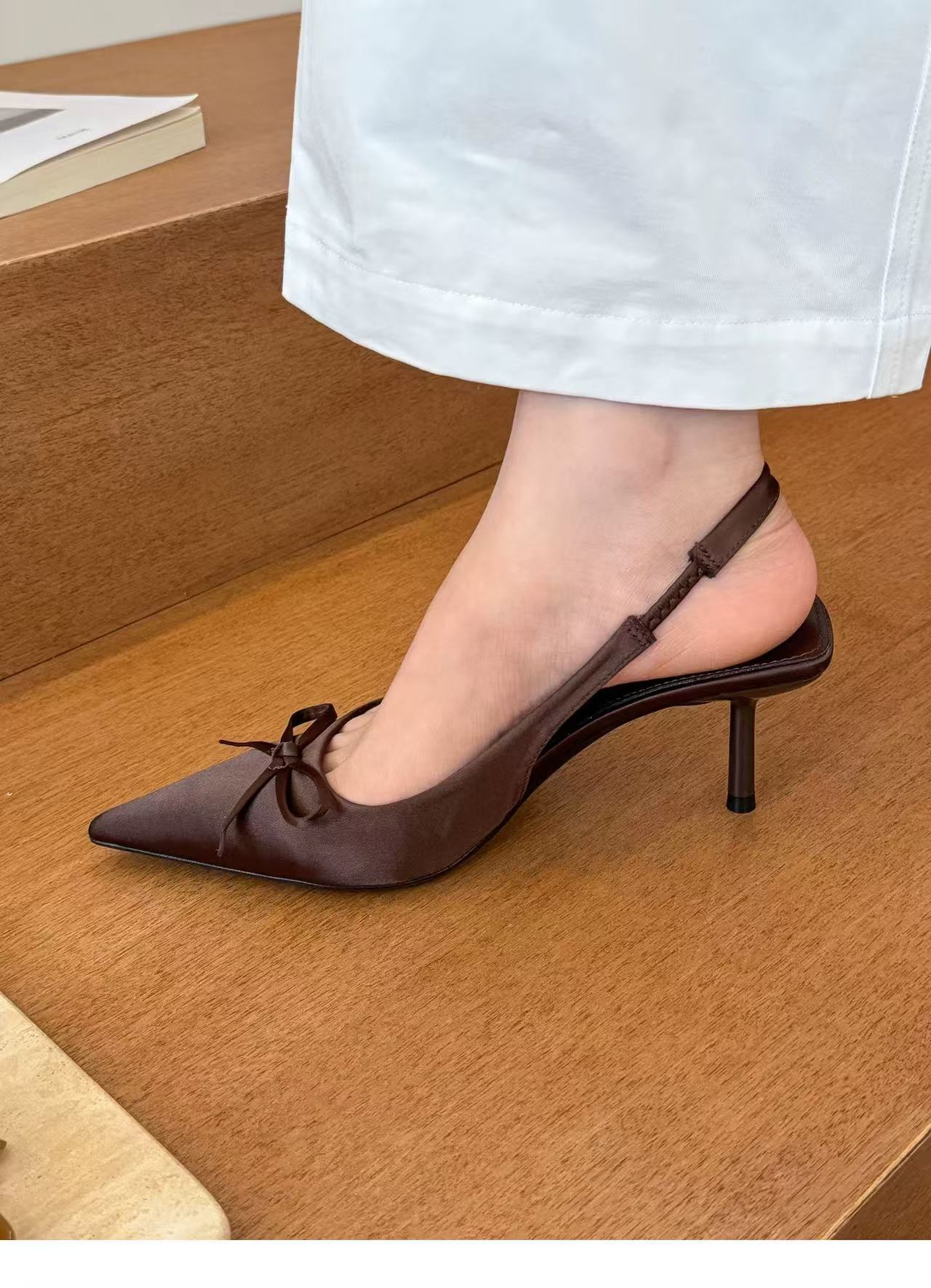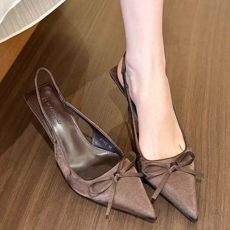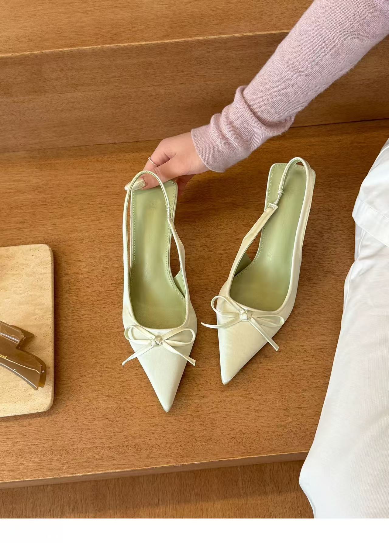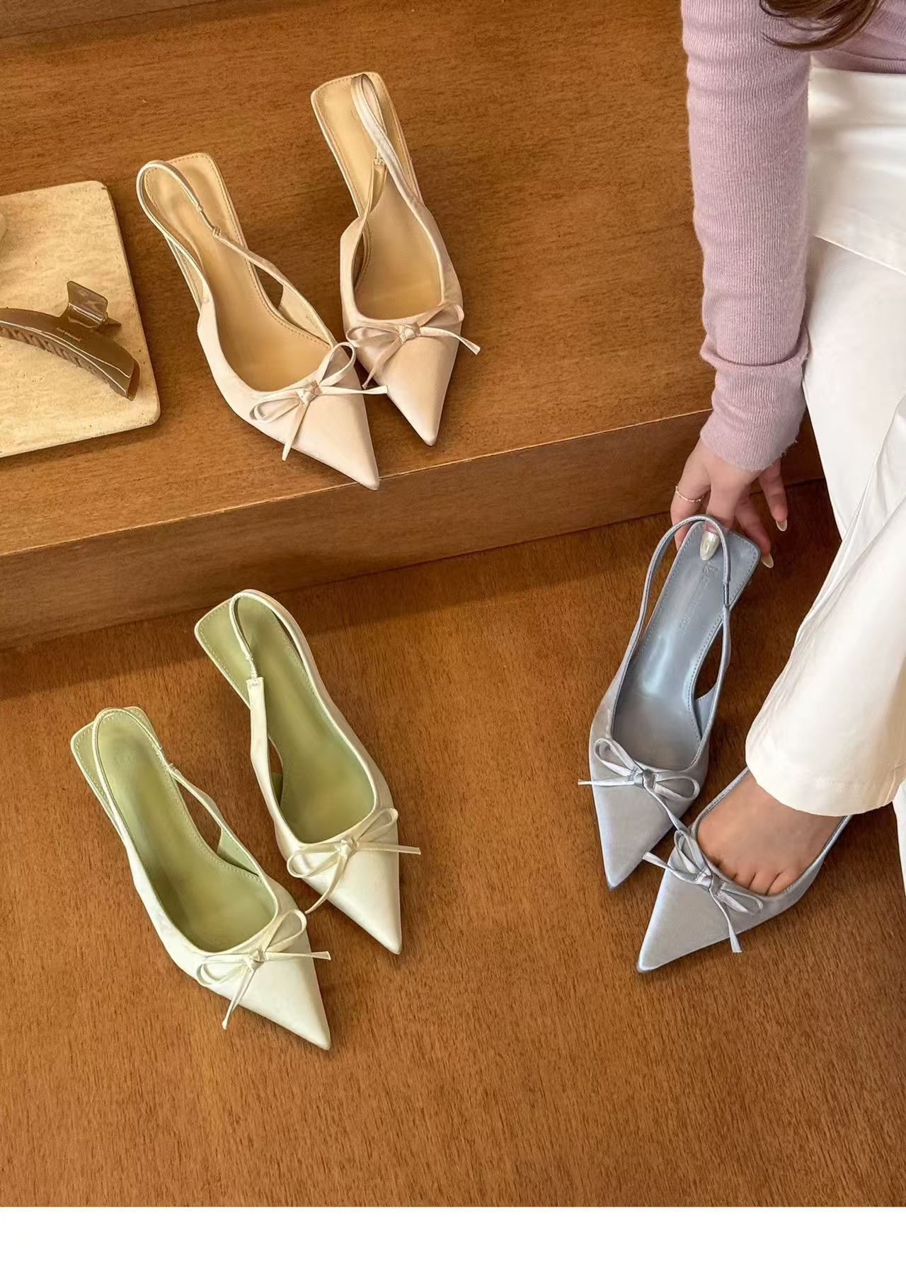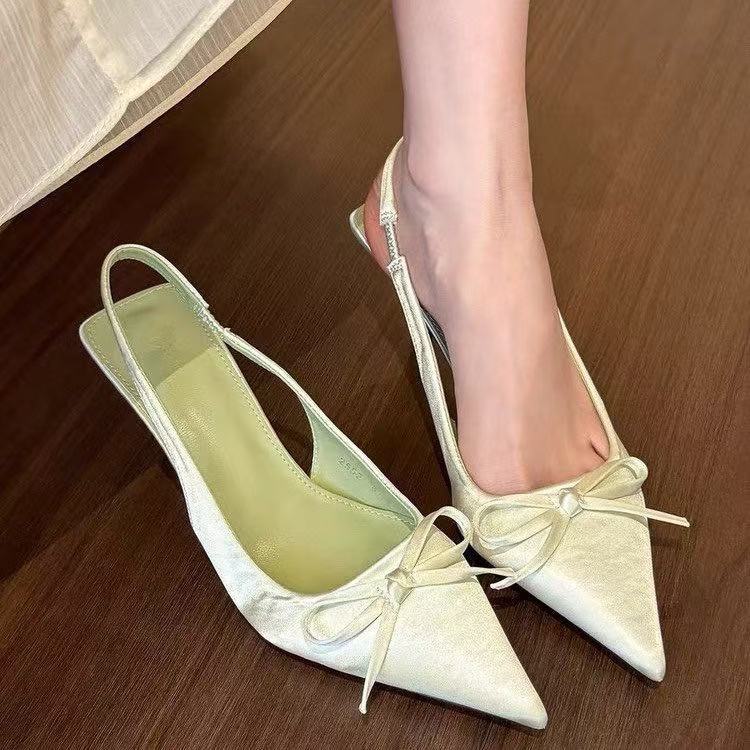 그린 원더 랜드! 새틴 포인팅 활 하이힐 여성 봄 얕은 Hallback 샌들