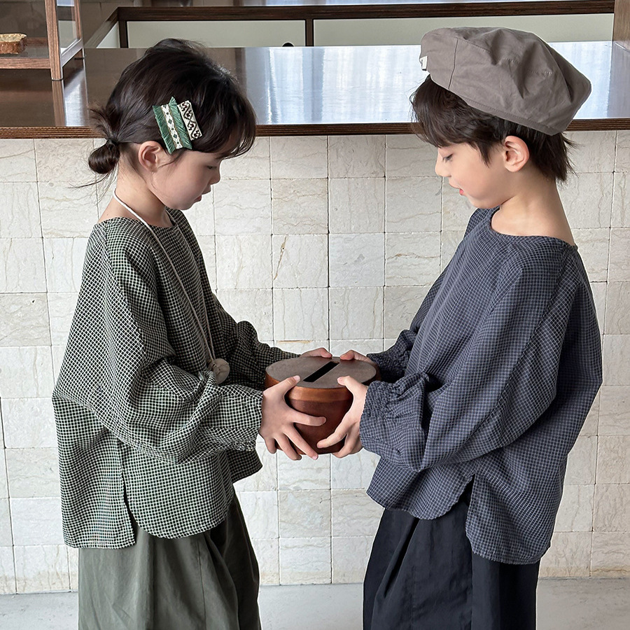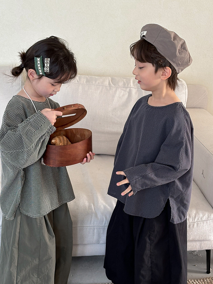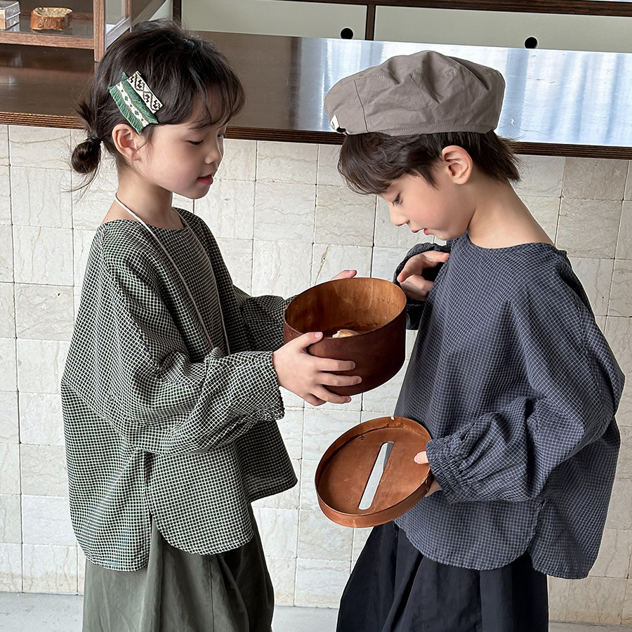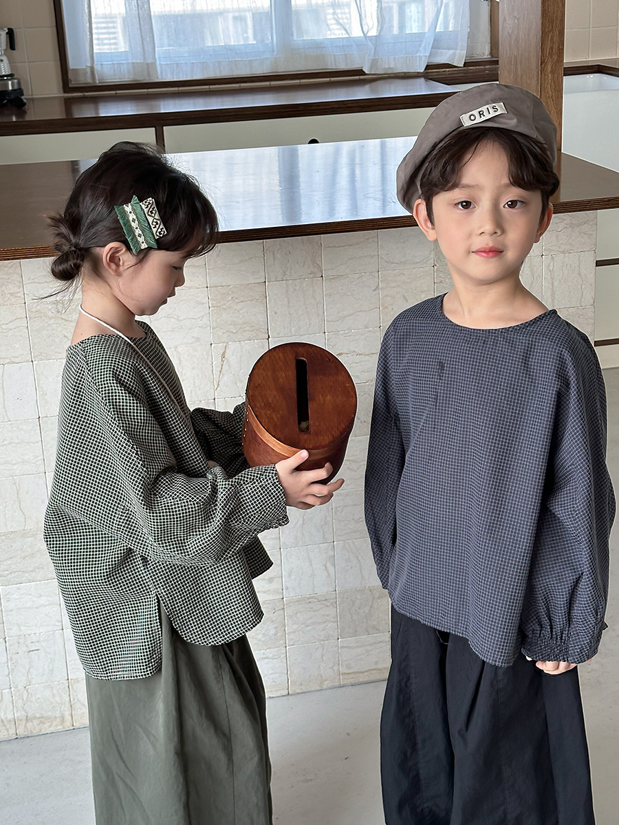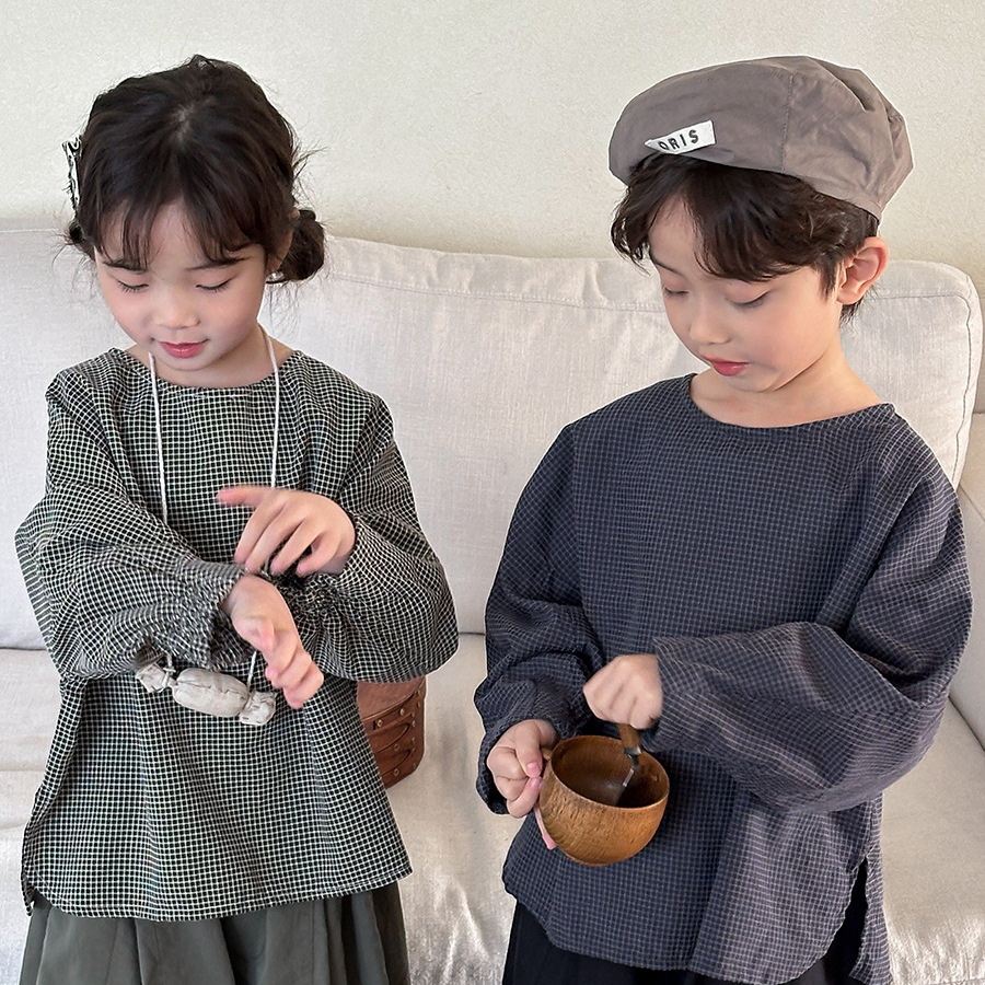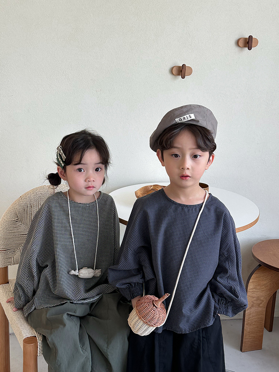 Jiaye 어린이 2025 년 봄 새 도착 소년 소녀 용 고급 체크 무늬 긴팔 탑 아기의 둥근 목 박쥐-소매 티셔츠스토어 가기