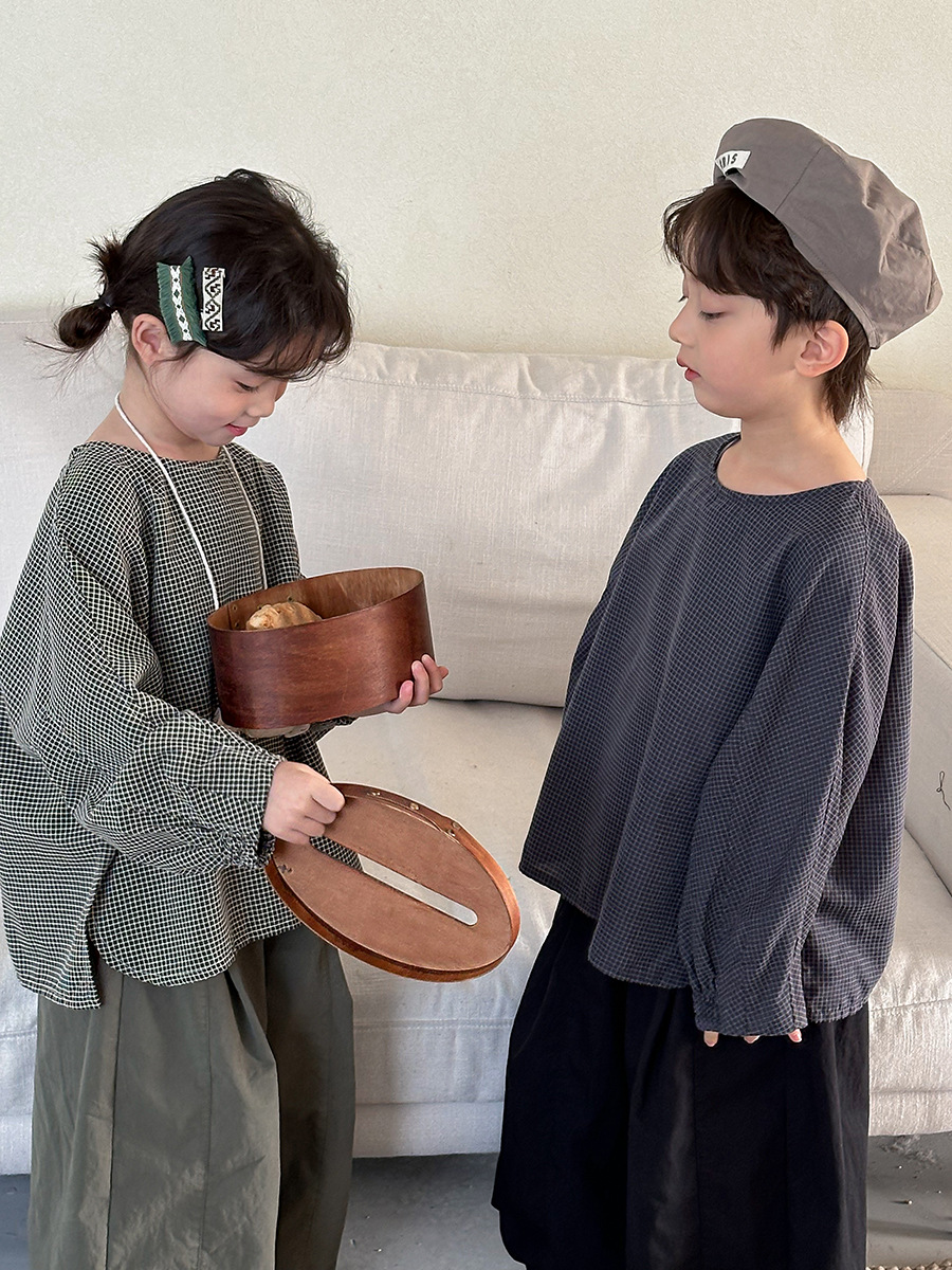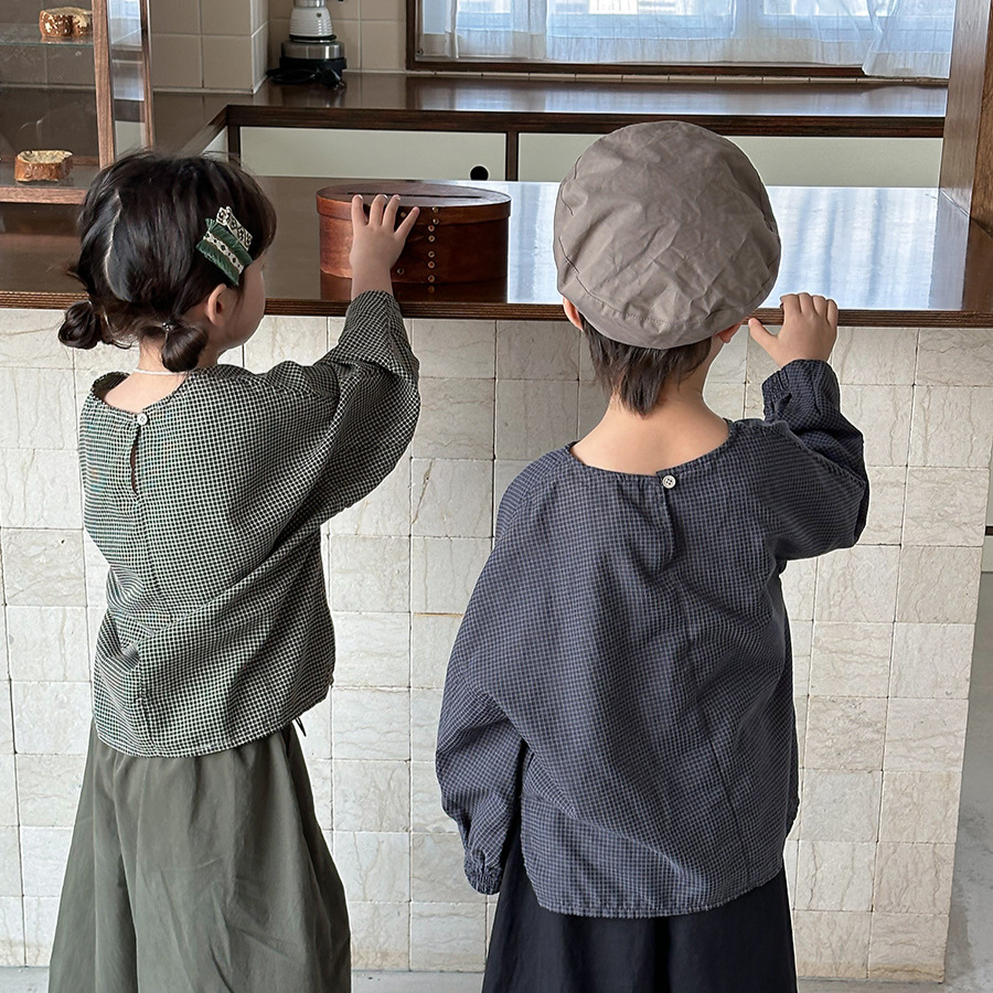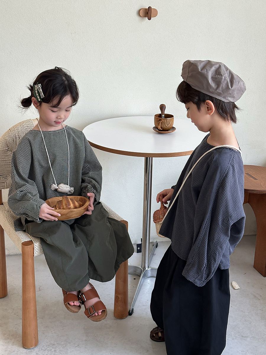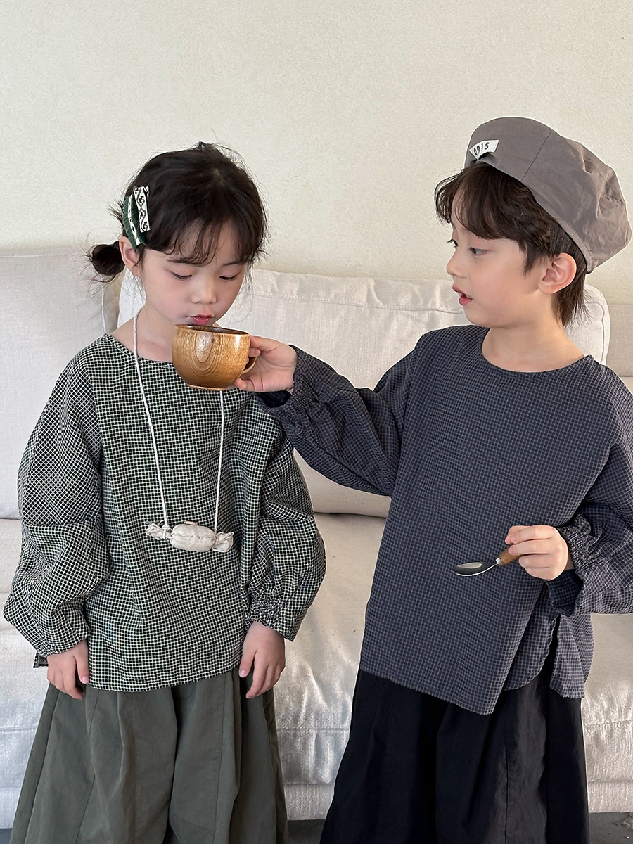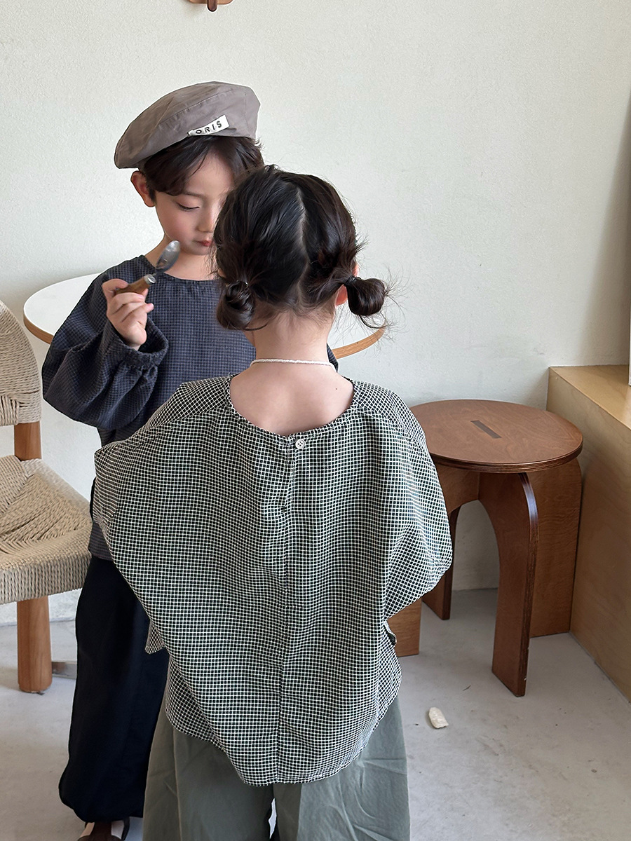 Jiaye 어린이 2025 년 봄 새 도착 소년 소녀 용 고급 체크 무늬 긴팔 탑 아기의 둥근 목 박쥐-소매 티셔츠스토어 가기
