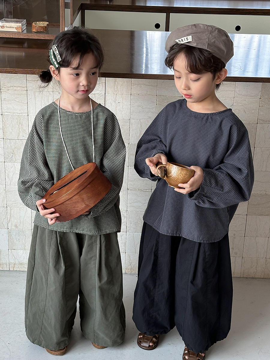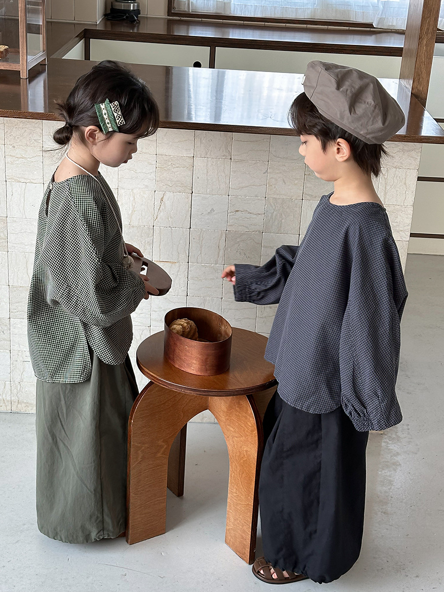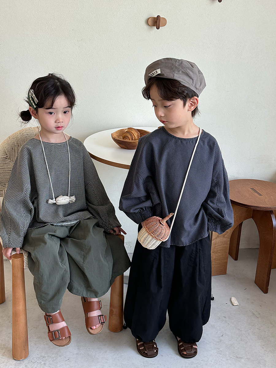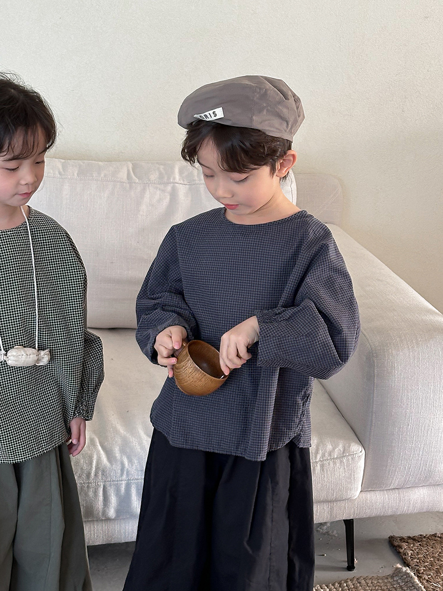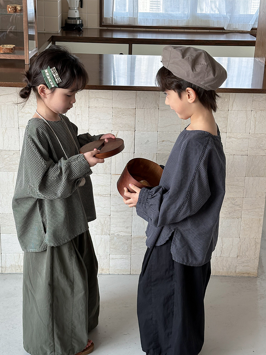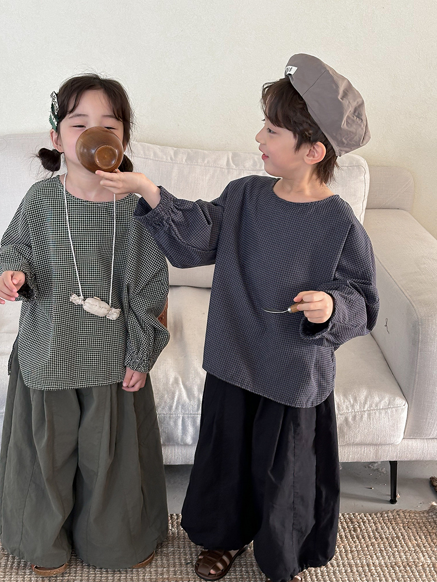 Jiaye 어린이 2025 년 봄 새 도착 소년 소녀 용 고급 체크 무늬 긴팔 탑 아기의 둥근 목 박쥐-소매 티셔츠스토어 가기