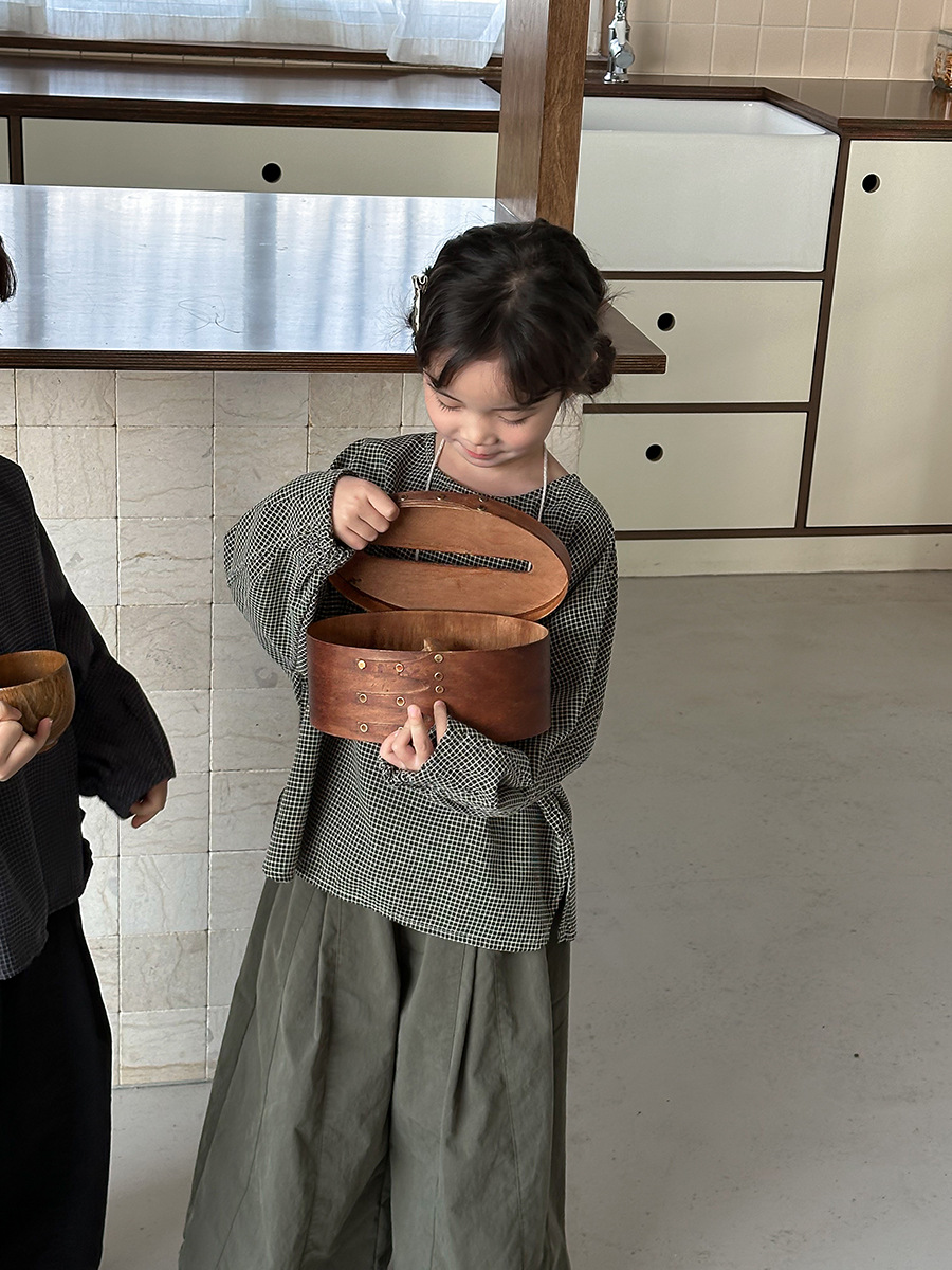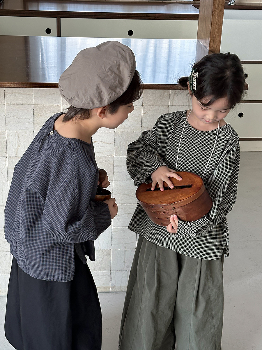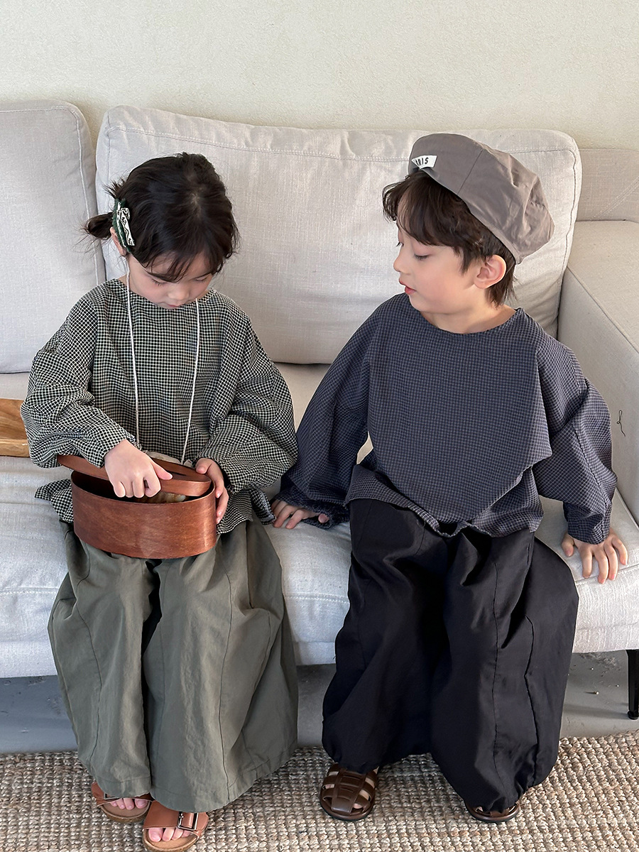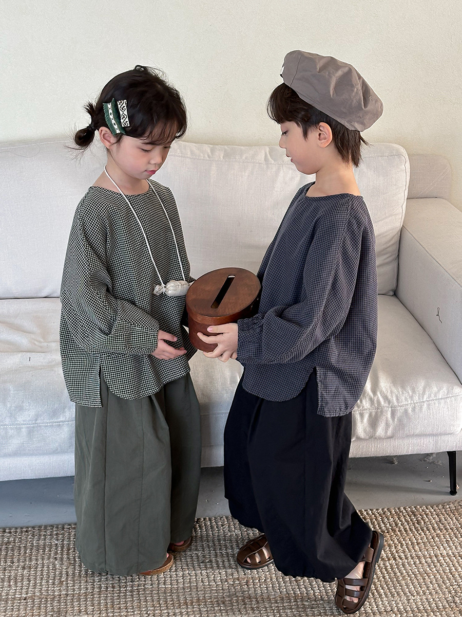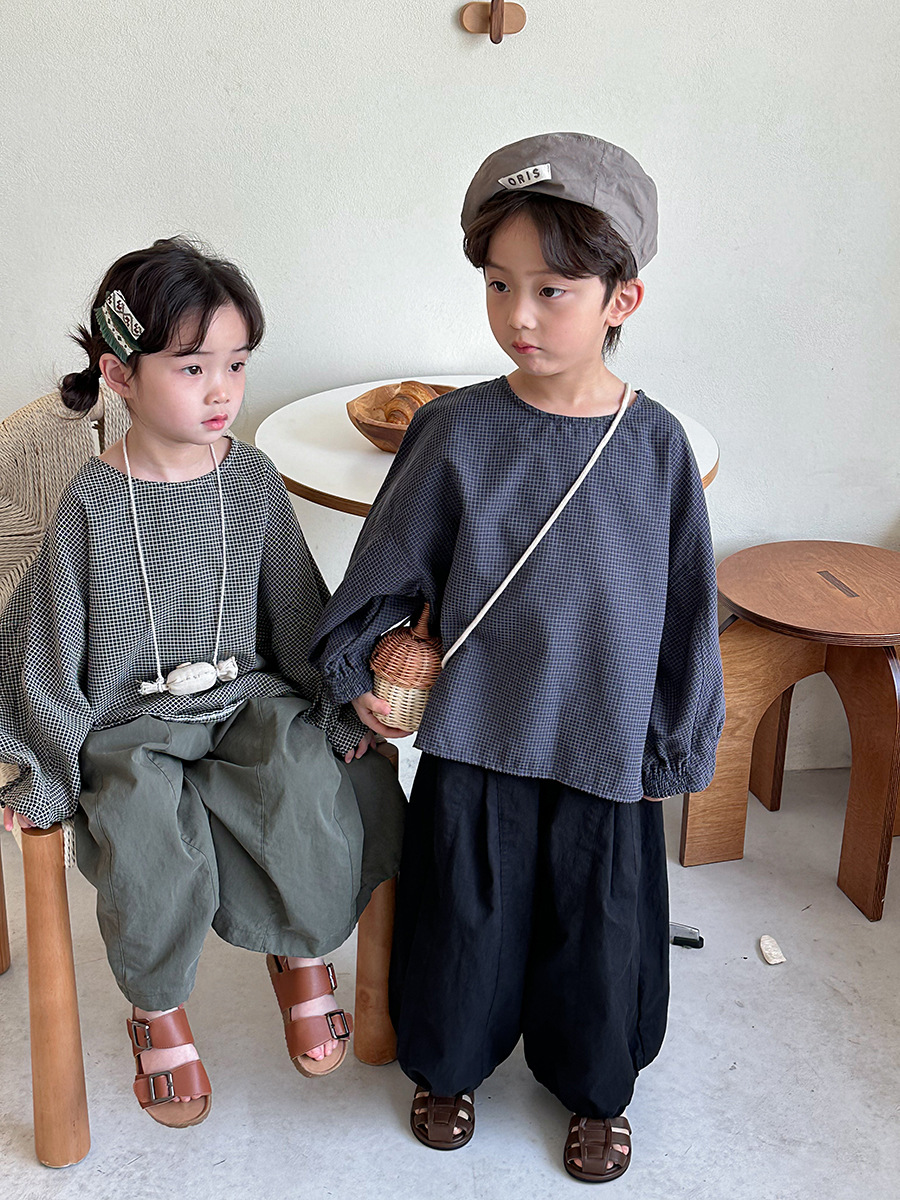 Jiaye 어린이 2025 년 봄 새 도착 소년 소녀 용 고급 체크 무늬 긴팔 탑 아기의 둥근 목 박쥐-소매 티셔츠스토어 가기