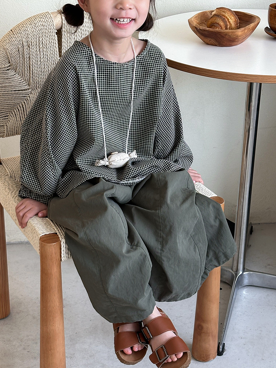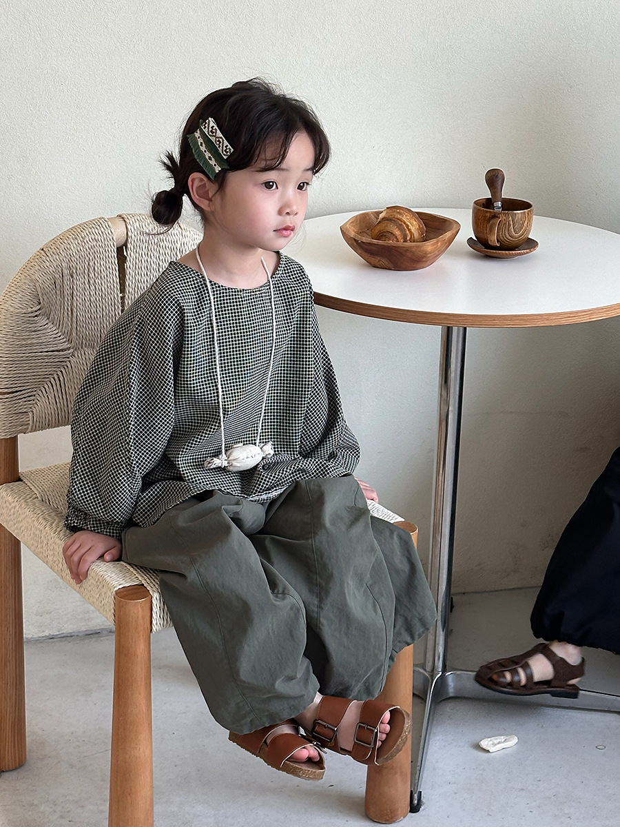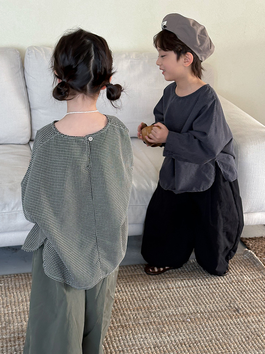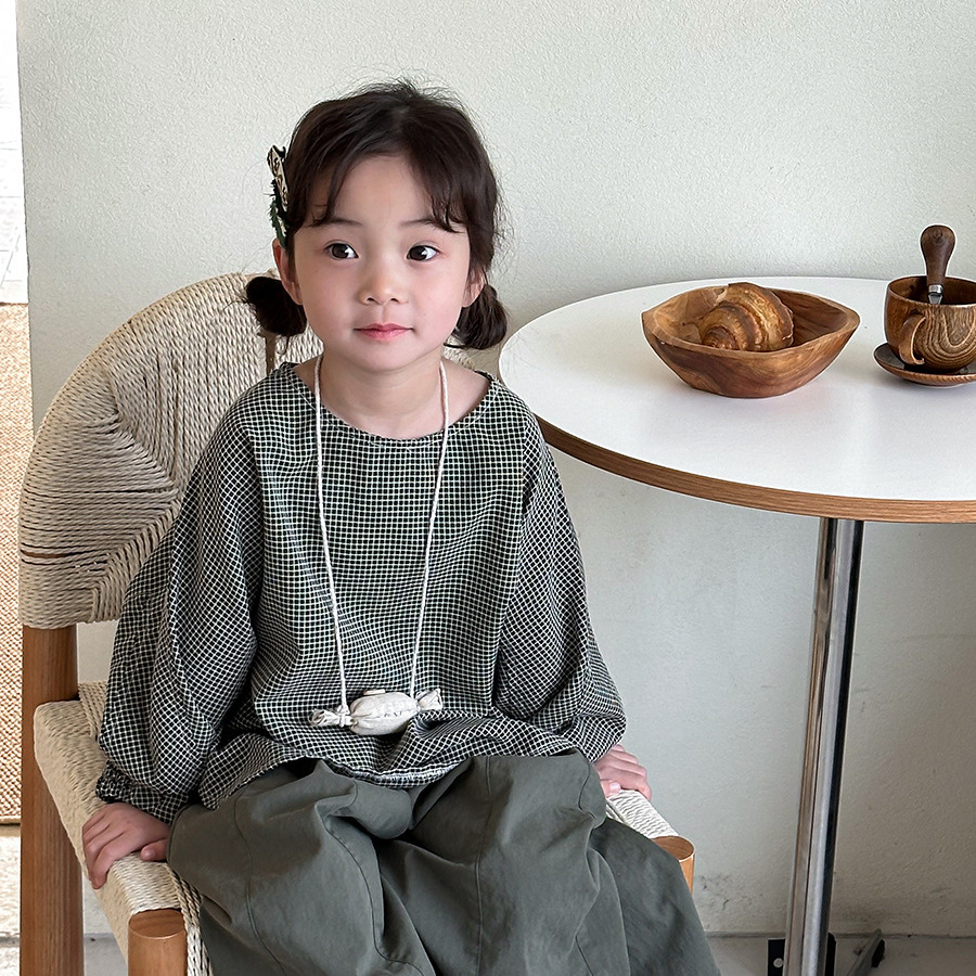 Jiaye 어린이 2025 년 봄 새 도착 소년 소녀 용 고급 체크 무늬 긴팔 탑 아기의 둥근 목 박쥐-소매 티셔츠