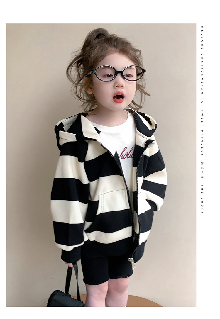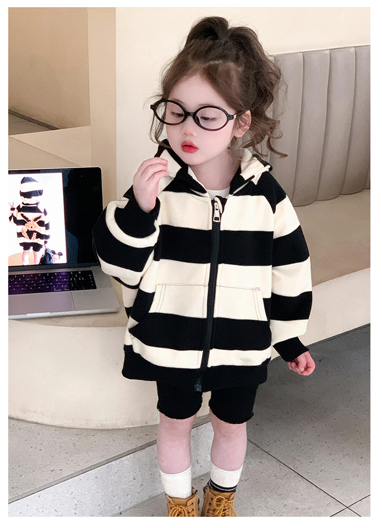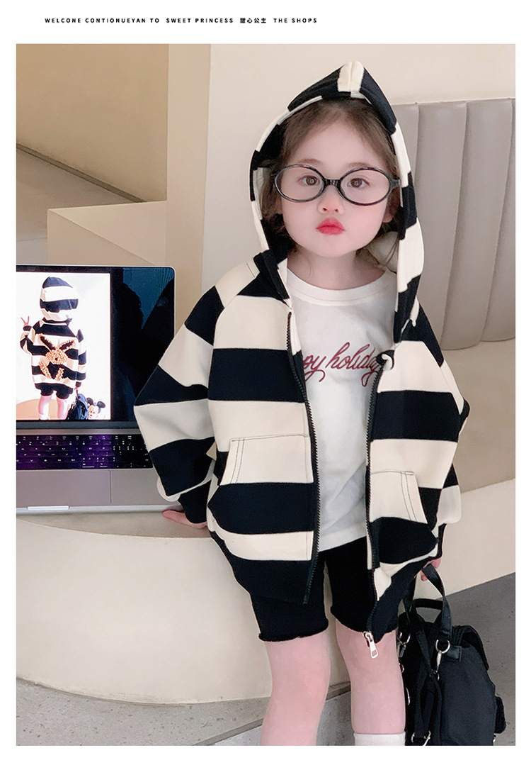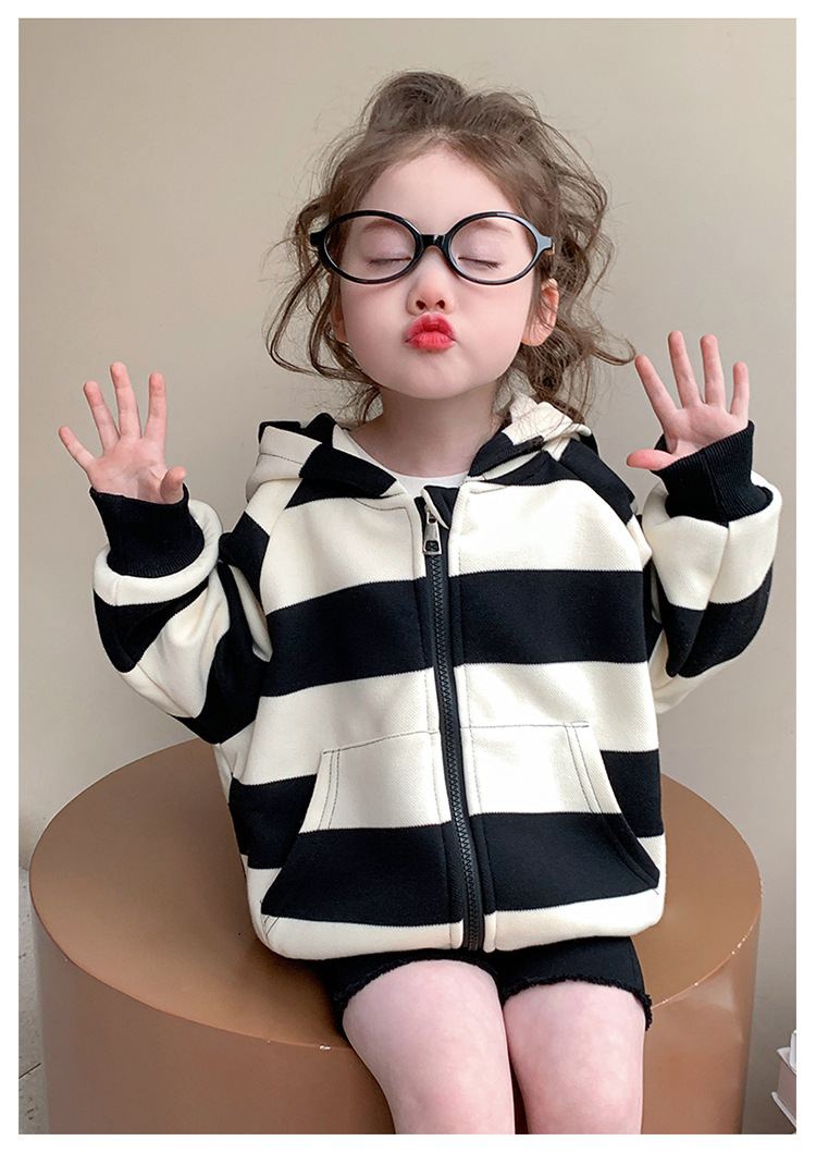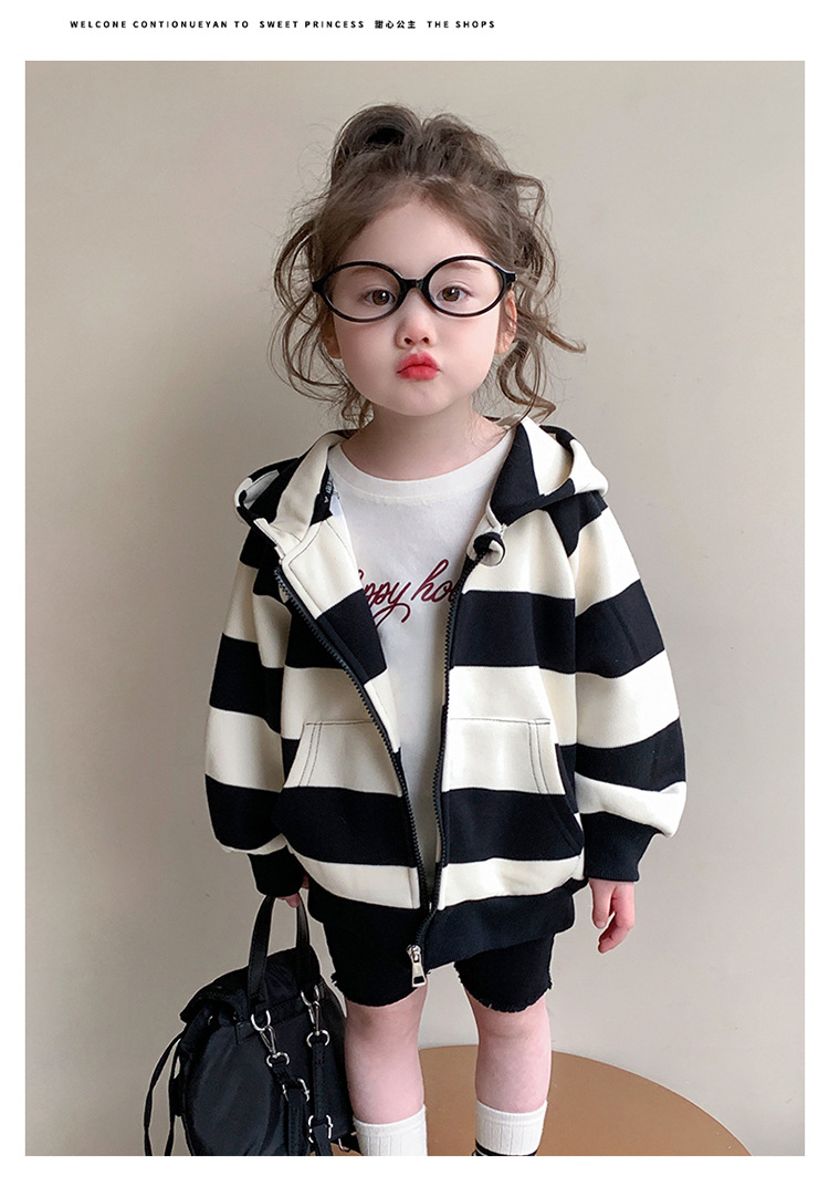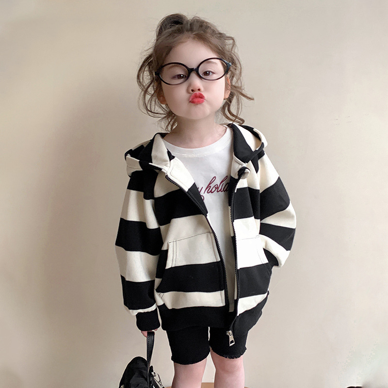 소녀 스웨트 코트 2025 봄 새로운 서양식 어린이 흑백 줄무늬 후드 카디건 아기 만화 탑스토어 가기