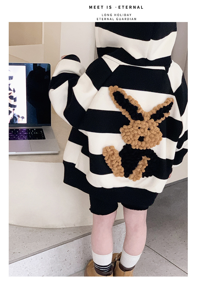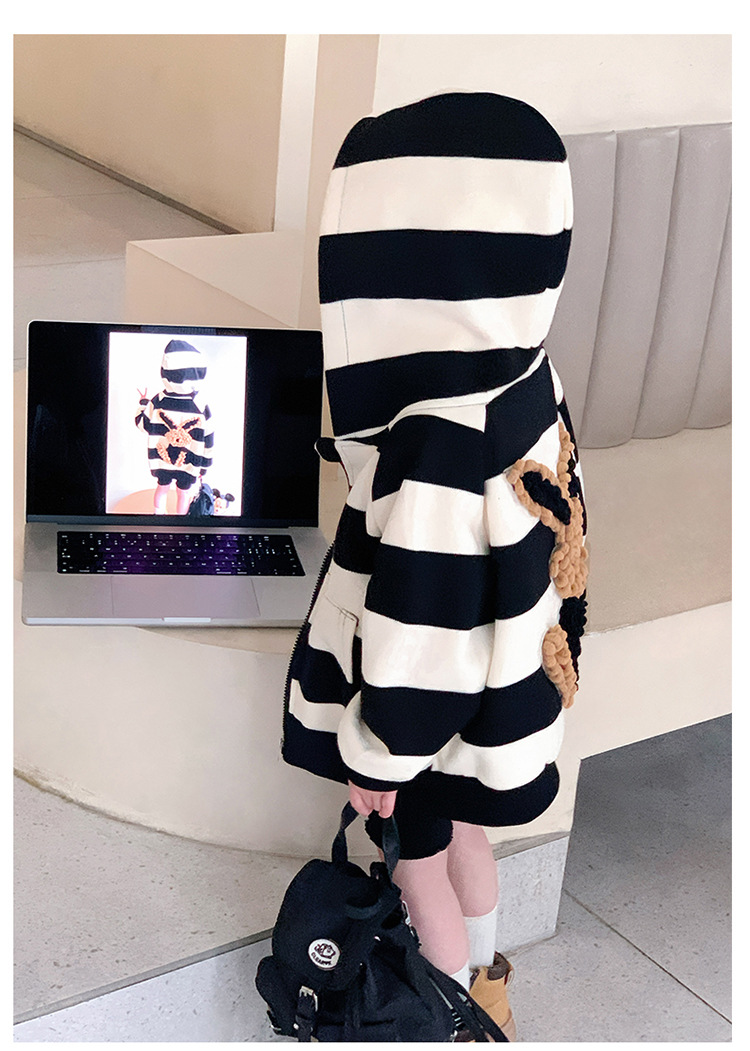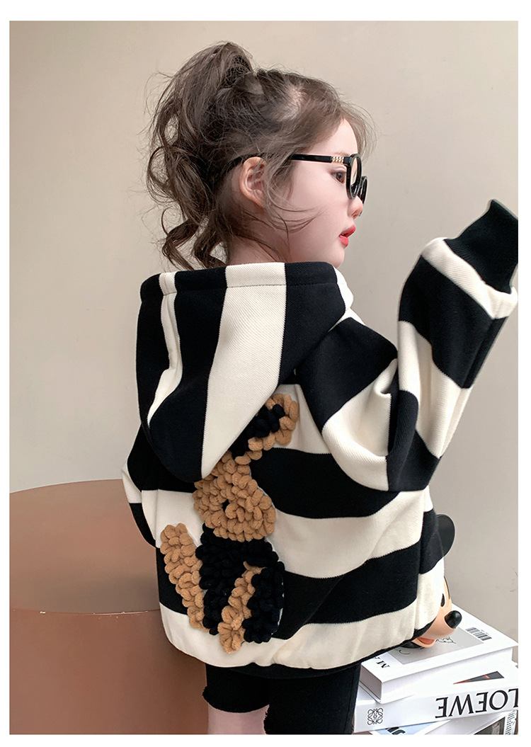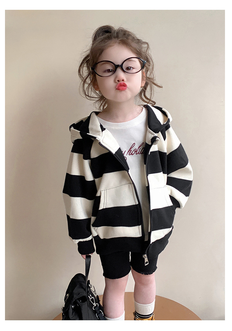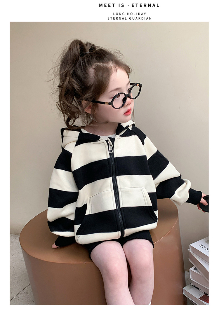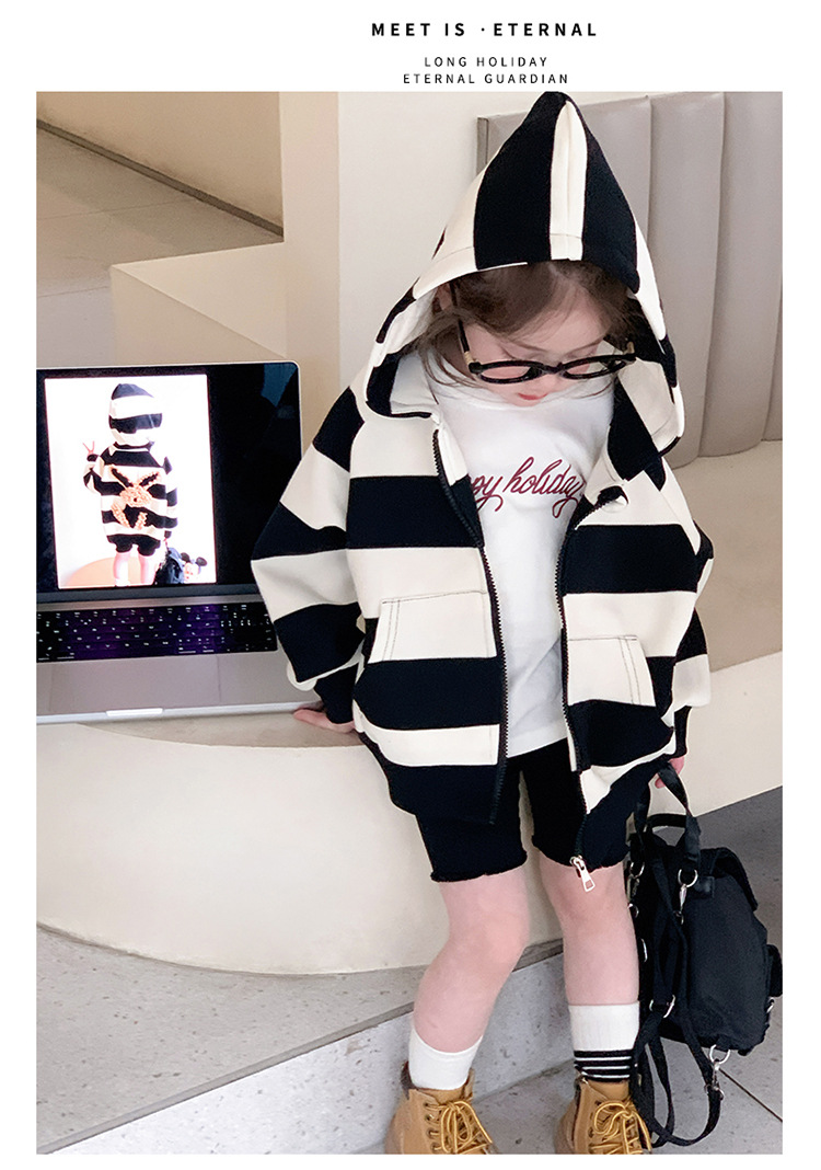 소녀 스웨트 코트 2025 봄 새로운 서양식 어린이 흑백 줄무늬 후드 카디건 아기 만화 탑스토어 가기