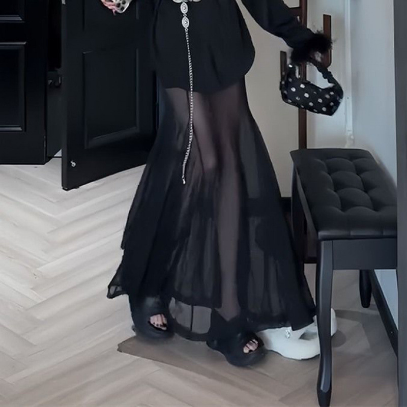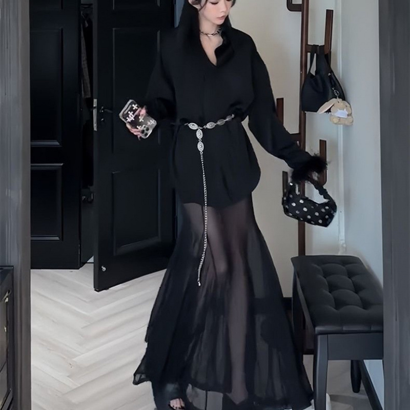 하이 엔드 레트로 핫 걸 블랙 세트 여성의 봄과 여름 새로운 느슨한 셔츠 메쉬 바느질 긴 원피스 투피스 세트
