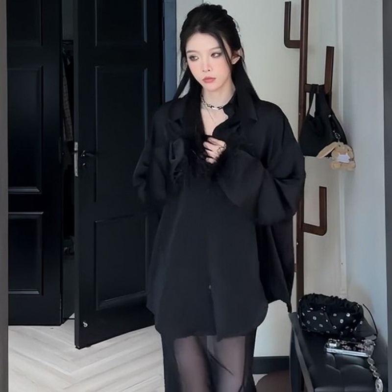 하이 엔드 레트로 핫 걸 블랙 세트 여성의 봄과 여름 새로운 느슨한 셔츠 메쉬 바느질 긴 원피스 투피스 세트스토어 가기