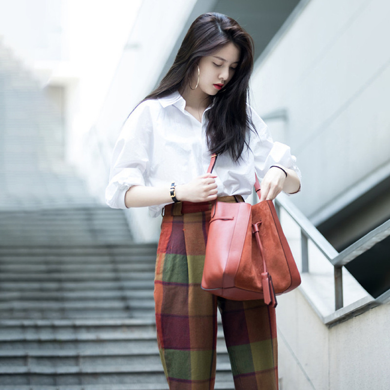 긴 소매 봄과 가을 얇은 흰색 셔츠 중간 길이 웨스턴 스타일 여성의 느슨한 게으른 슬리밍 디자인 센스 니쉬 순수 코튼 가을