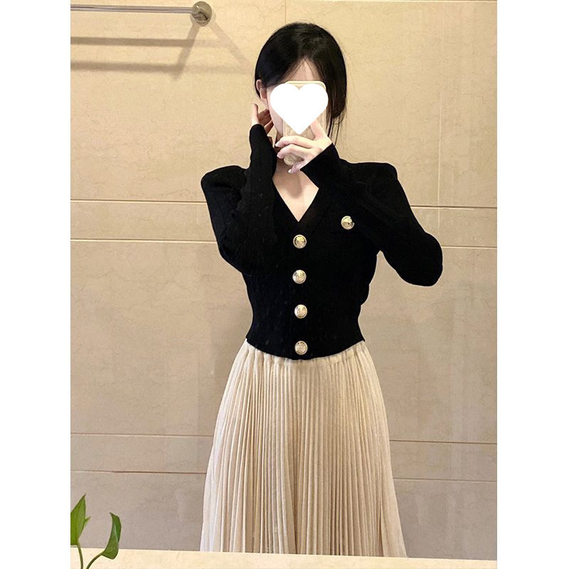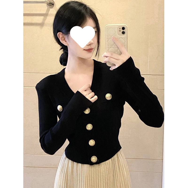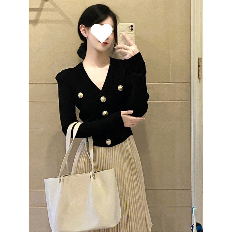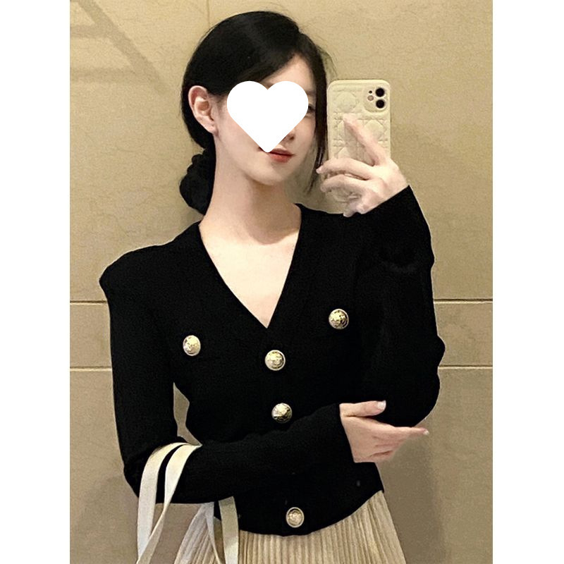 프랑스 스타일 블랙 V 넥 샤오 샹 사교계 스타일 니트 카디건 여성 가을 및 겨울 외부 스웨터 코트 베이스 셔츠 탑스토어 가기