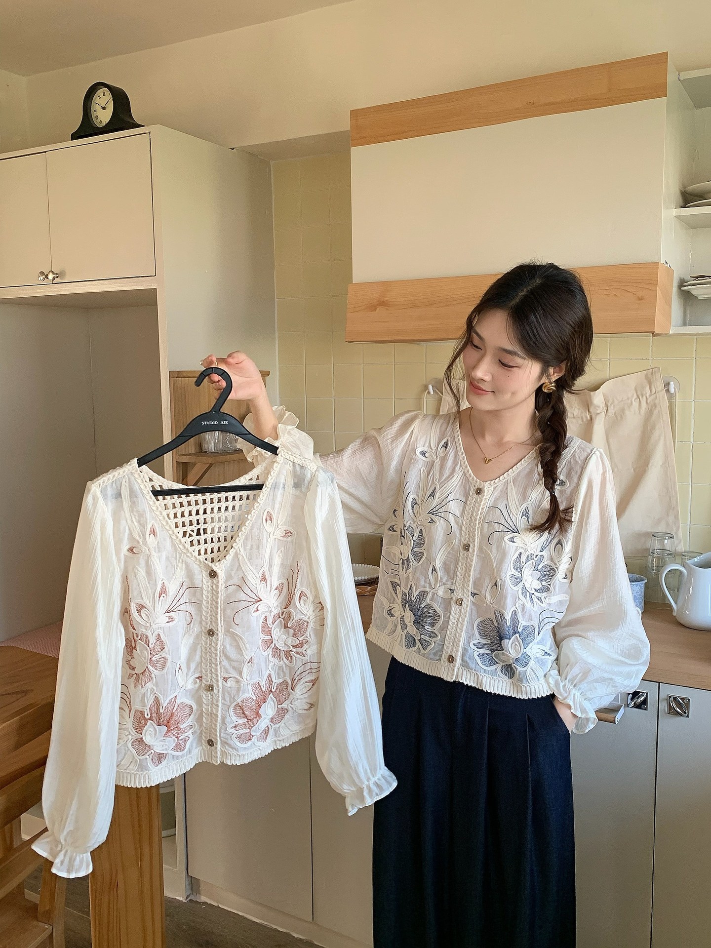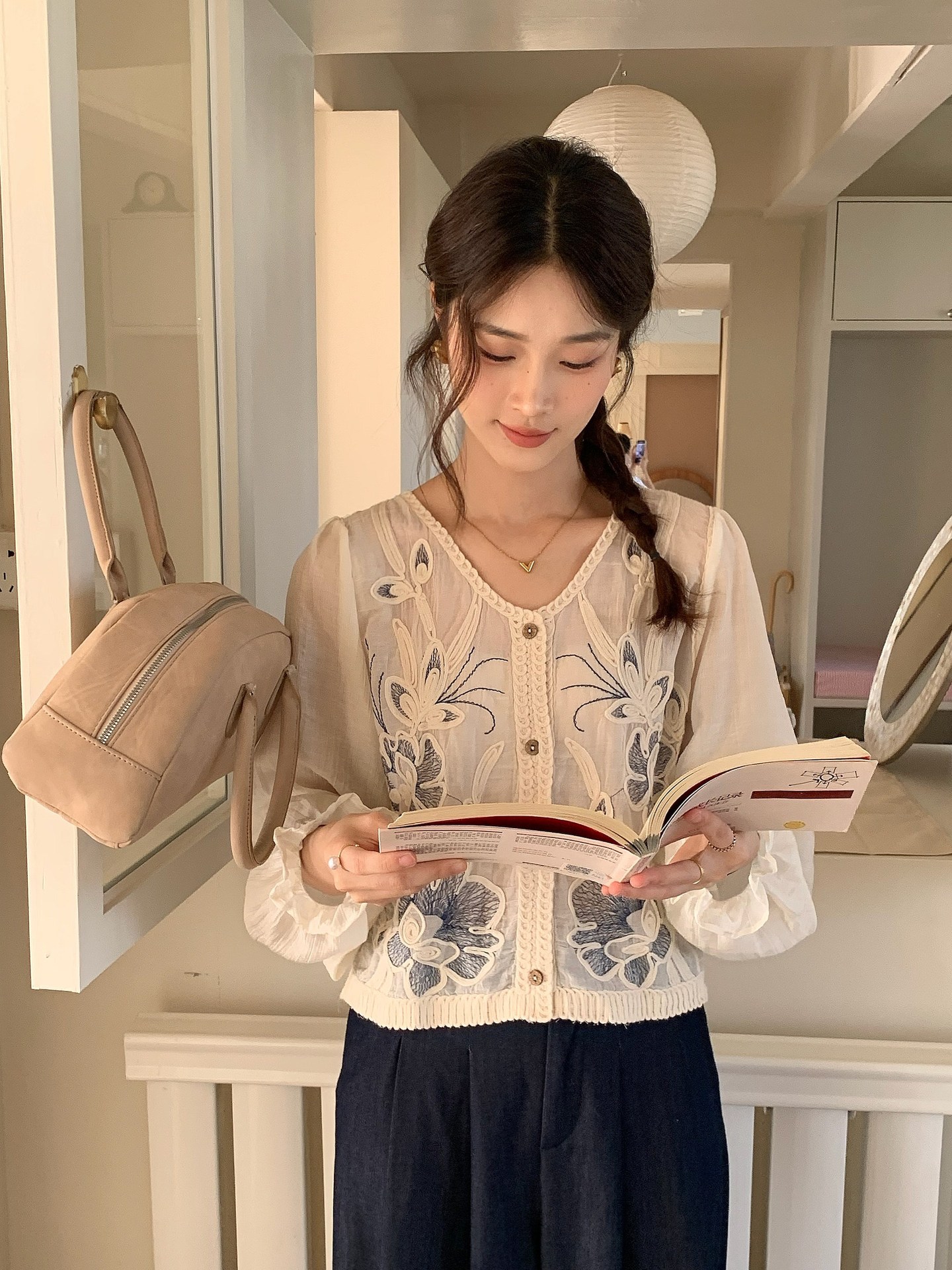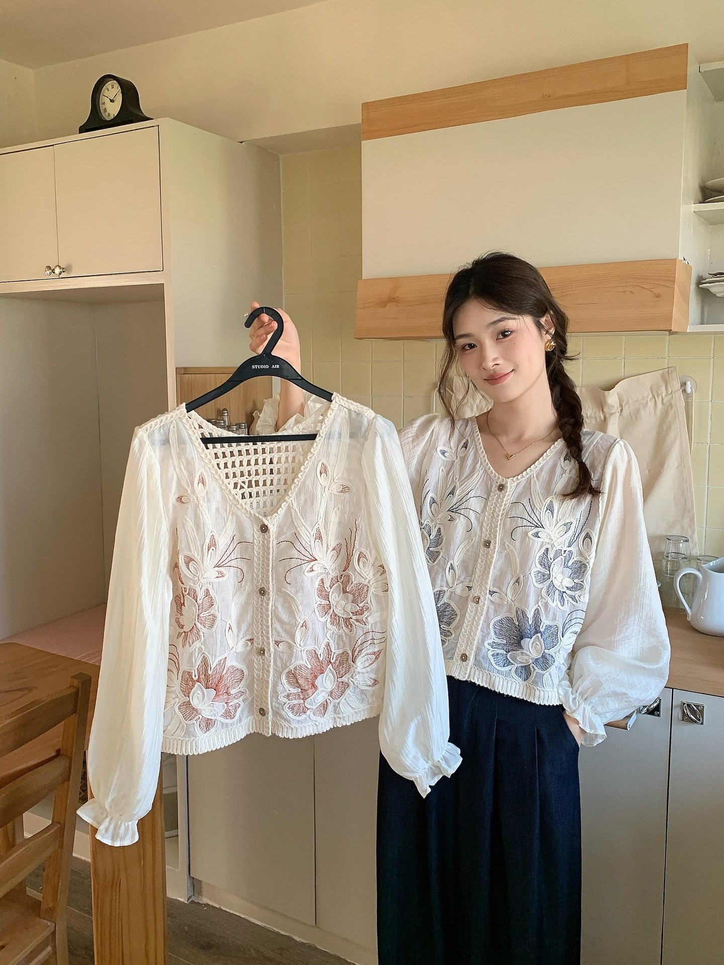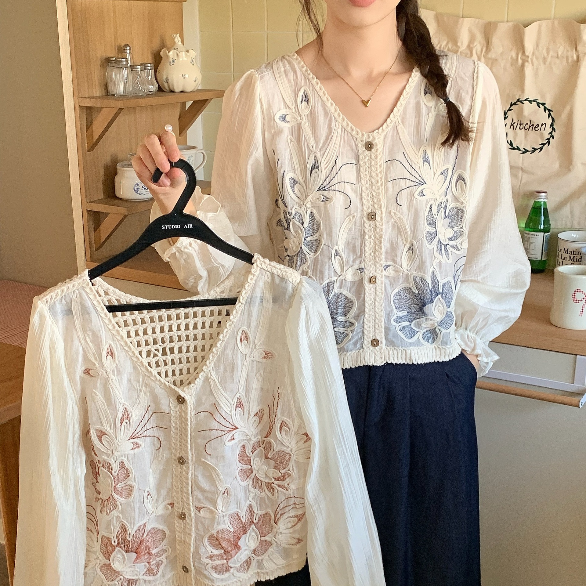 리얼 샷 2025 봄 새로운 프랑스 셔츠 여성 디자인 센스 중공 크로 셰 뜨개질 스티칭 쉬폰 긴 소매 최고 여성스토어 가기
