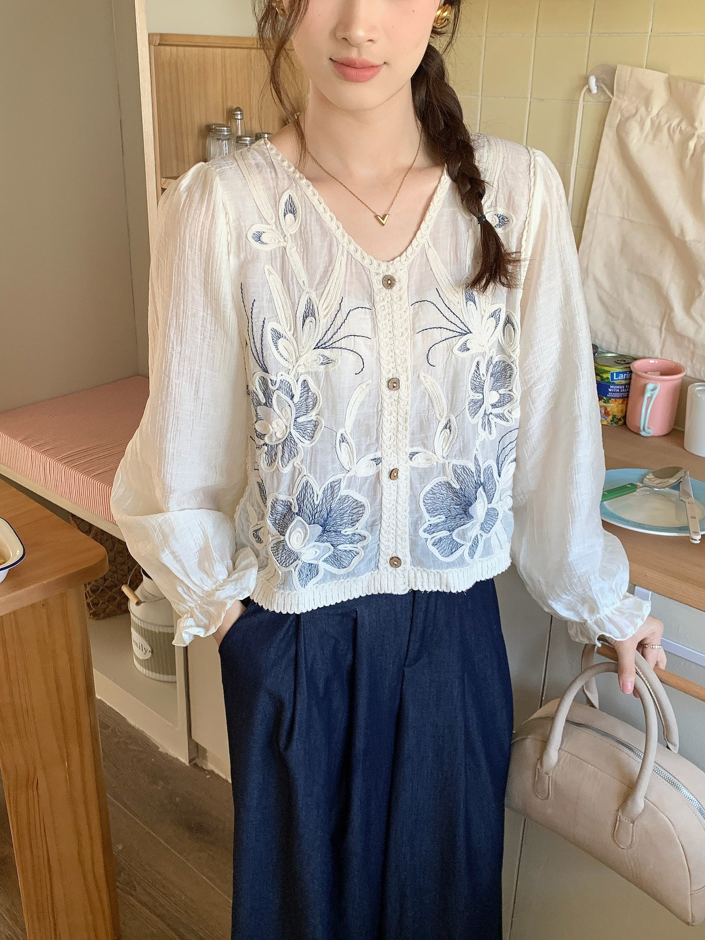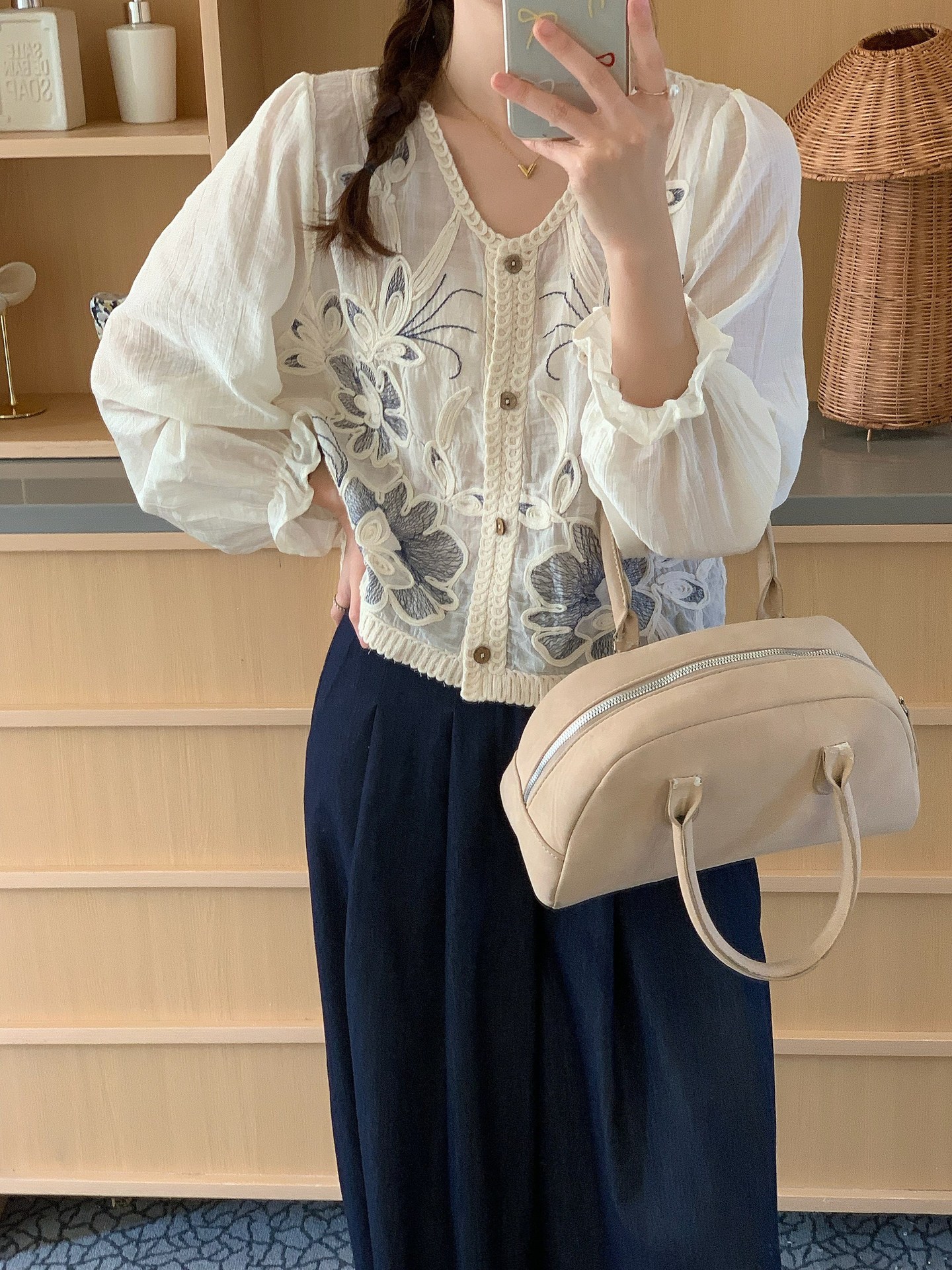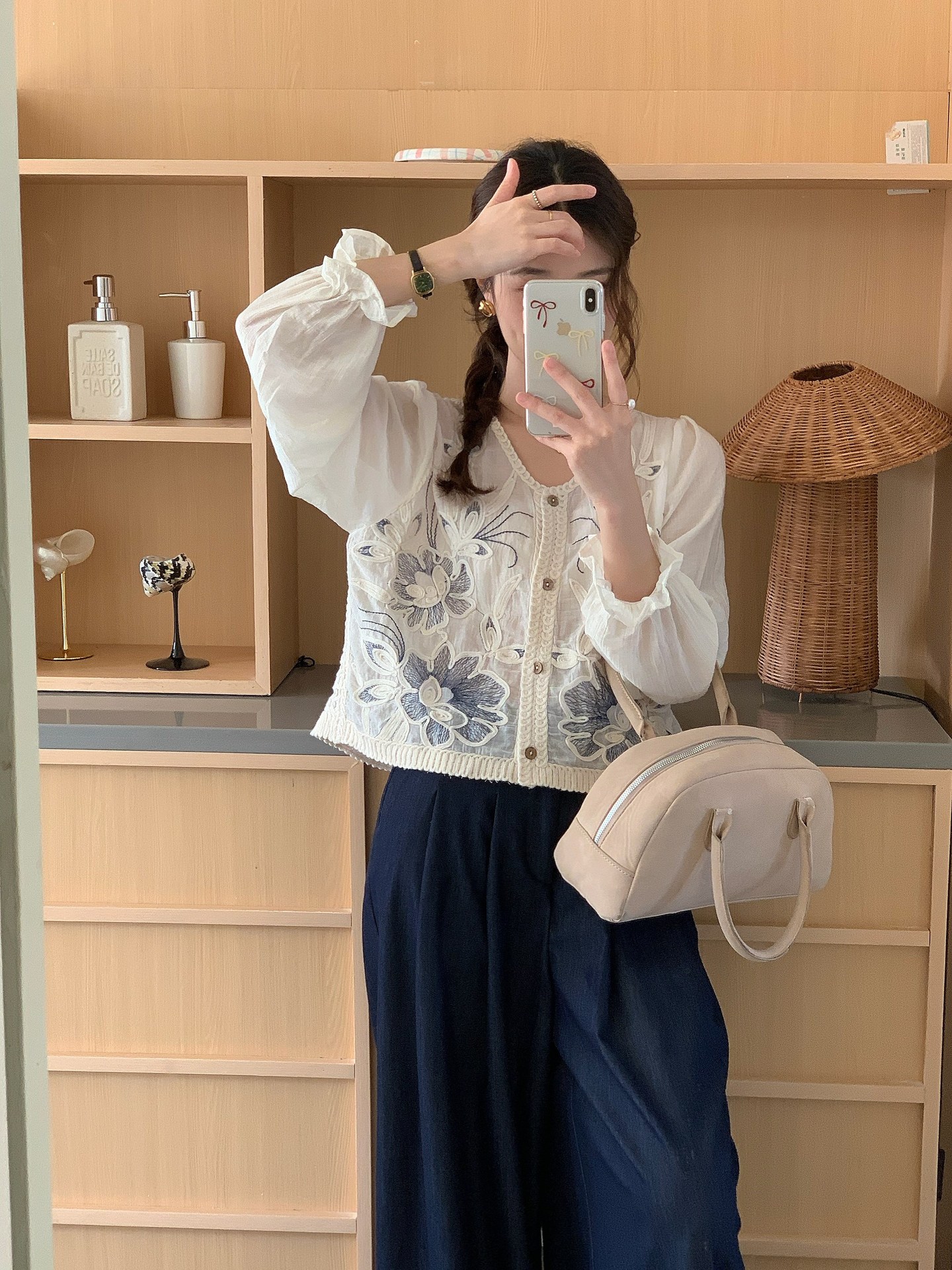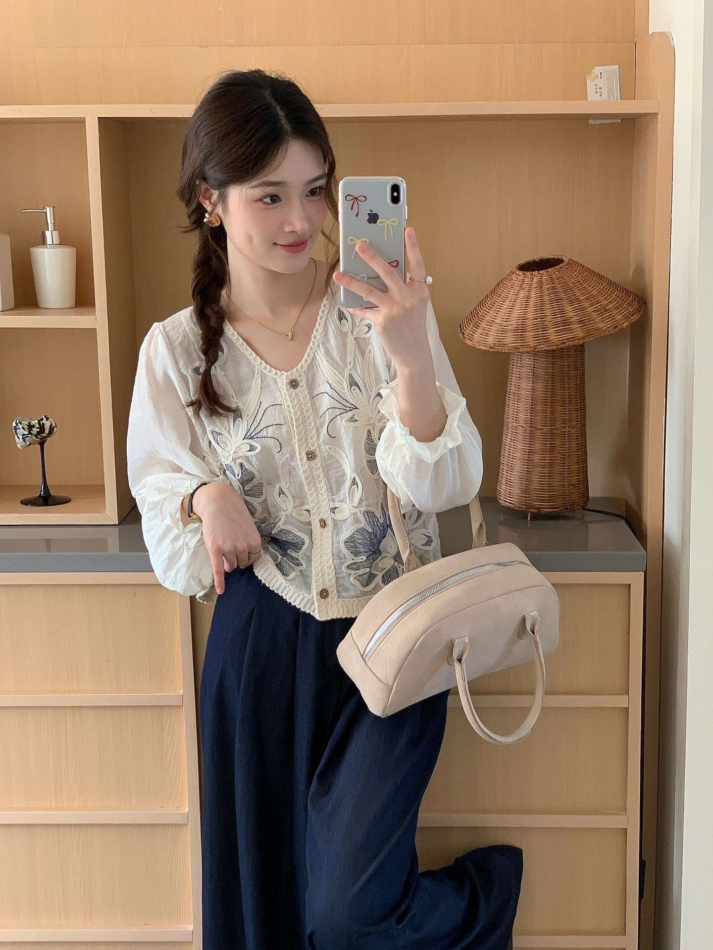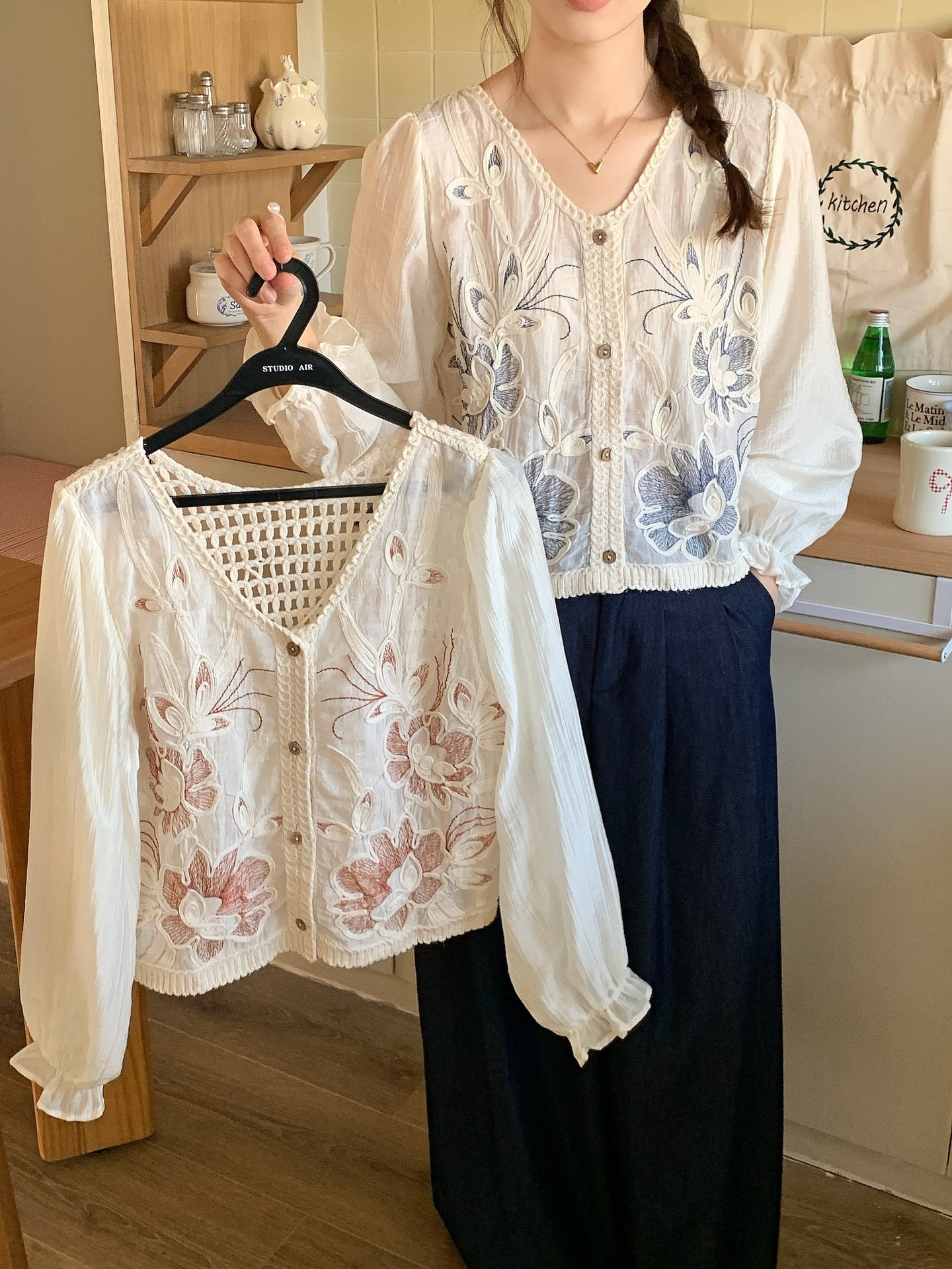 리얼 샷 2025 봄 새로운 프랑스 셔츠 여성 디자인 센스 중공 크로 셰 뜨개질 스티칭 쉬폰 긴 소매 최고 여성스토어 가기