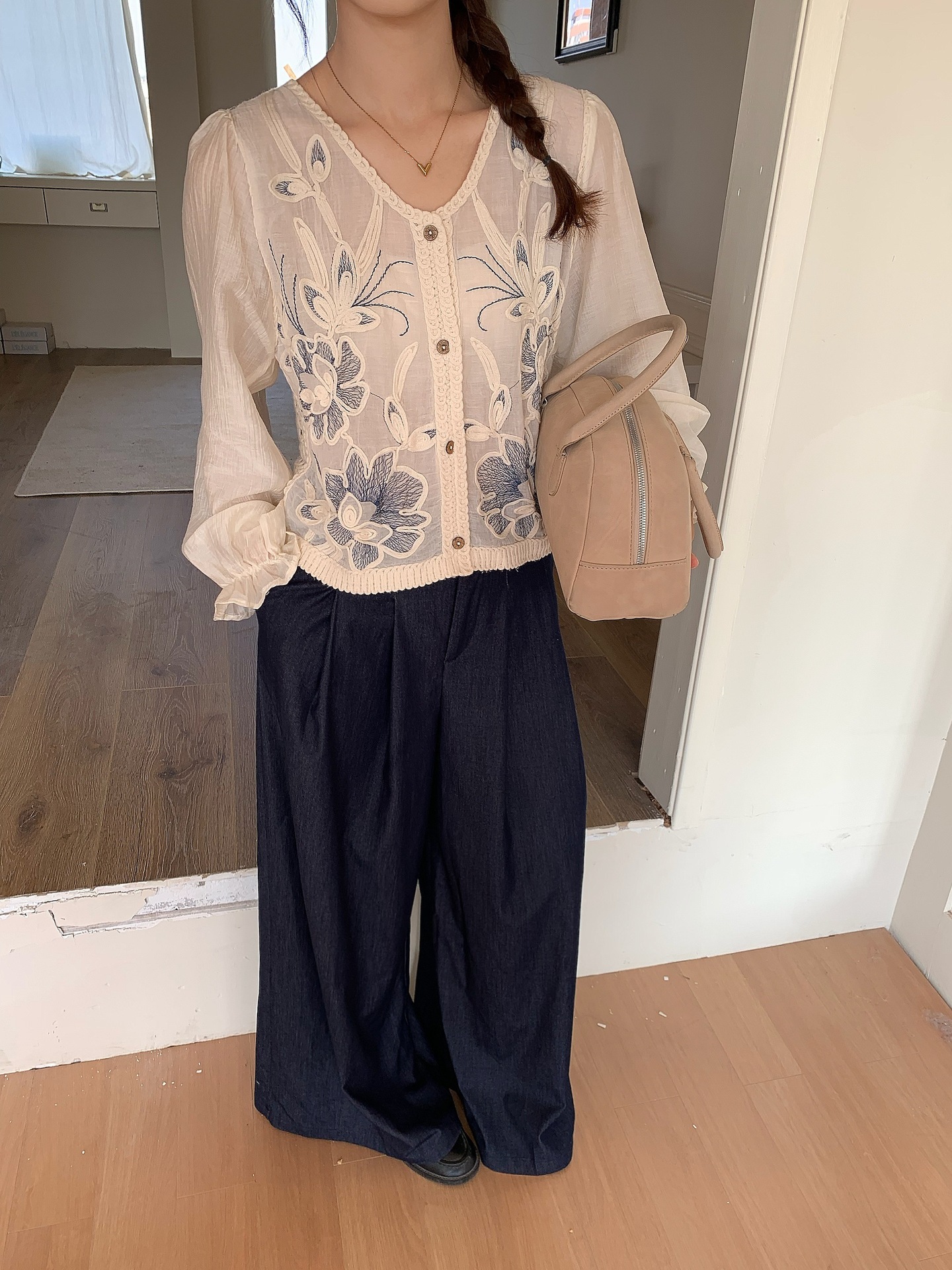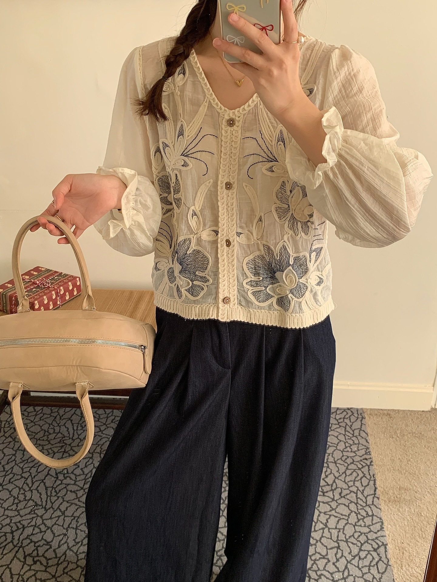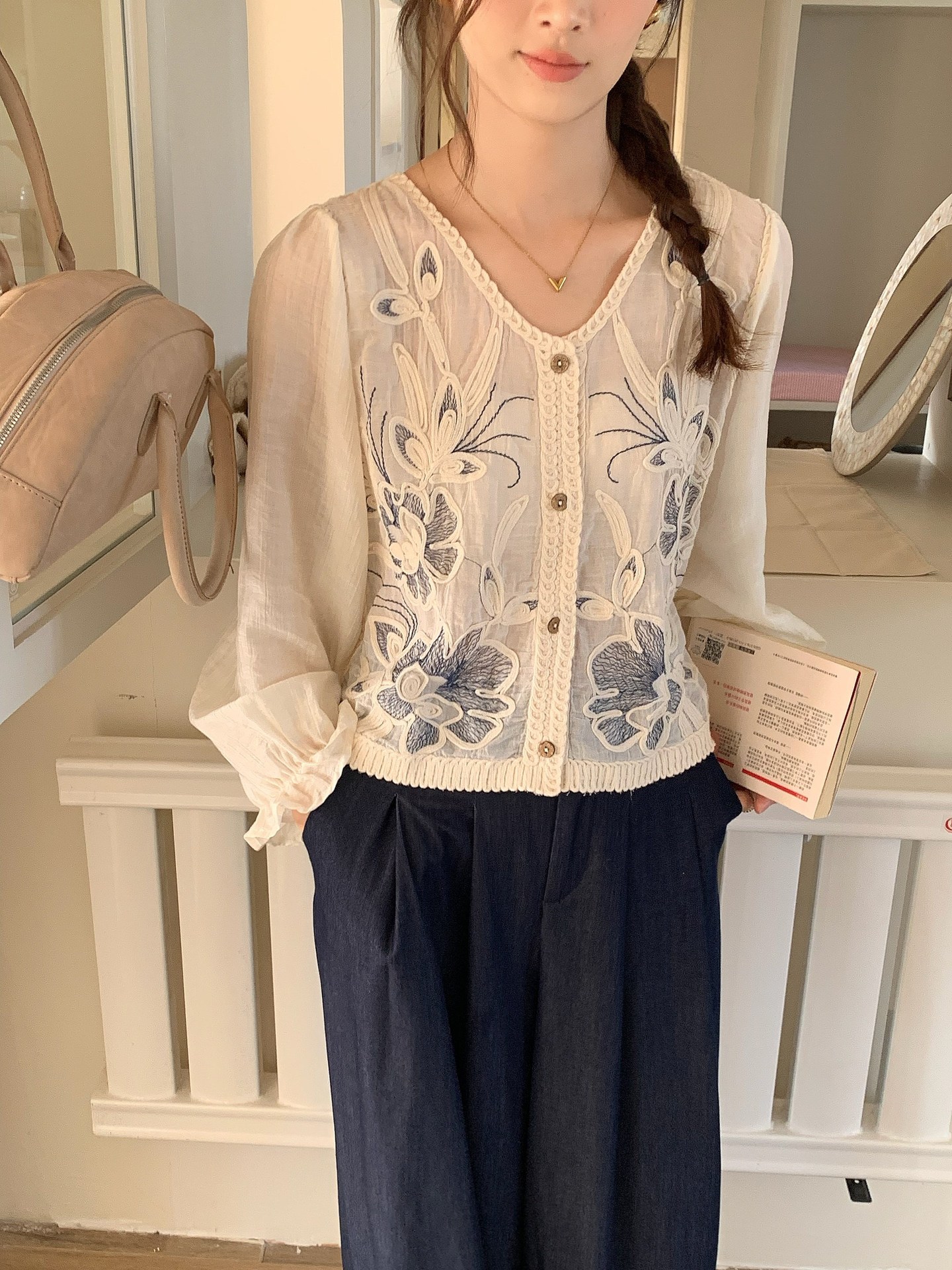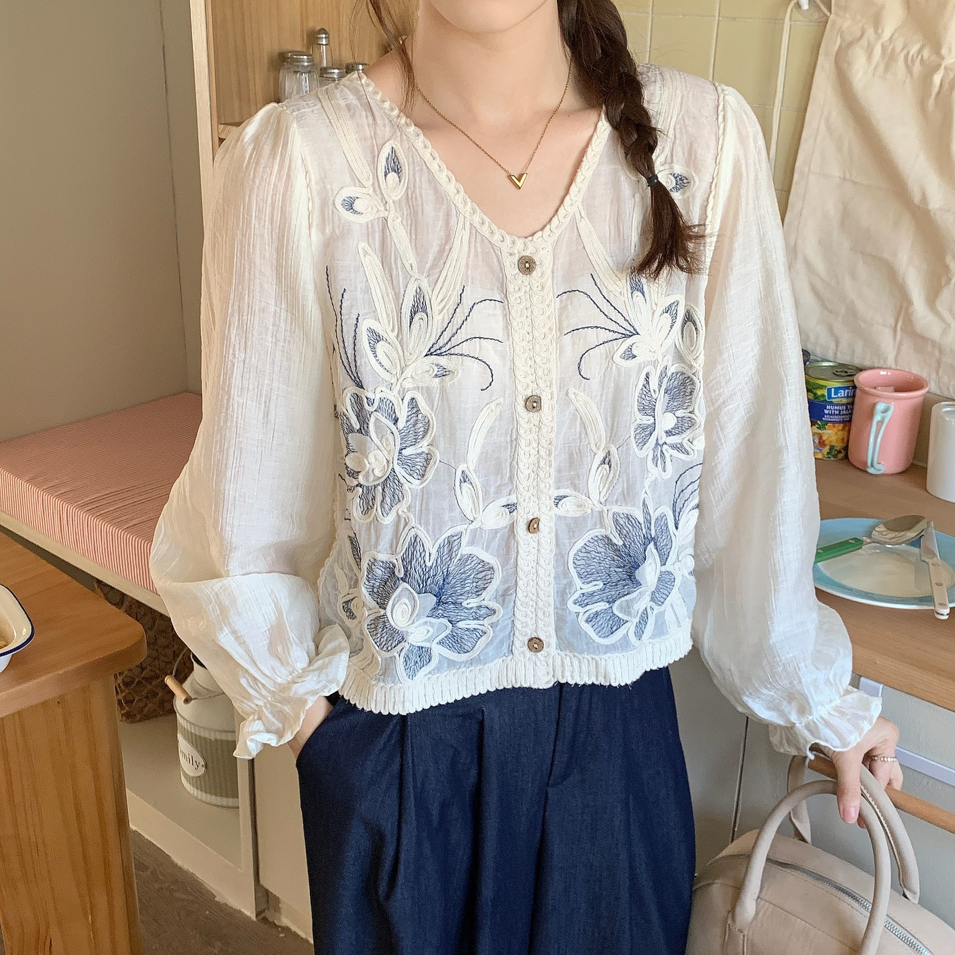 리얼 샷 2025 봄 새로운 프랑스 셔츠 여성 디자인 센스 중공 크로 셰 뜨개질 스티칭 쉬폰 긴 소매 최고 여성스토어 가기