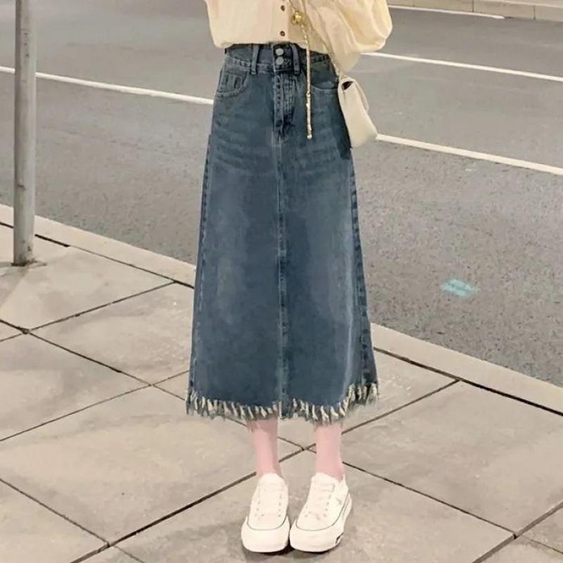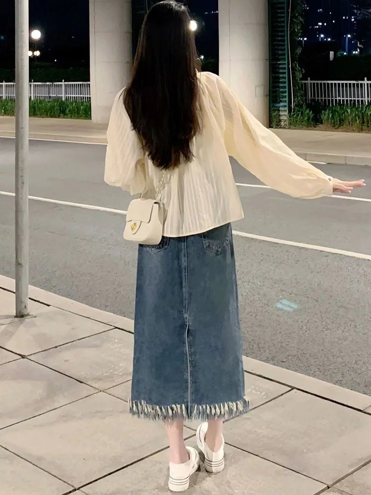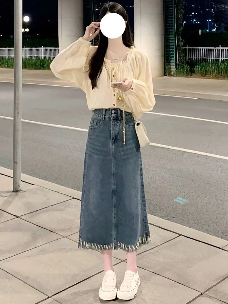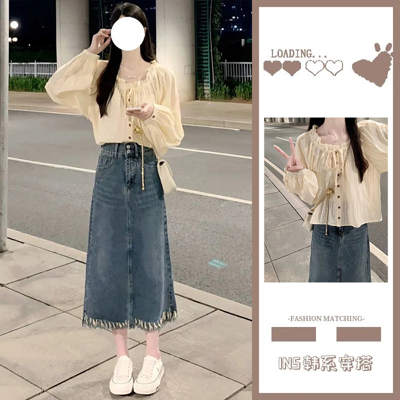 고급 나무 귀 아름다운 셔츠 데님 긴 치마 투피스 프랑스 달콤한 기질은 완전한 세트를 착용합니다.스토어 가기