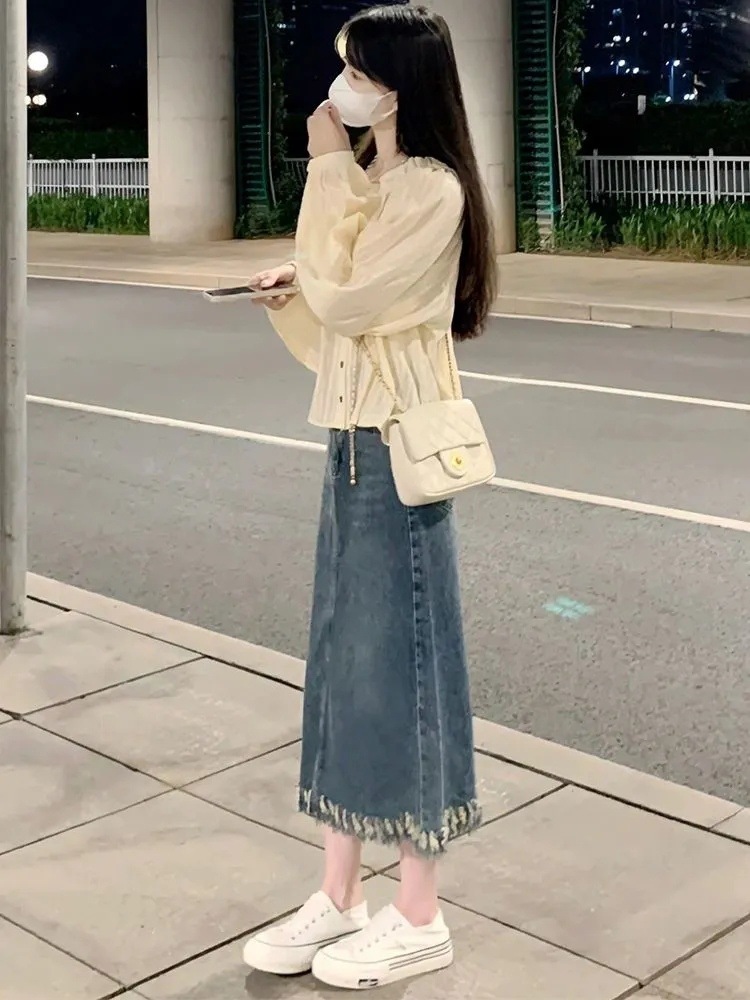 • 투피스 세트 [데님 스커트 + 연노랑 셔츠]