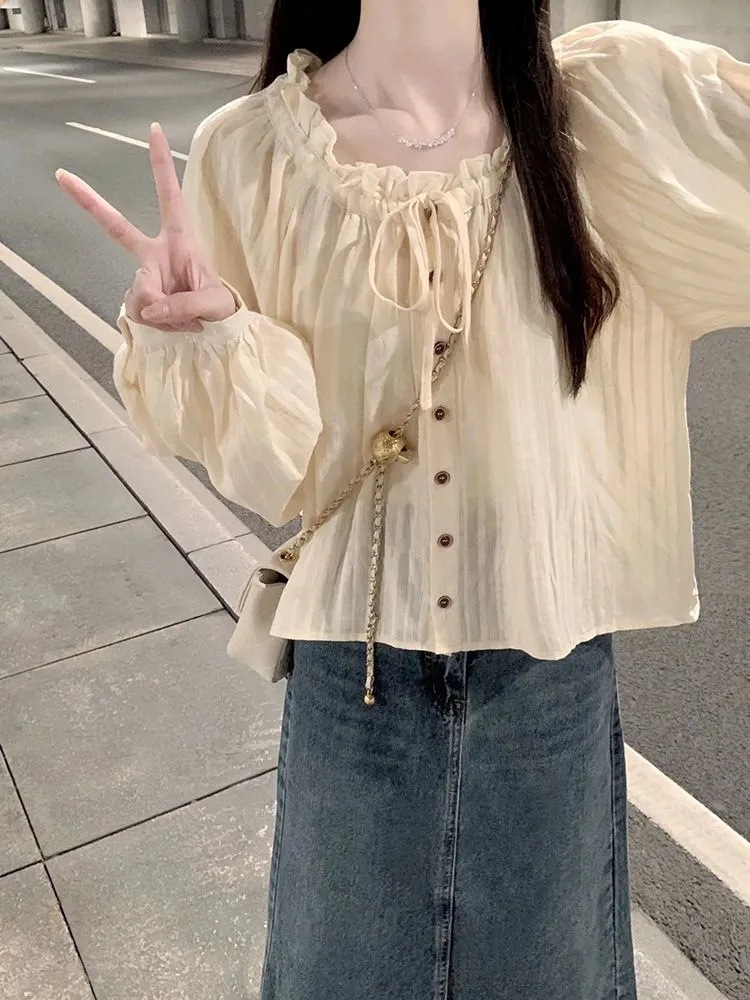 고급 나무 귀 아름다운 셔츠 데님 긴 치마 투피스 프랑스 달콤한 기질은 완전한 세트를 착용합니다.