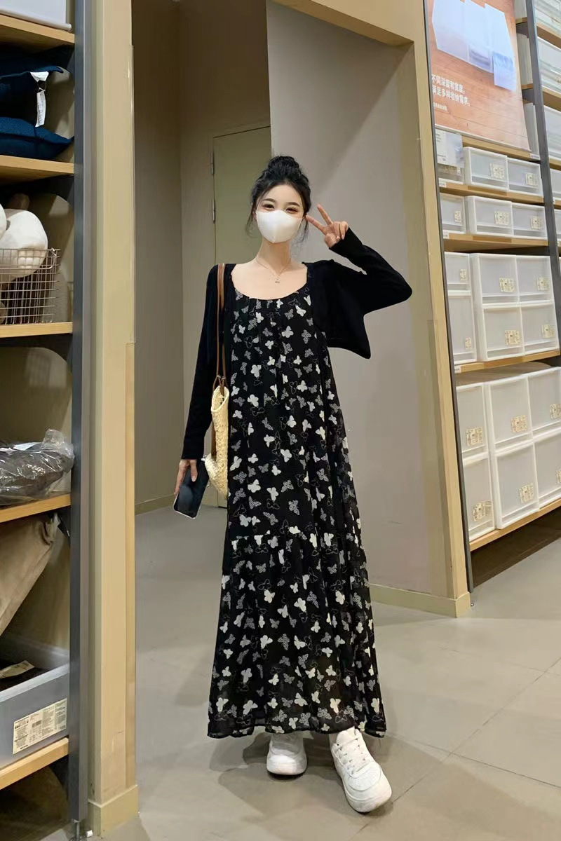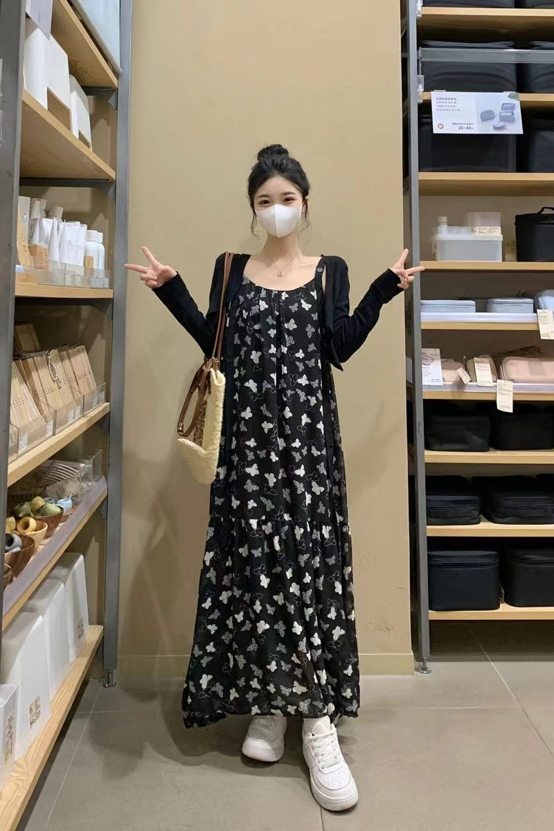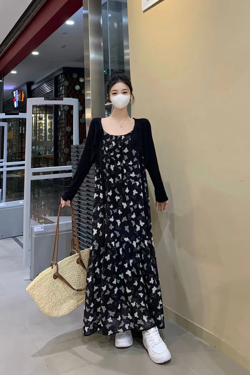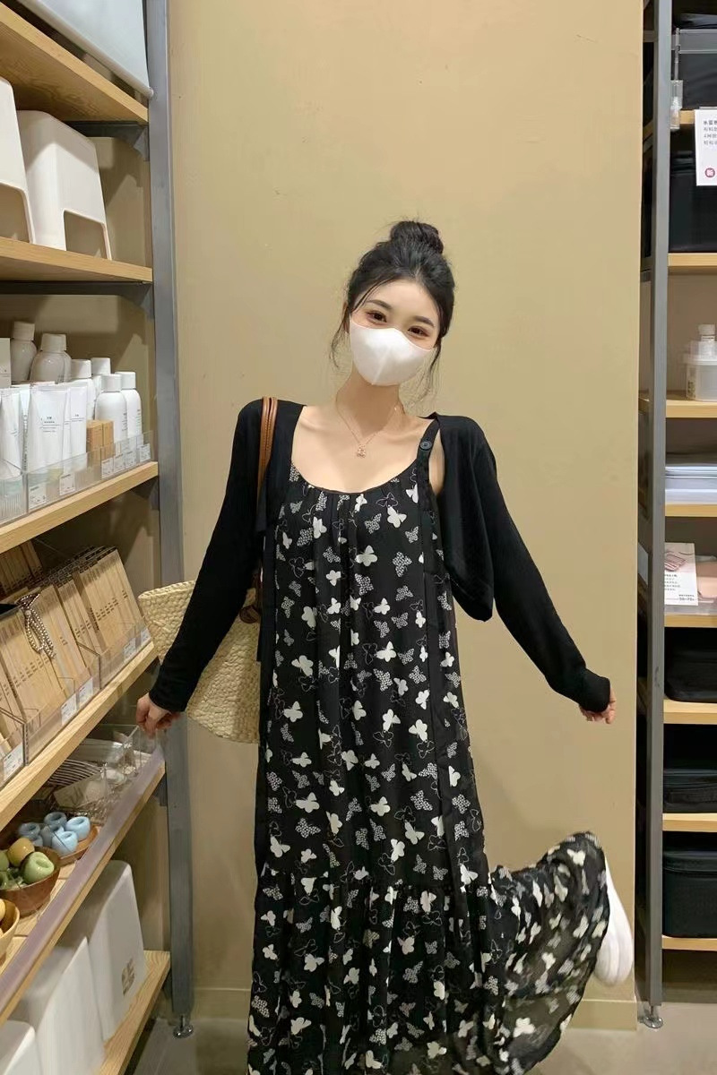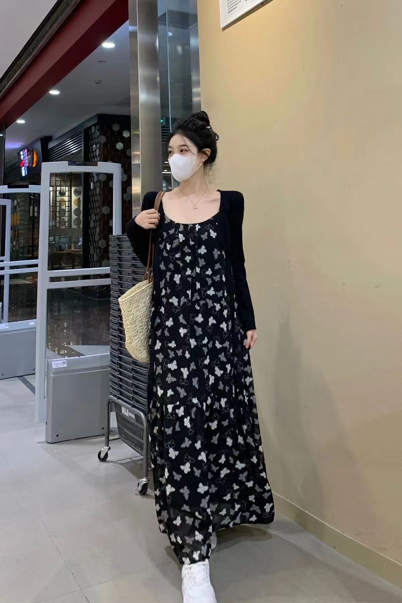 슬리밍 디자인 센스 맘보 나비 우아한 패션 슬링 원피스 카디건 세트 플로랄 2 피스 세트