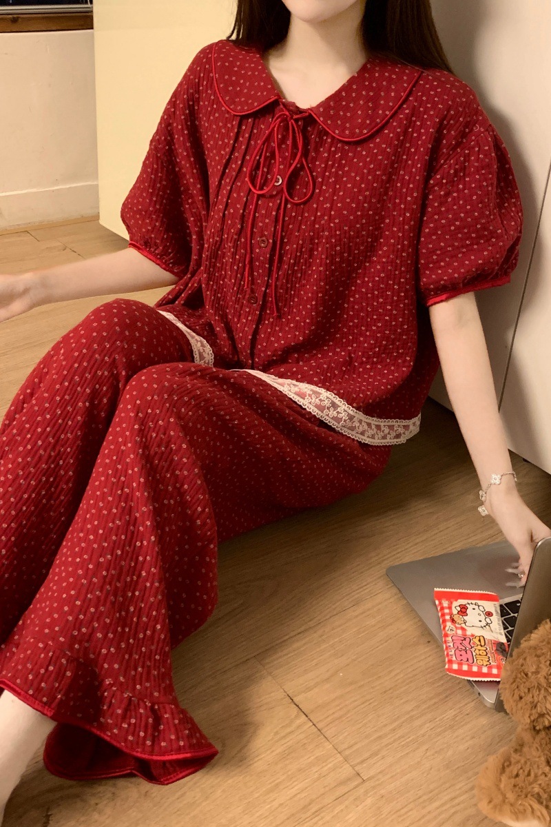 잠옷 여성 2025 한국 달콤한 신선한 느슨한 통기성 소프트 코튼 더블 원사 여름 짧은 소매 겉옷 홈 세트스토어 가기