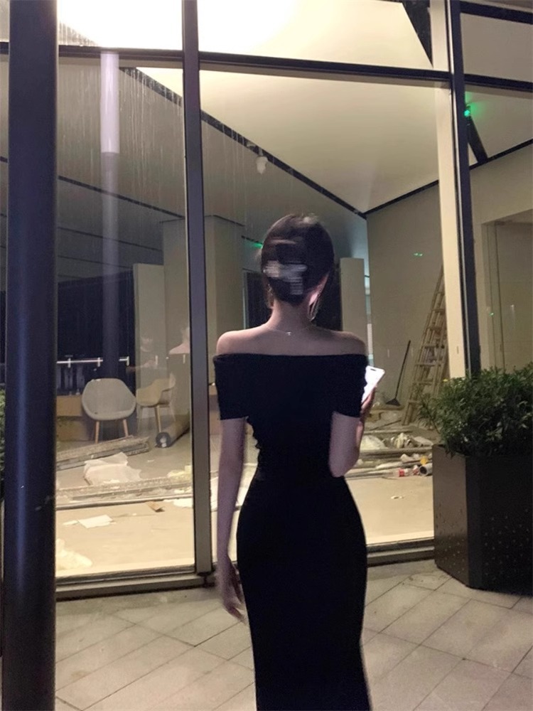 Gao Leng Yujie, 검은 색 한 캐릭터 칼라 원피스 여성 여름 우아한 슬림핏 슬리밍 긴 원피스 입고 허리와 엉덩이