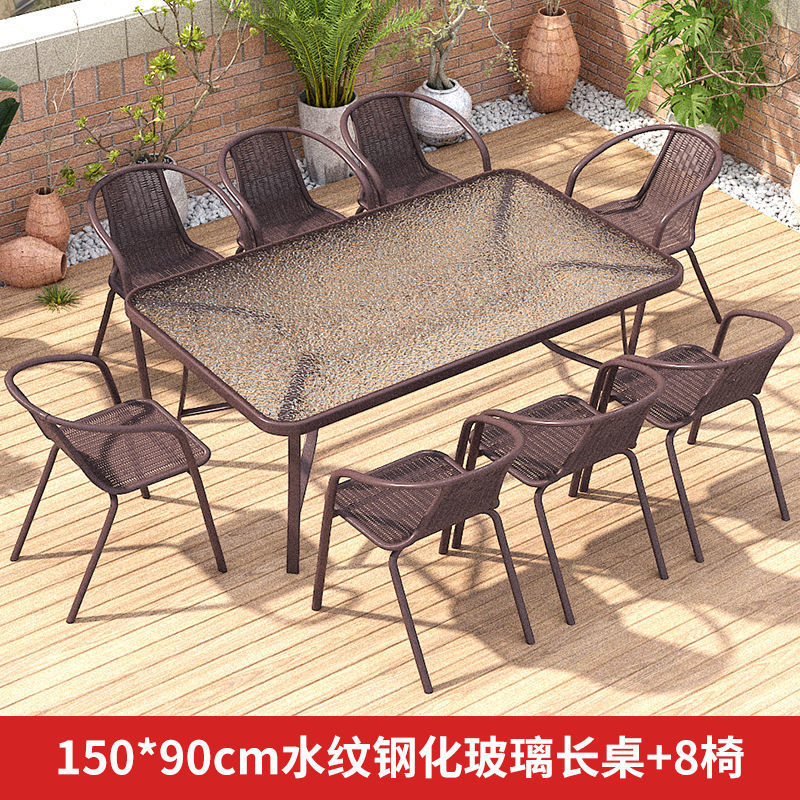 • 150x90 직사각형 테이블 + 의자 8개 + 이중 상단 중앙 기둥 우산
