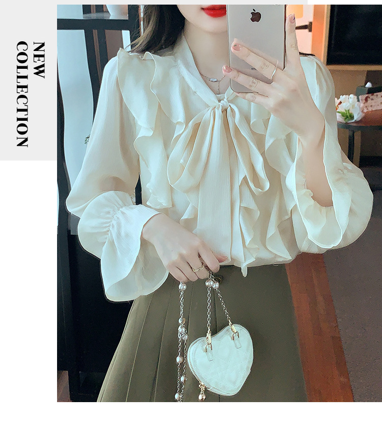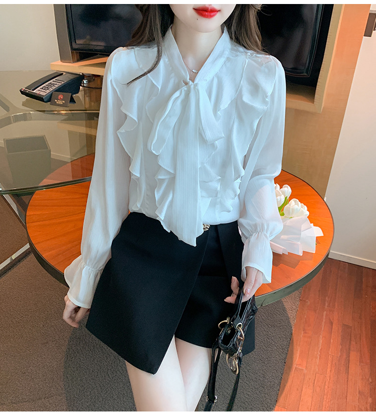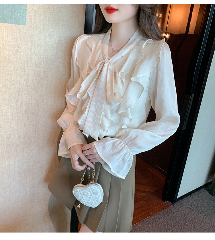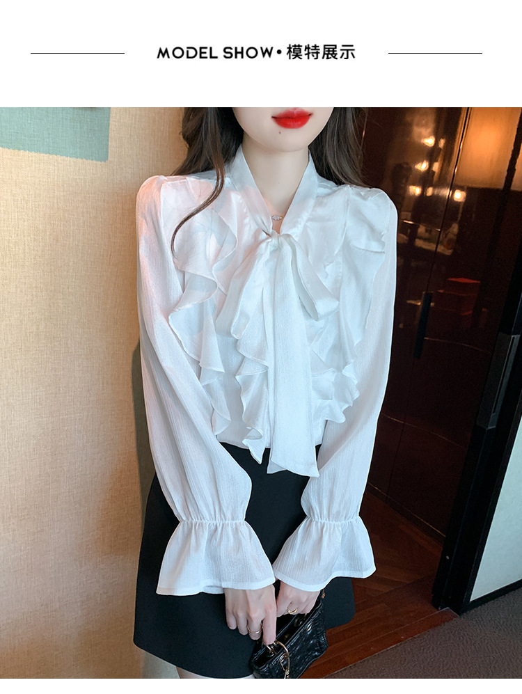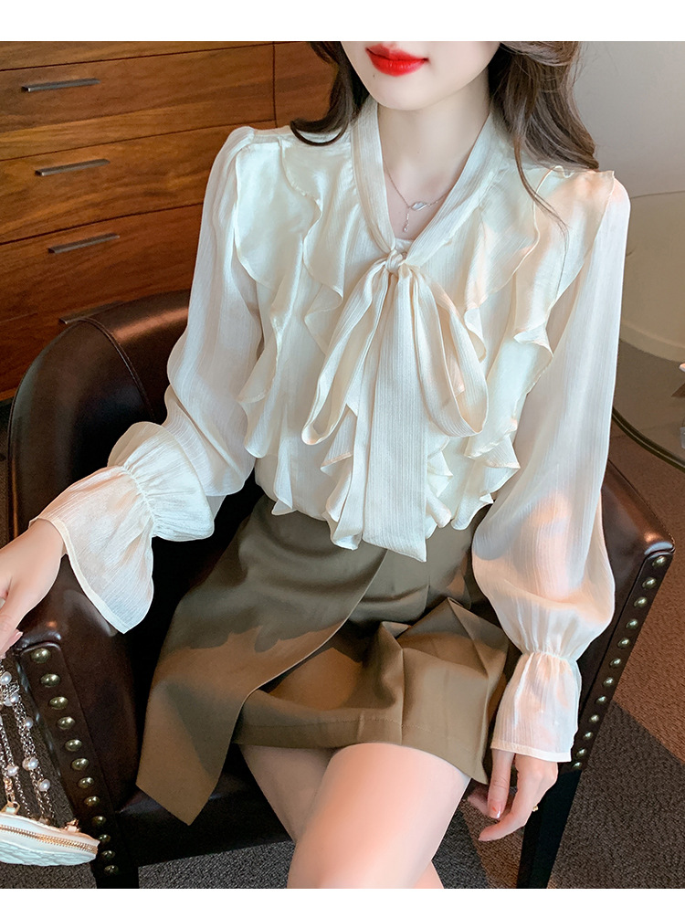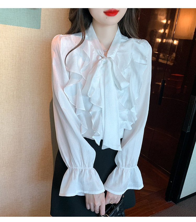 여성을위한 프렌치 러플 연령 감소 루즈 쉬폰 셔츠 2025 봄 달콤한 기질 보우 다용도 긴팔 탑