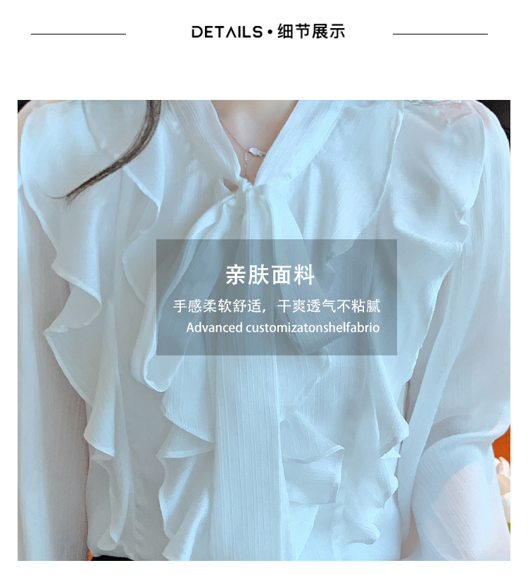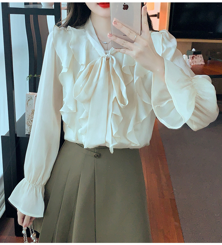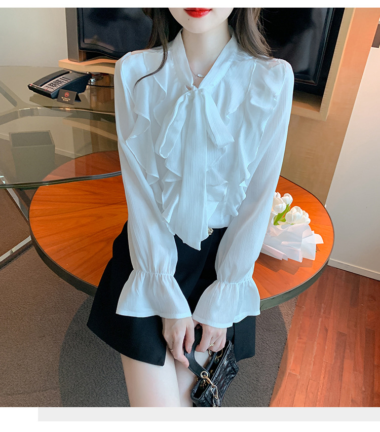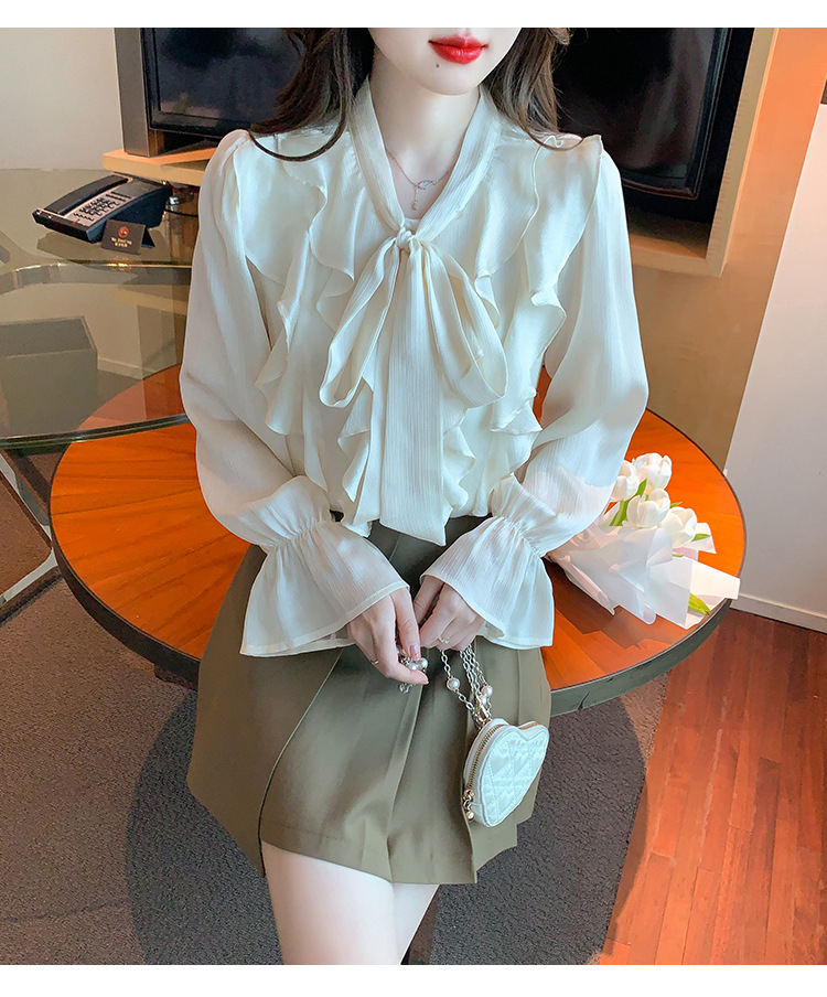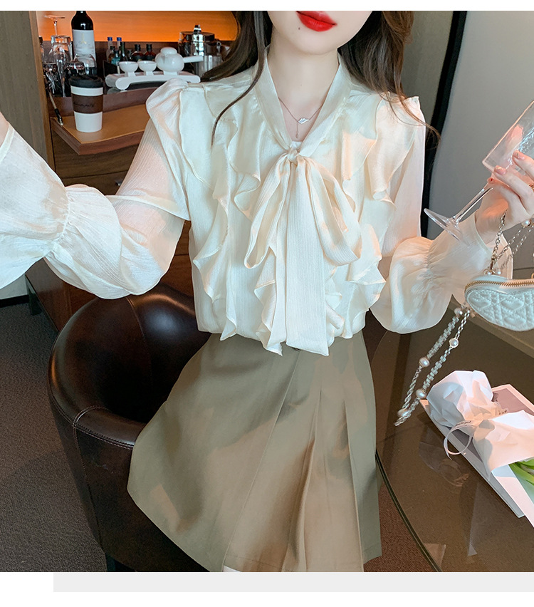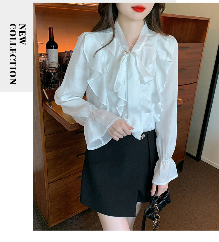 여성을위한 프렌치 러플 연령 감소 루즈 쉬폰 셔츠 2025 봄 달콤한 기질 보우 다용도 긴팔 탑