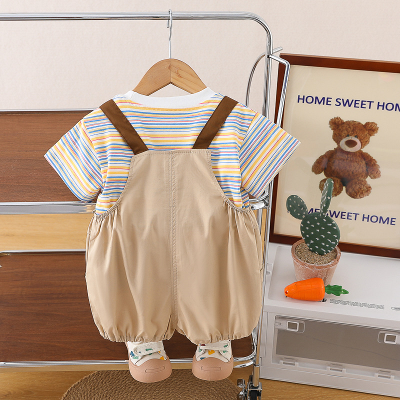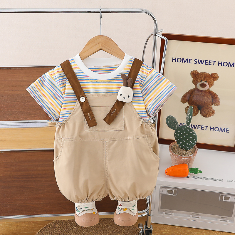 남자 아기 2024 새로운 귀여운 캐주얼 얇은 여름 세트 아기 어린이 멋진 인형 토끼 스트랩 짧은 소매
