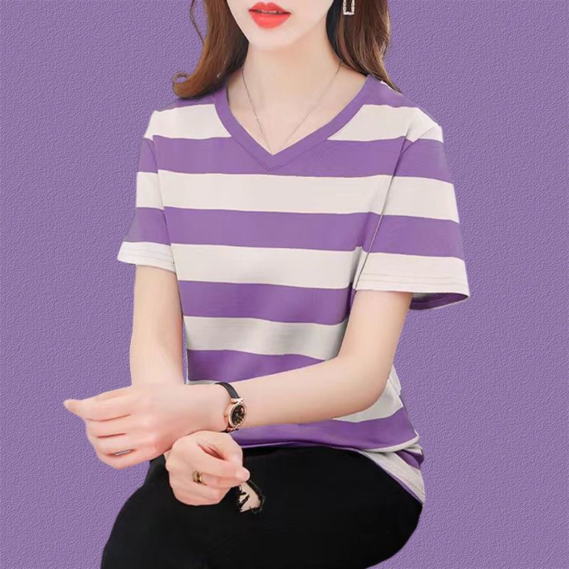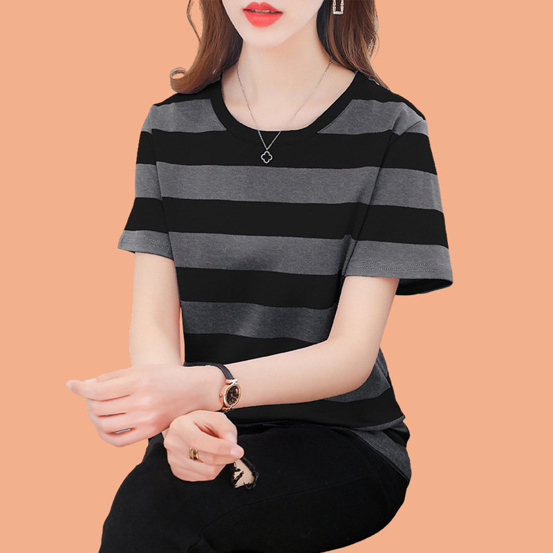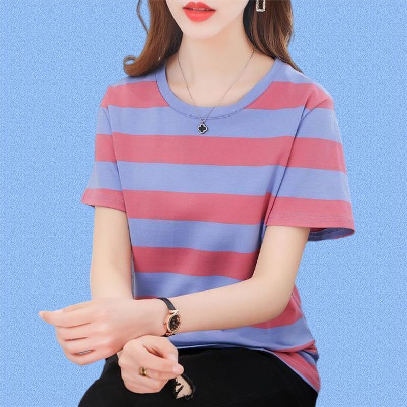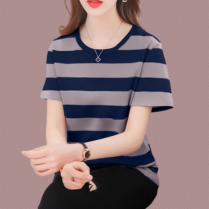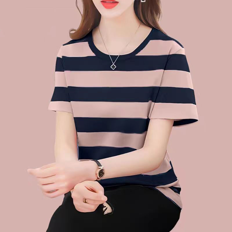 코튼 스트라이프 셔츠 여성의 짧은 소매 2024 새로운 플러스 사이즈 여성의 여름 느슨한 중년 어머니 여성의 탑