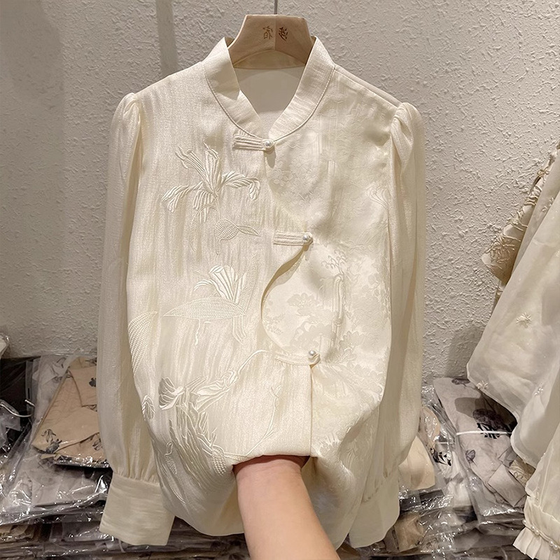 2025 봄과 가을 새로운 레트로 새로운 중국 스타일 버튼 칼라 긴 소매 쉬폰 셔츠 여성용 하이 엔드 자카드 탑스토어 가기
