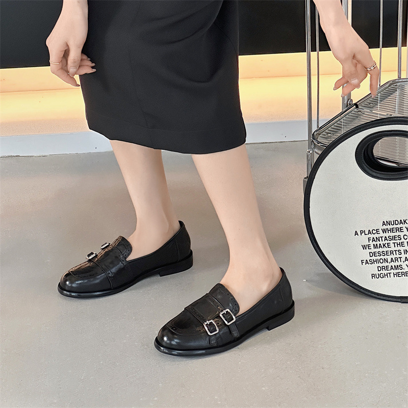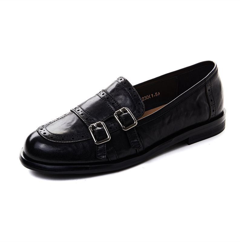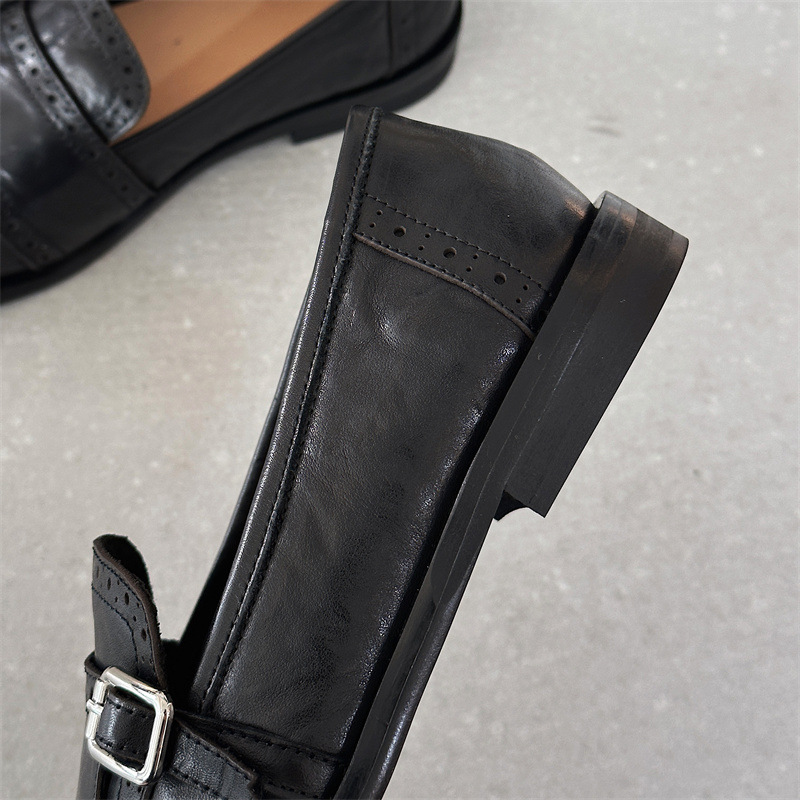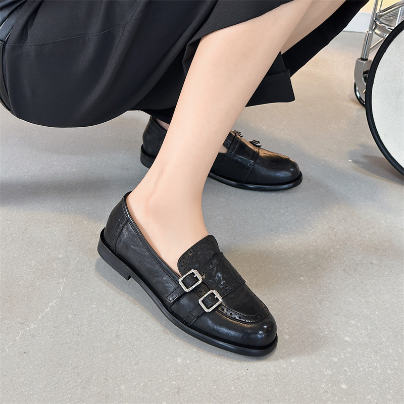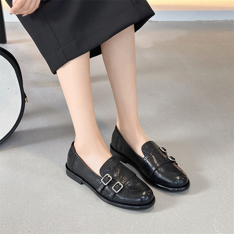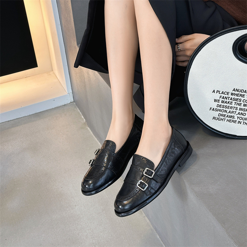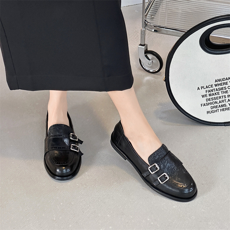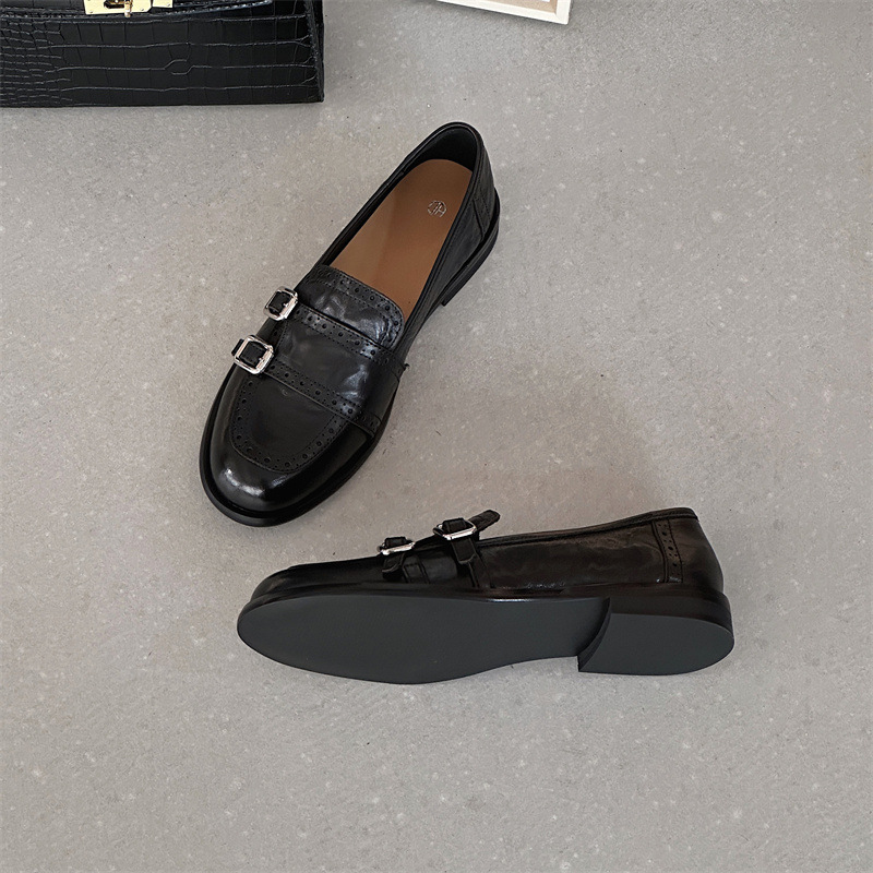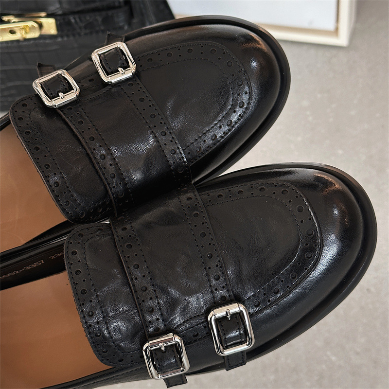 나비 O 더블 가죽 버클 패션 신발 여성의 2025 봄 새로운 Cowhide 플랫 숙녀 캐주얼 작은 가죽 신발 여성 신발